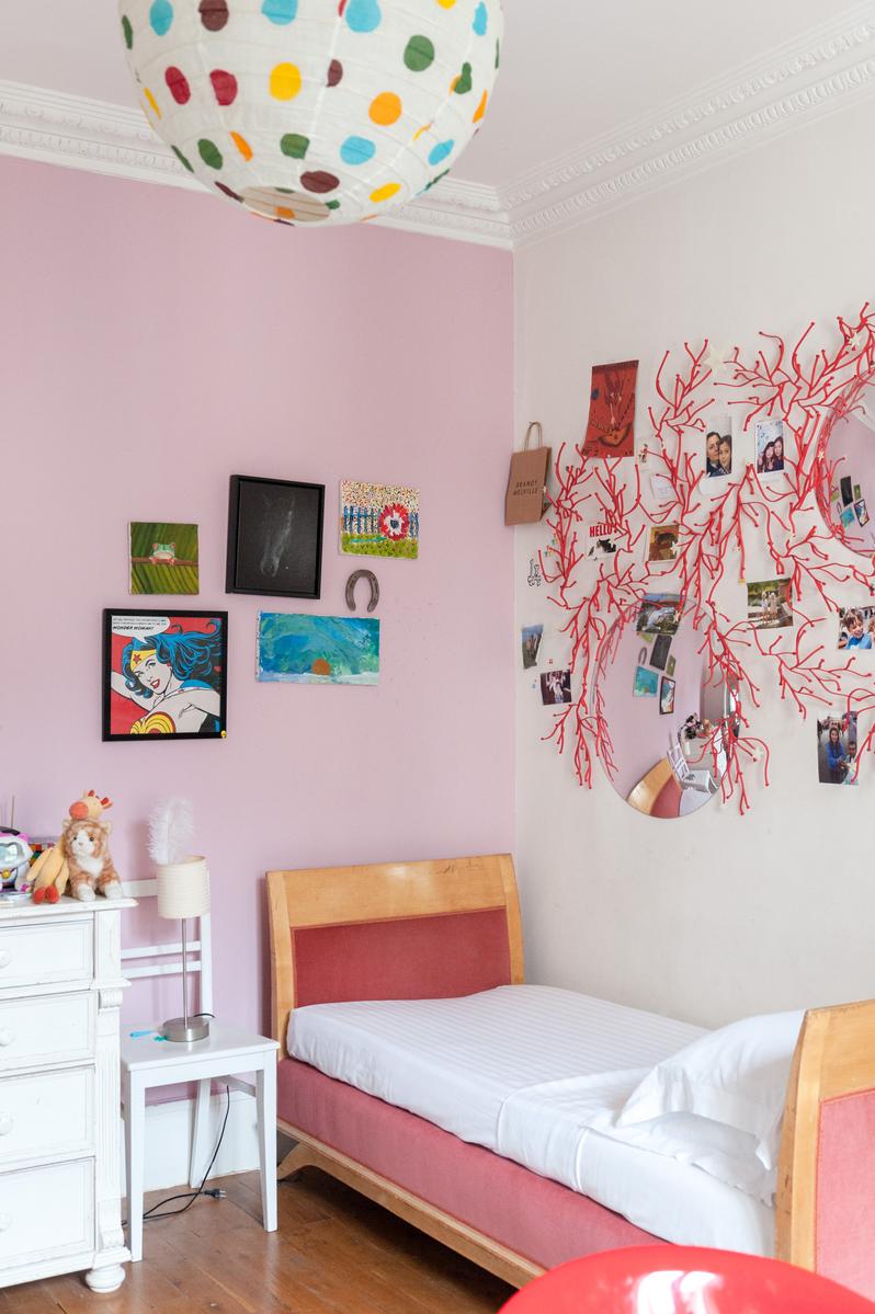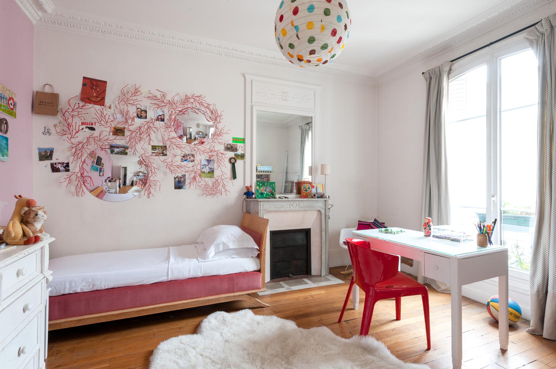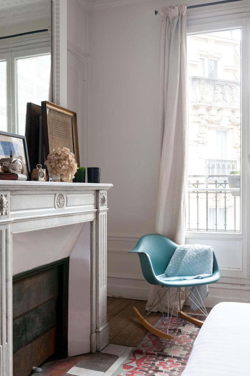 One door down, a sitting room is piled high with paintings, sculptures and patterned rugs. The François Bauchet-designed kitchen is straight ahead, where colour-blocked panels and geometric tiles make a bold statement beside eclectic chairs. Next to the kitchen is a compact master bedroom with a molded plastic rocker and adjacent bath. A child’s bedroom is just down the hall, brimming with fanciful figures from Wonder Woman to Pegasus. And those pretty Juliet balustrades border windows in every room except the kitchen.