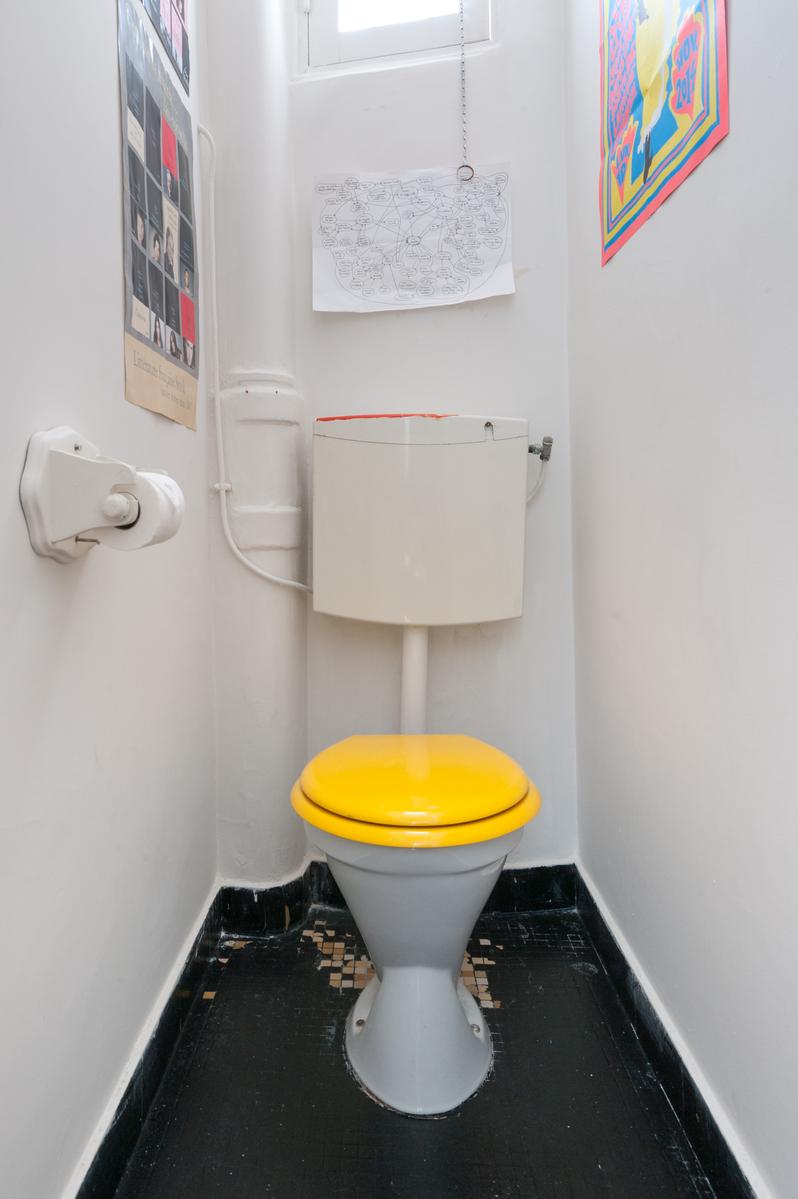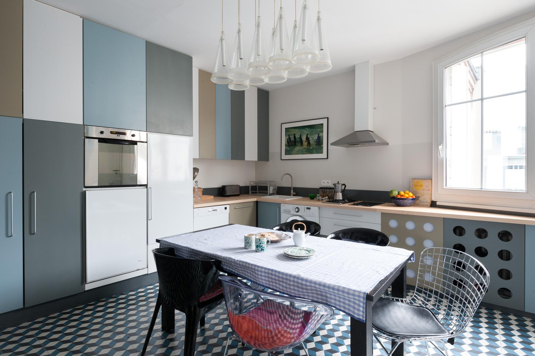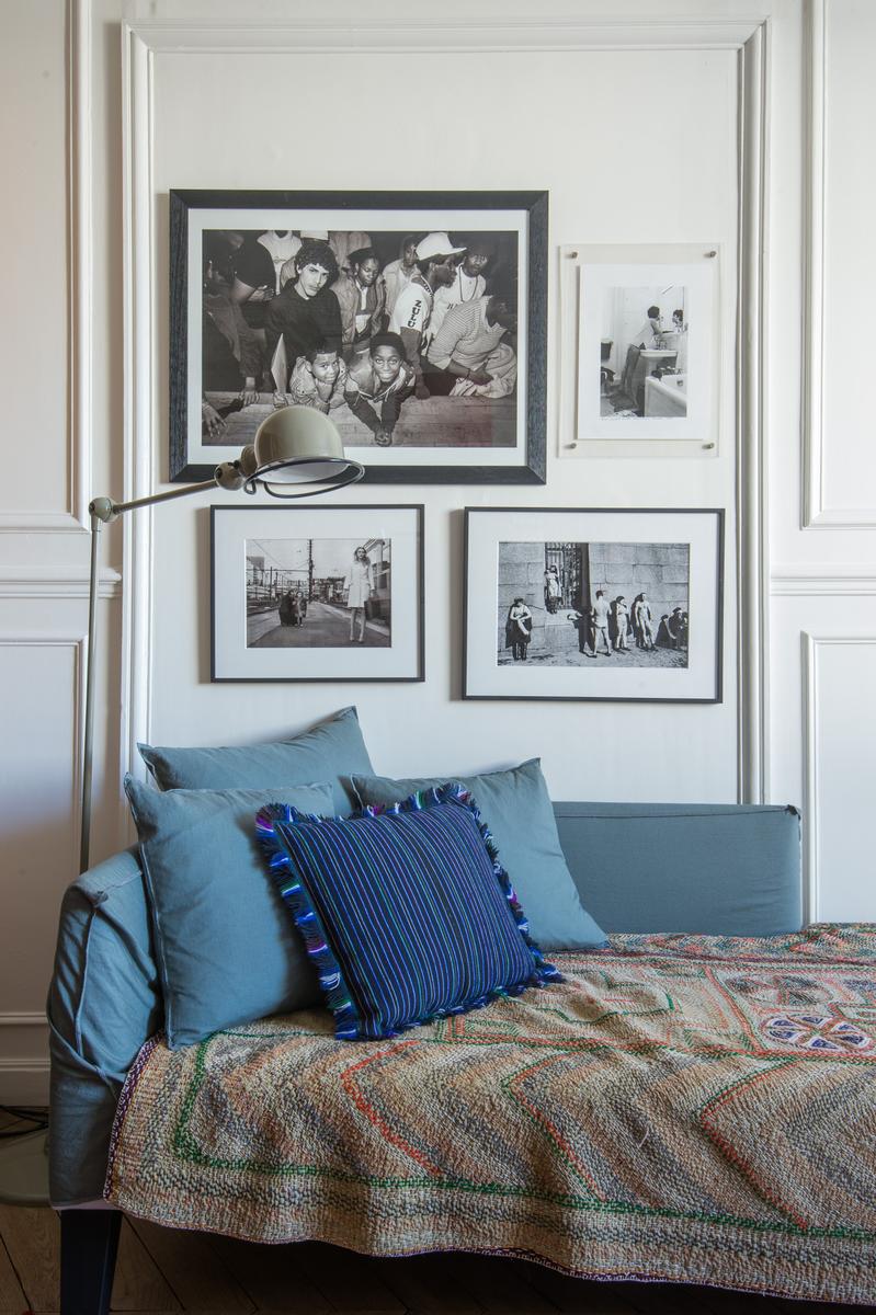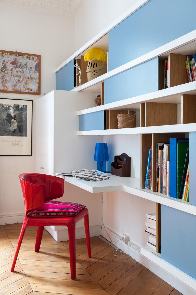 One door down, a sitting room is piled high with paintings, sculptures and patterned rugs. The François Bauchet-designed kitchen is straight ahead, where colour-blocked panels and geometric tiles make a bold statement beside eclectic chairs. Next to the kitchen is a compact master bedroom with a molded plastic rocker and adjacent bath. A child’s bedroom is just down the hall, brimming with fanciful figures from Wonder Woman to Pegasus. And those pretty Juliet balustrades border windows in every room except the kitchen.