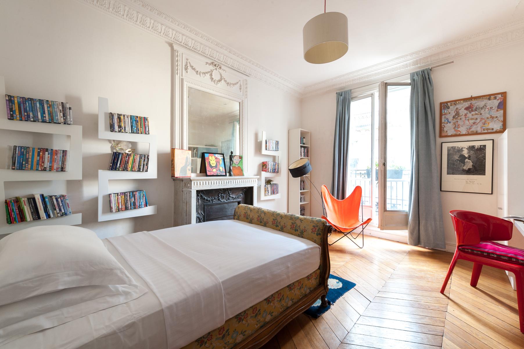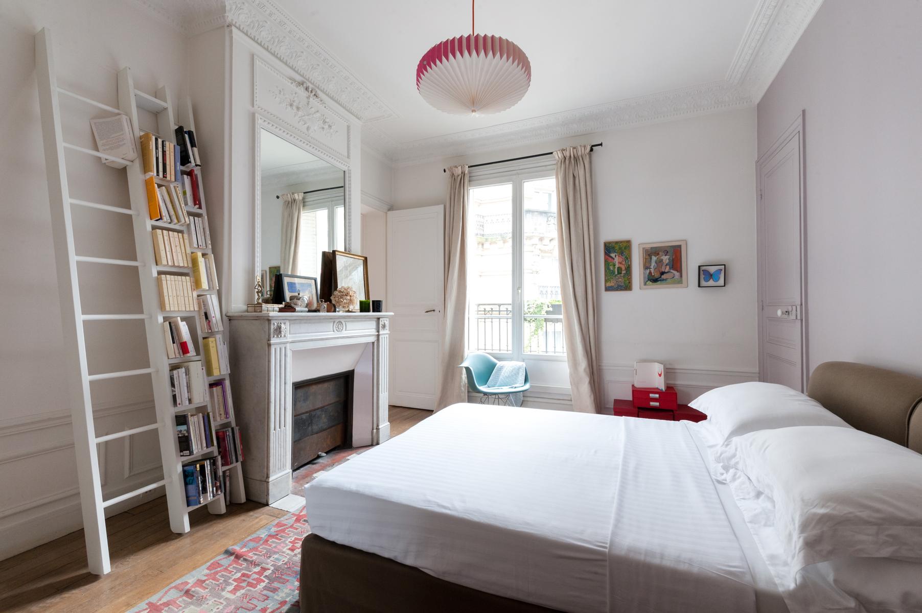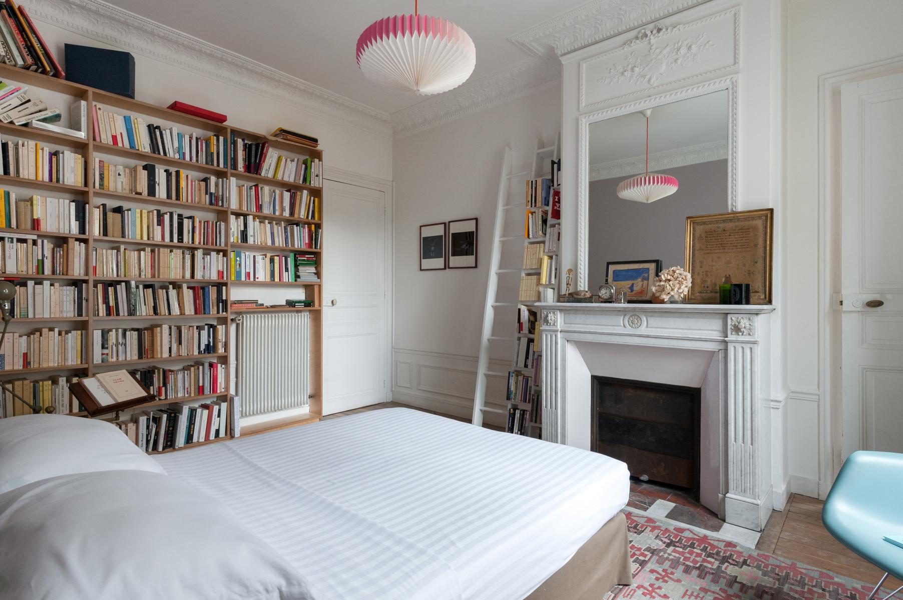 On the fifth and top floor of a typically Parisian building in Saint-Germain-des-Prés (picture a charming stone façade with ornate Juliet balconies), Rue Péguy is full with stories. Books fill every room, collected by your literary host and stacked on shelves, ladders – even a nook behind the bathtub. As you enter the front hall, you’ll find a bright bedroom to your left with a built-in desk and floral bed frame.