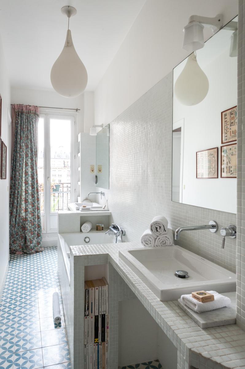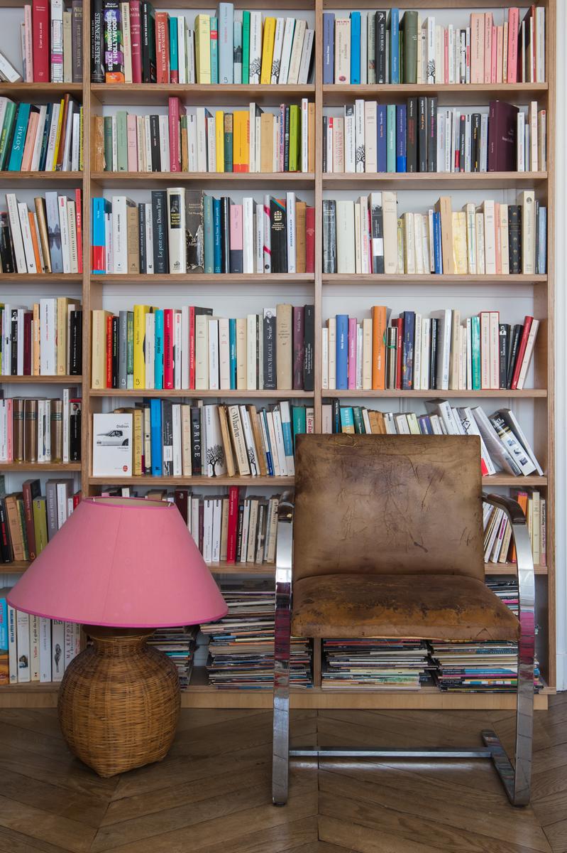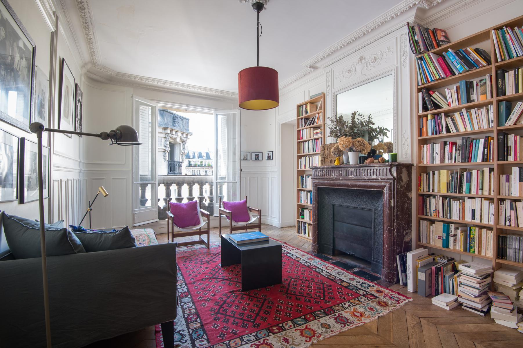 On the fifth and top floor of a typically Parisian building in Saint-Germain-des-Prés (picture a charming stone façade with ornate Juliet balconies), Rue Péguy is full with stories. Books fill every room, collected by your literary host and stacked on shelves, ladders – even a nook behind the bathtub. As you enter the front hall, you’ll find a bright bedroom to your left with a built-in desk and floral bed frame.