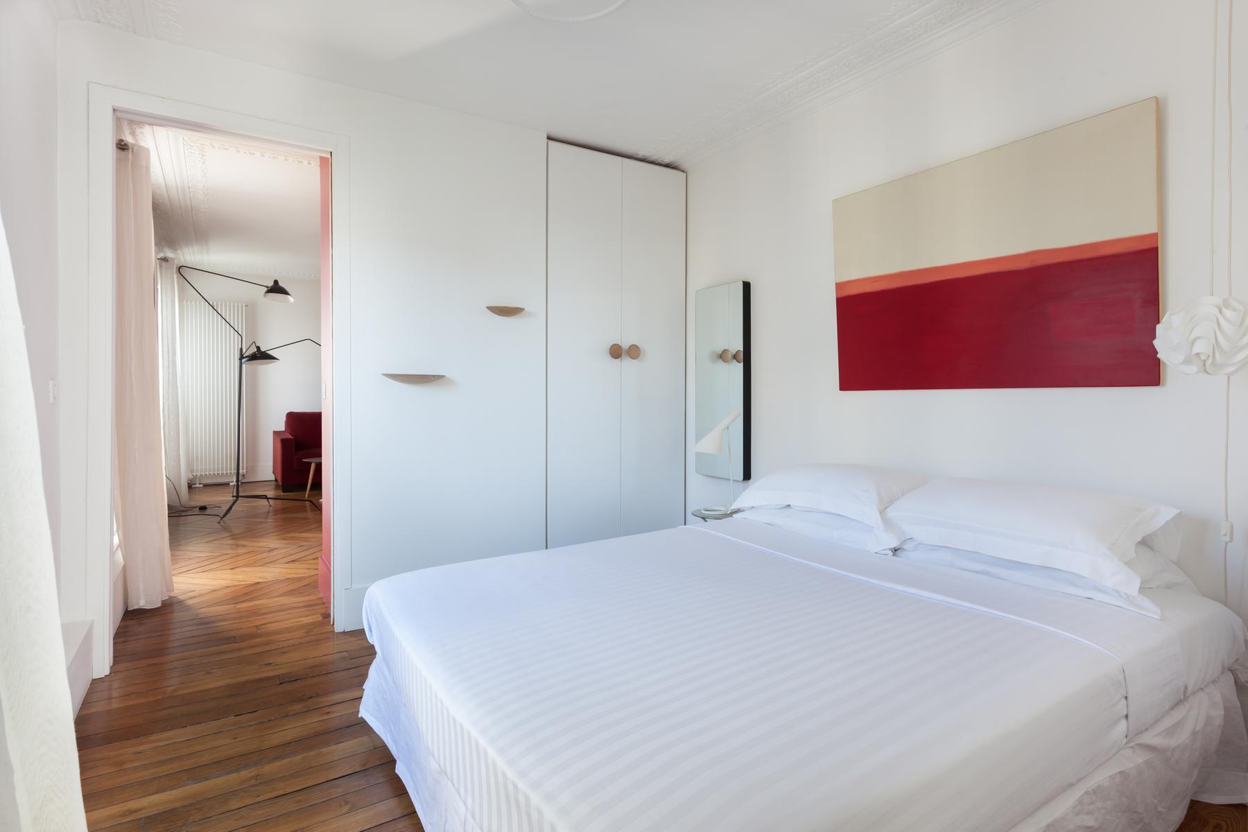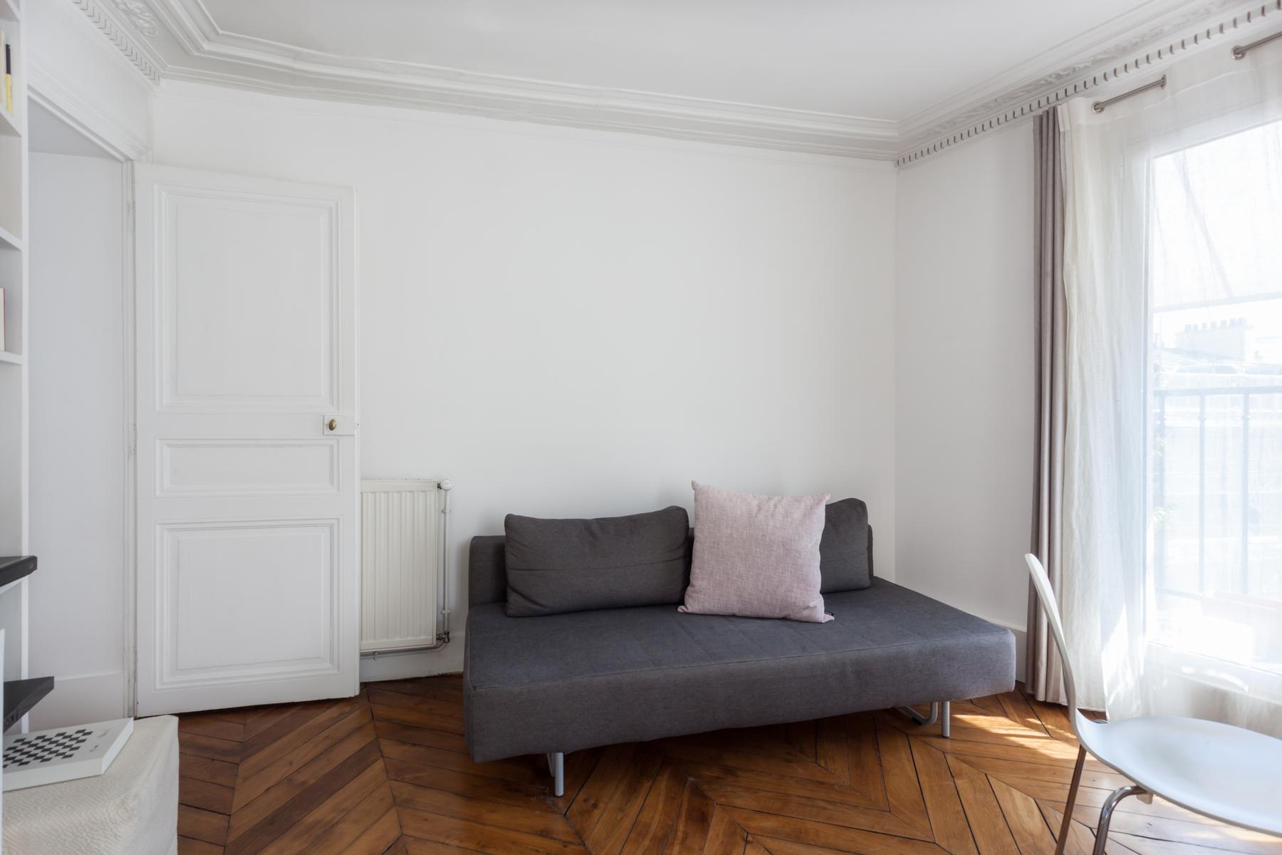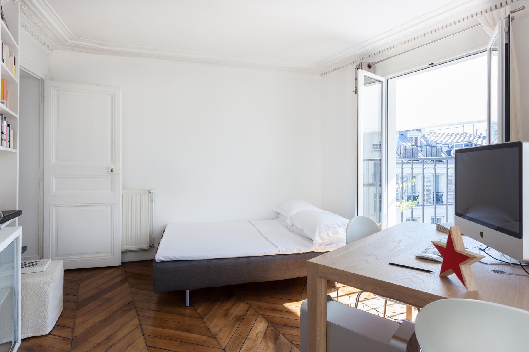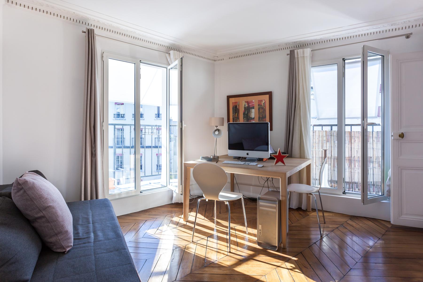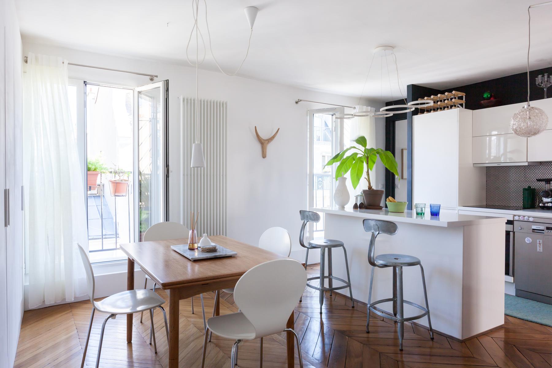 Montmartre – South Pigalle est une partie animée de Paris, mais à l’intérieur de cette maison du cinquième étage, tout est calme. Vous entrez dans un petit couloir, où vous trouverez la cuisine sur la gauche. Bien qu’intelligent, cet espace blanc lumineux est aussi invitant – il y a une table à manger en bois à l’extrémité proche, et un bar de petit-déjeuner soigné, éclairé par un lustre gracieux, au-delà. Par une porte d’entrée, vous trouverez un deuxième couloir qui mène à un bureau serein avec un canapé-lit.