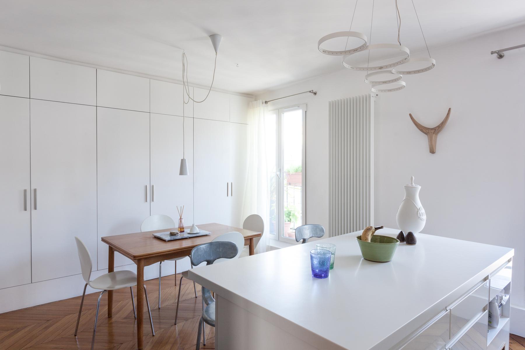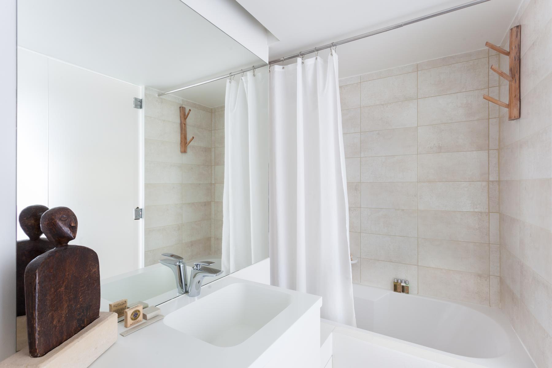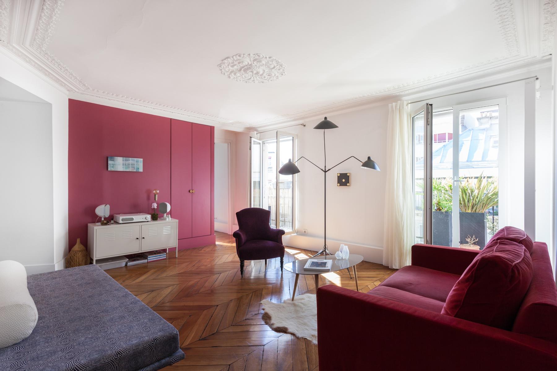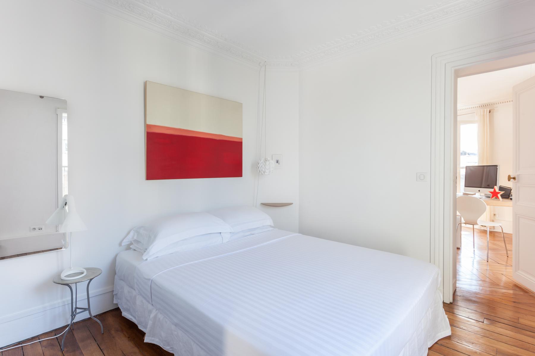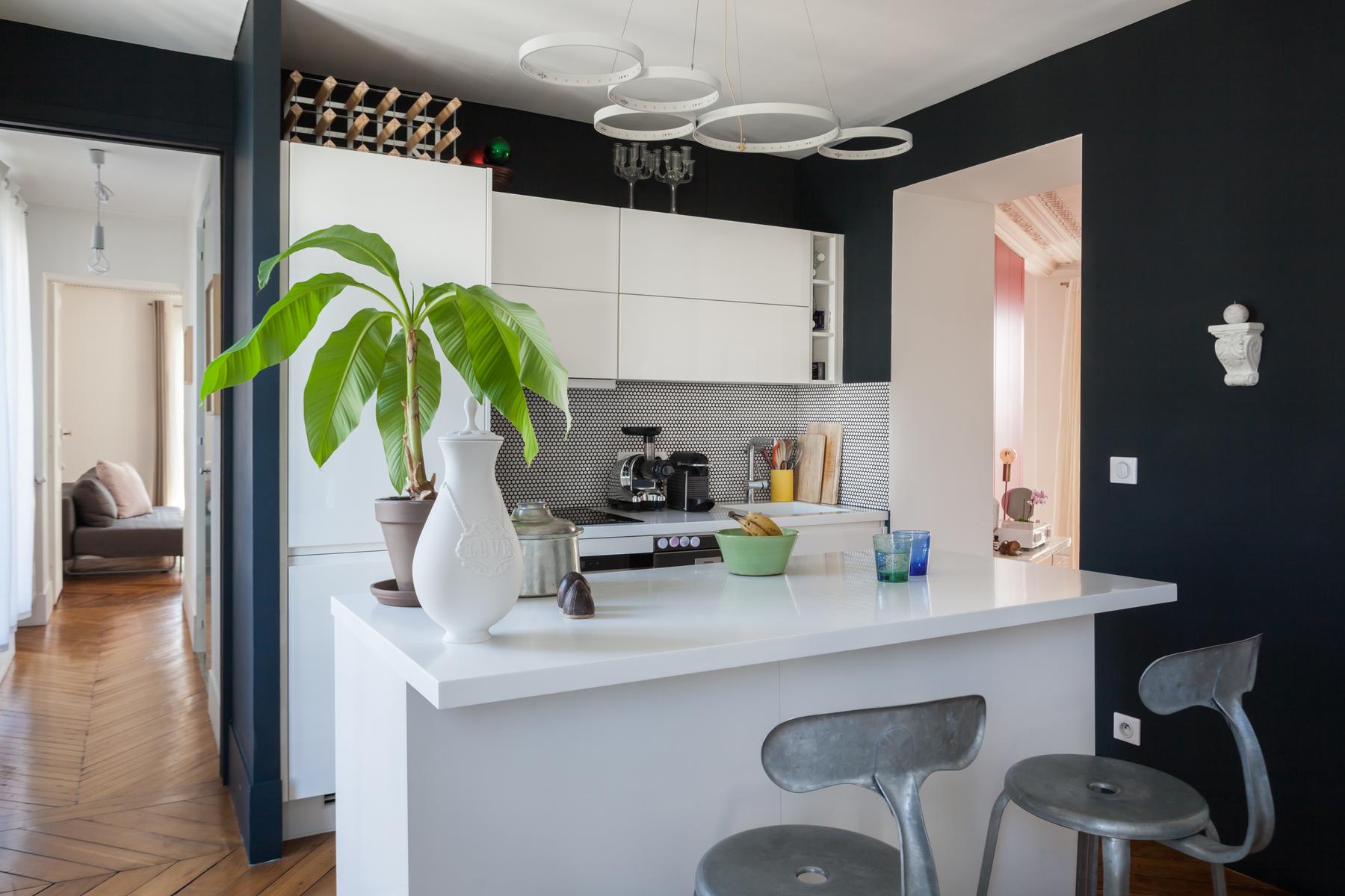 Montmartre – South Pigalle est une partie animée de Paris, mais à l’intérieur de cette maison du cinquième étage, tout est calme. Vous entrez dans un petit couloir, où vous trouverez la cuisine sur la gauche. Bien qu’intelligent, cet espace blanc lumineux est aussi invitant – il y a une table à manger en bois à l’extrémité proche, et un bar de petit-déjeuner soigné, éclairé par un lustre gracieux, au-delà. Par une porte d’entrée, vous trouverez un deuxième couloir qui mène à un bureau serein avec un canapé-lit.