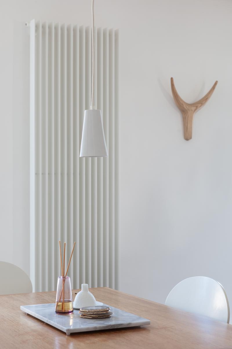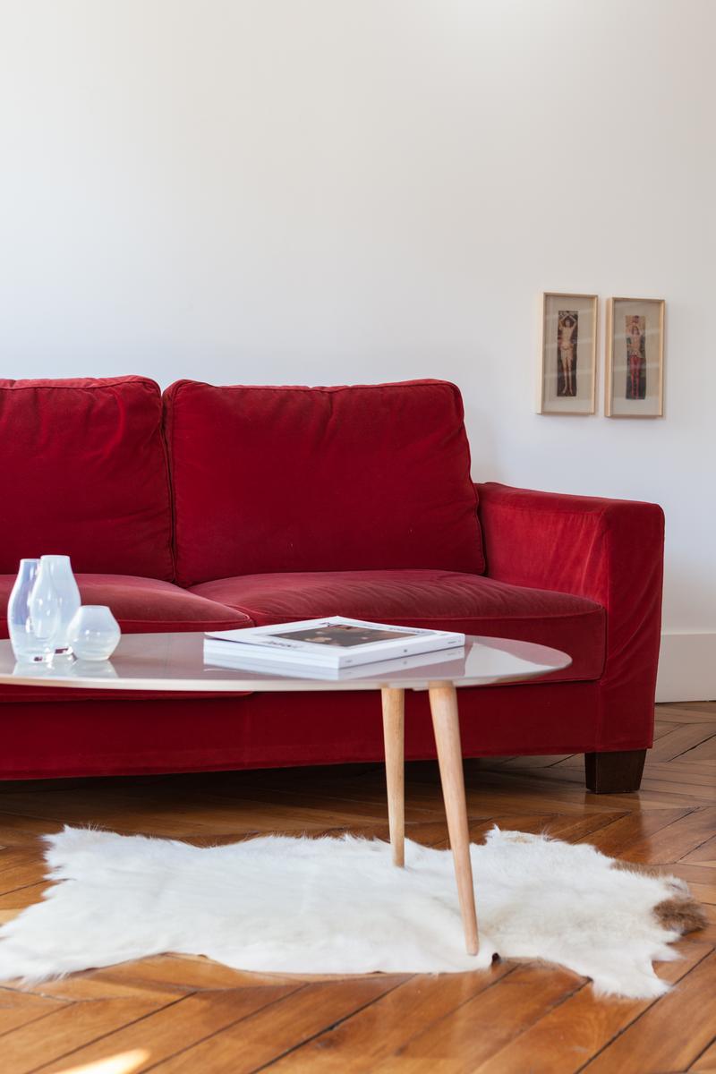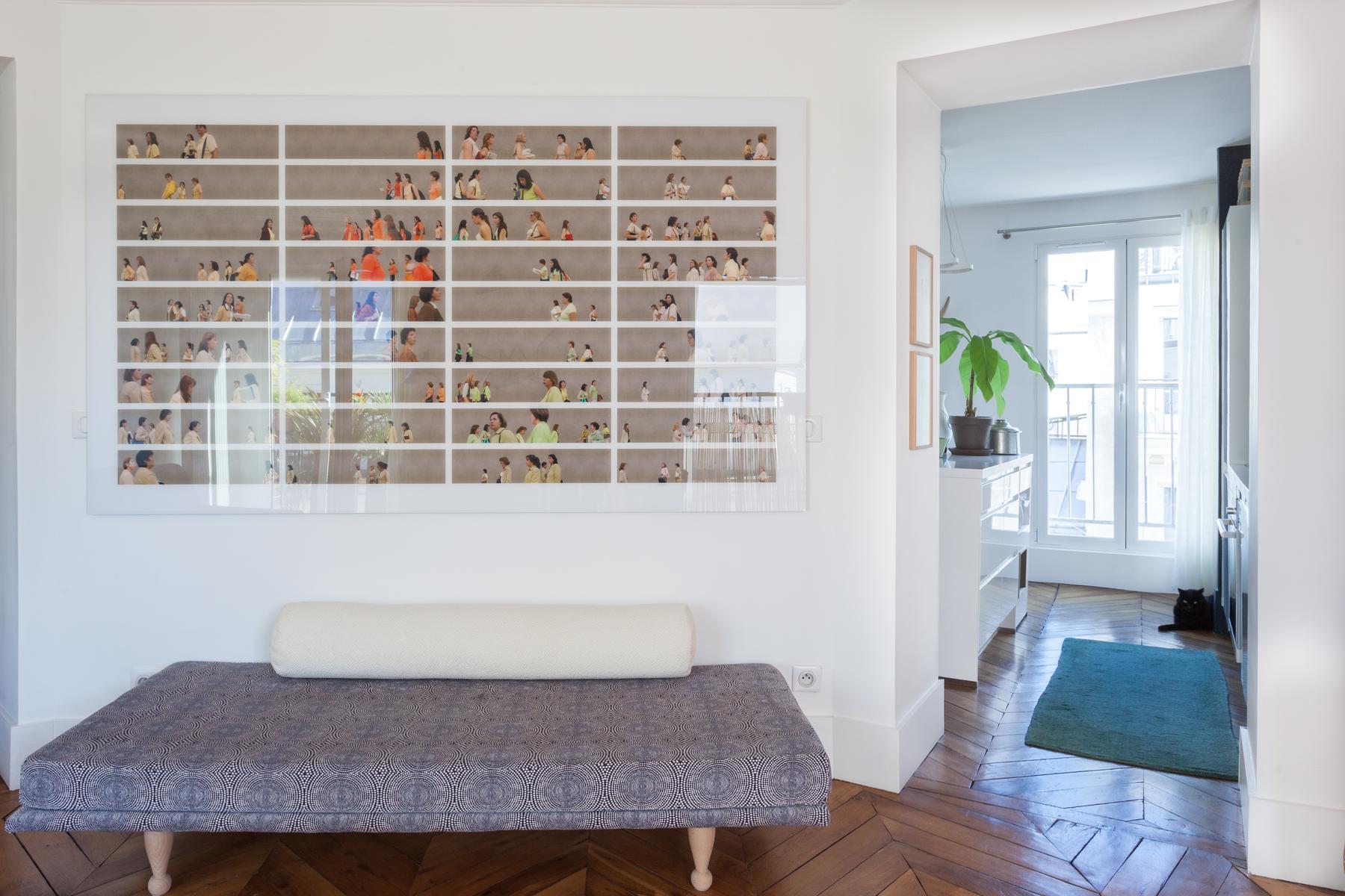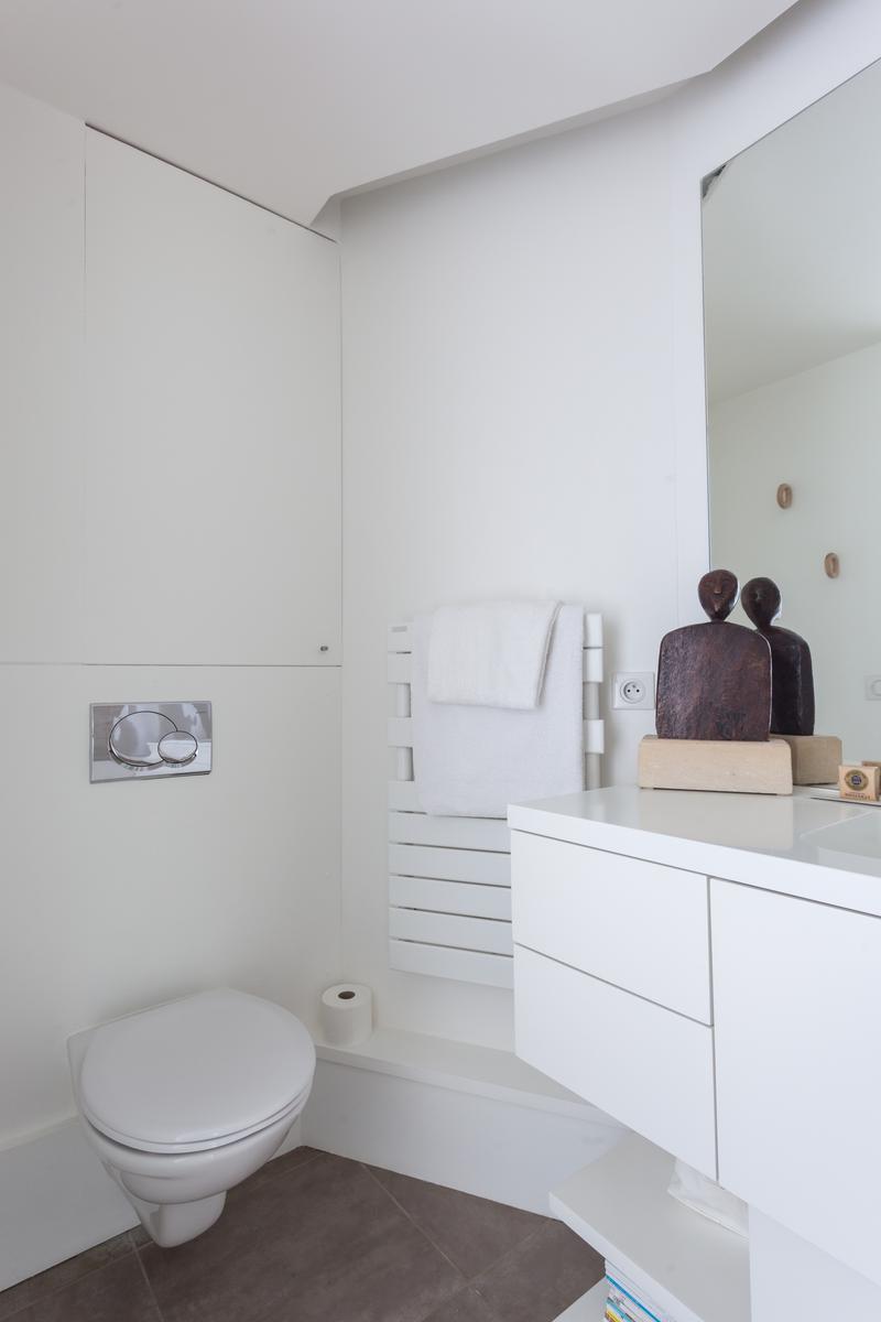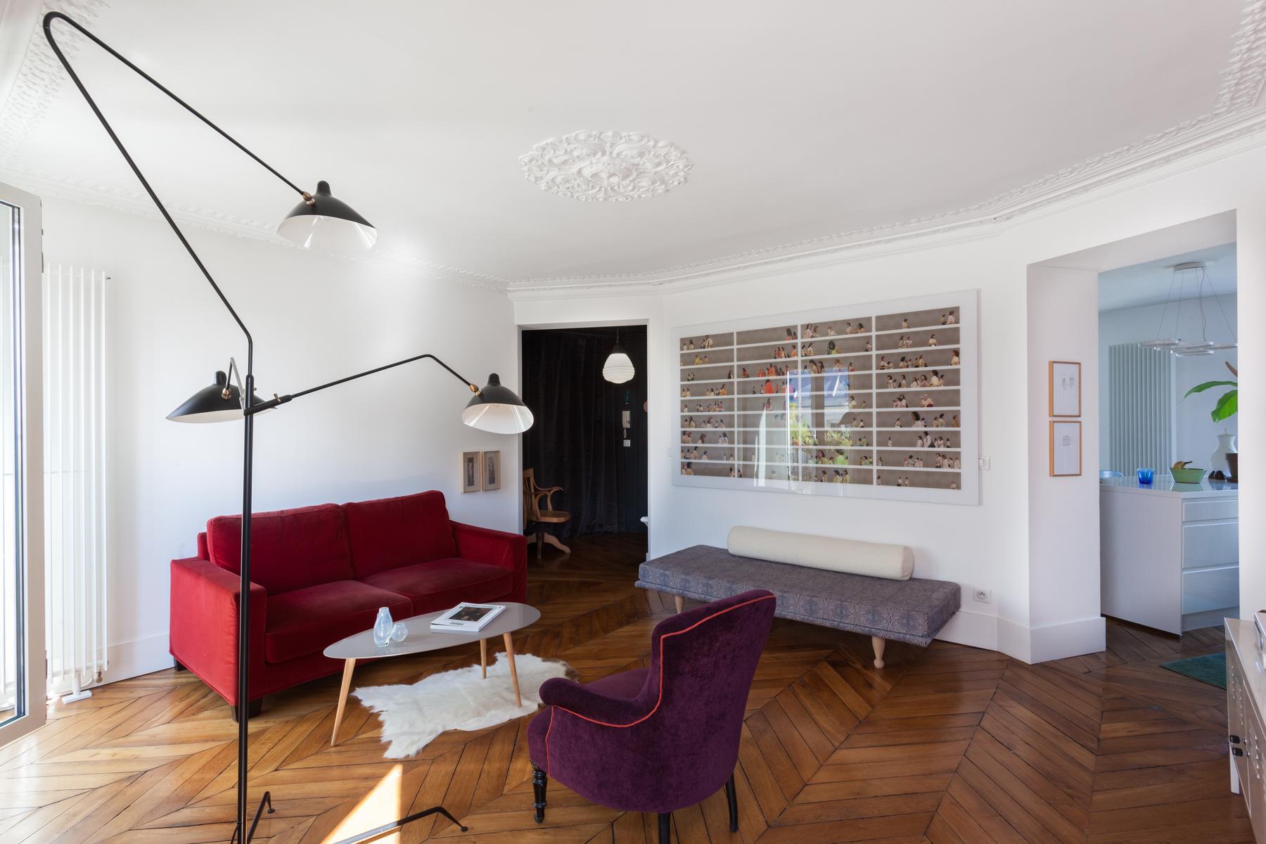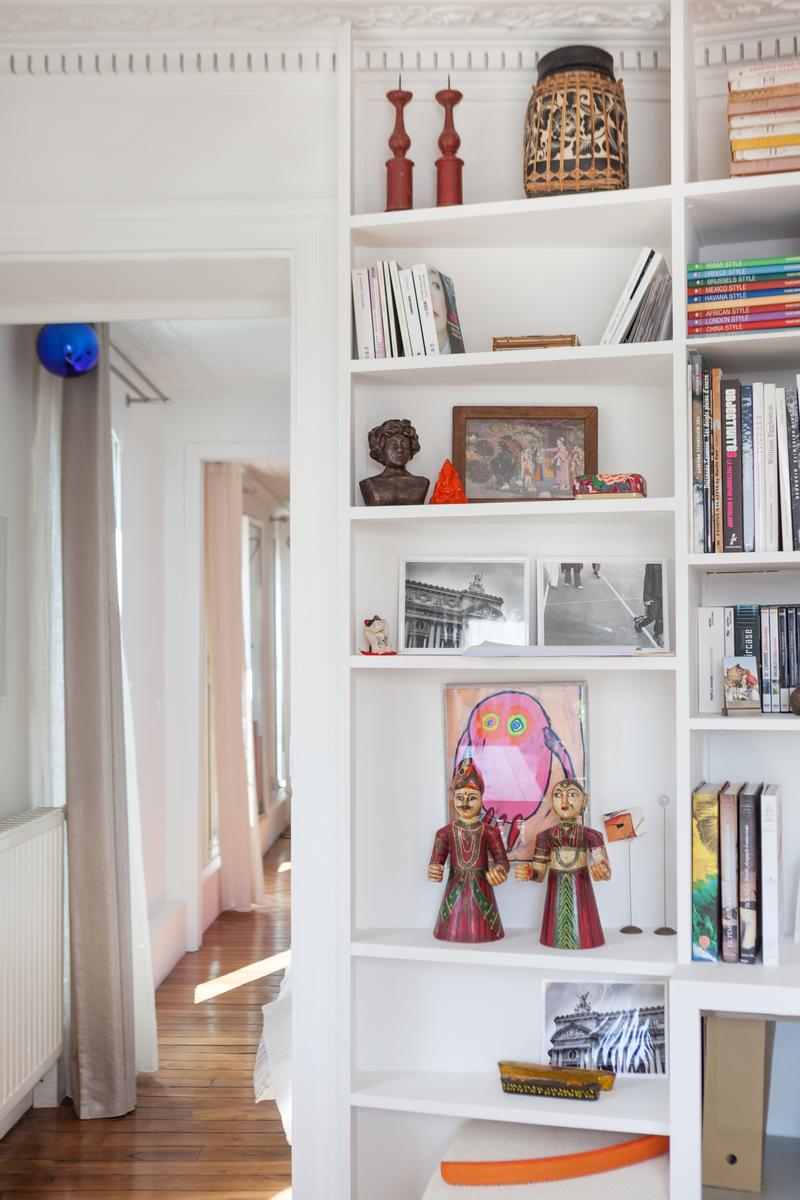 Montmartre – South Pigalle est une partie animée de Paris, mais à l’intérieur de cette maison du cinquième étage, tout est calme. Vous entrez dans un petit couloir, où vous trouverez la cuisine sur la gauche. Bien qu’intelligent, cet espace blanc lumineux est aussi invitant – il y a une table à manger en bois à l’extrémité proche, et un bar de petit-déjeuner soigné, éclairé par un lustre gracieux, au-delà. Par une porte d’entrée, vous trouverez un deuxième couloir qui mène à un bureau serein avec un canapé-lit.