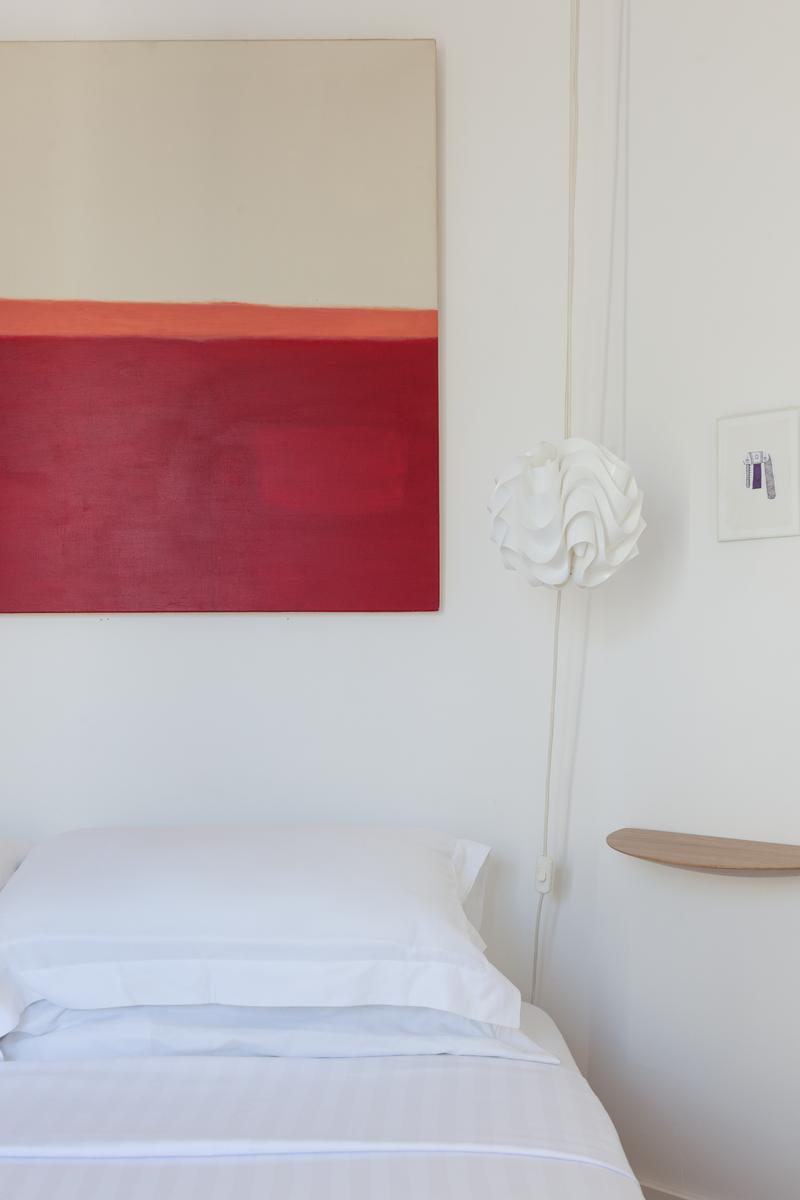 Puis, à droite du hall d’entrée, il y a le salon. Des canapés doux et des tables d’appoint délicates sont assis sur le parquet de cette pièce, et de charmantes œuvres d’art sont accrochées sur ses murs rose rose et blanc (la toile de la scène de foule est particulièrement accrocheuse). La porte de droite vous conduit à la chambre principale – subtilement élégante – tandis que les deux fenêtres s’ouvrent sur un long balcon.