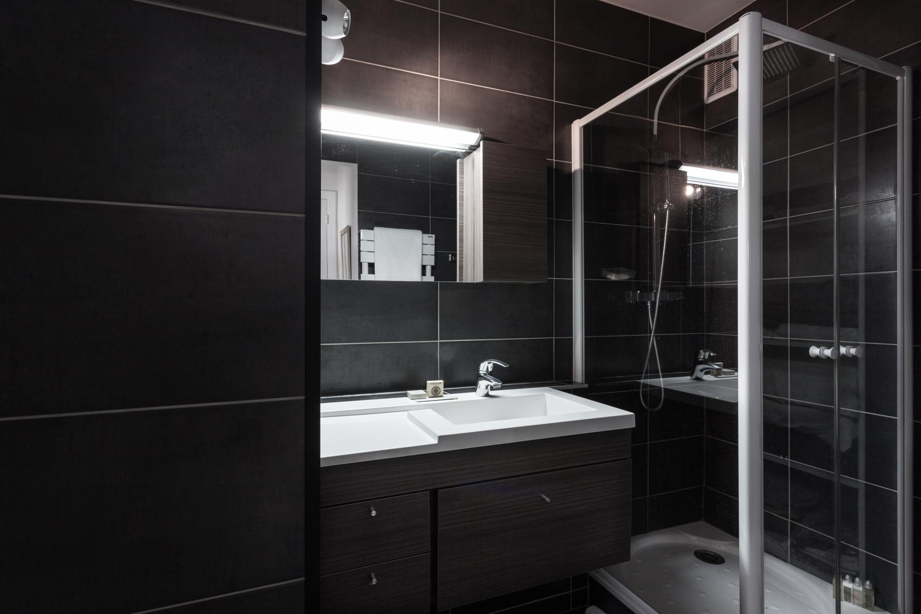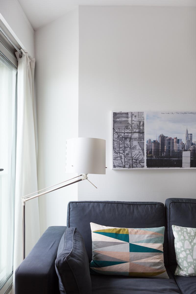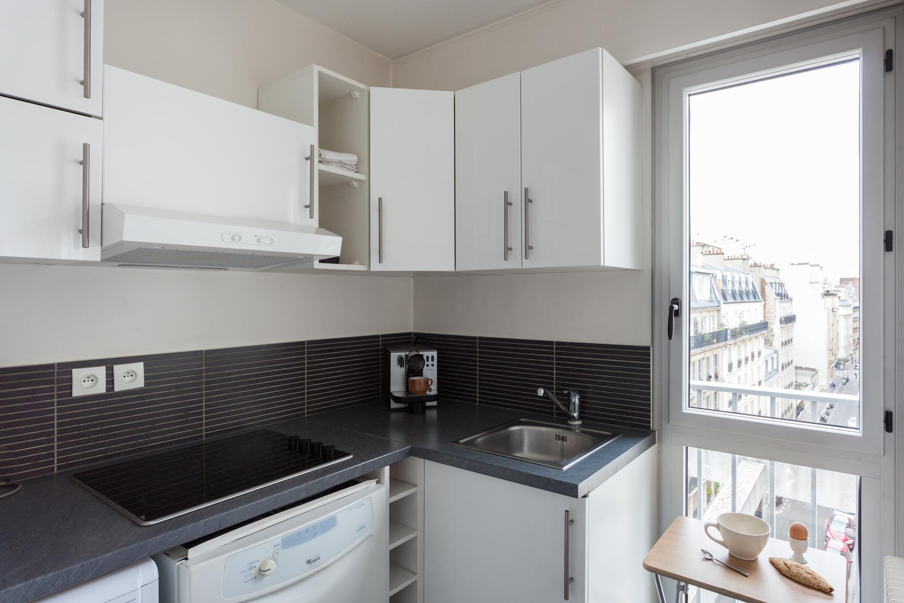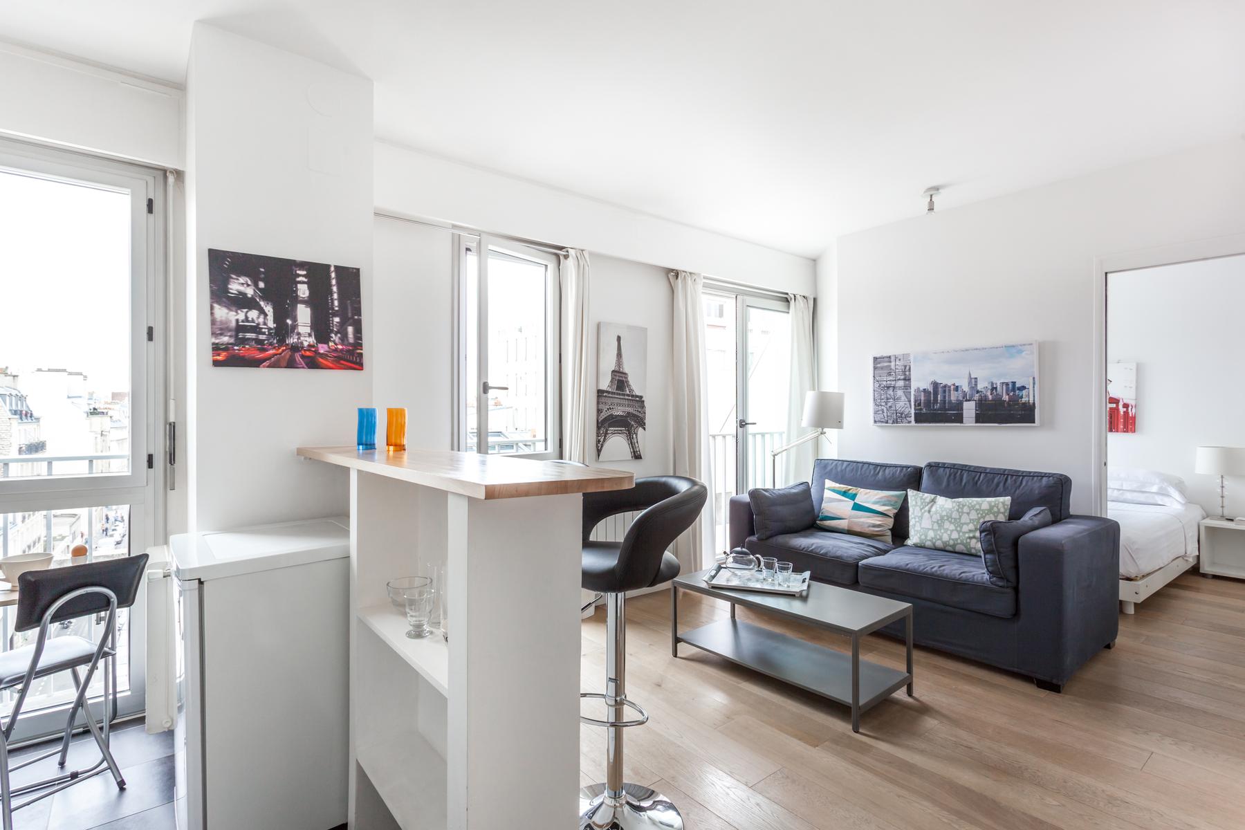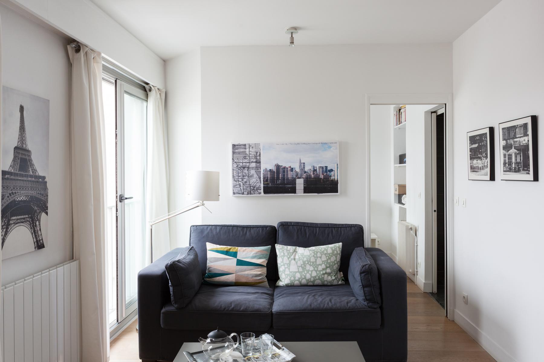Sur une rue particulièrement chic du Parc Monceau, vous trouverez cette maison au sixième étage. La porte d’entrée mène directement à l’espace de vie ouvert, une pièce au sol en bois avec trois longues fenêtres donnant sur les toits de la ville. A l’extrémité proche se trouve la cuisine, un espace modish (et monochrome) avec un bar blanc pour le petit-déjeuner et des tabourets noirs. En face, il y a le coin salon compact, son canapé gris clair et sa table basse discrète entourée de paysages urbains en noir et blanc.