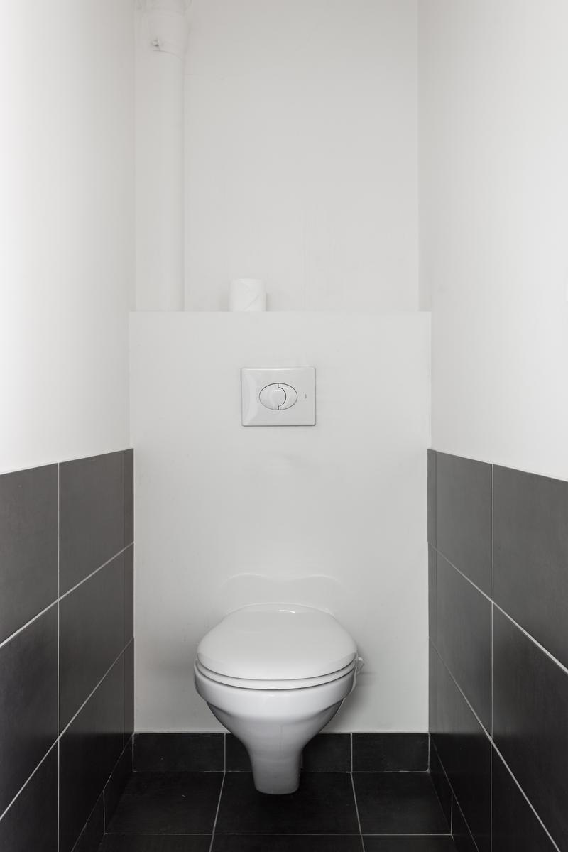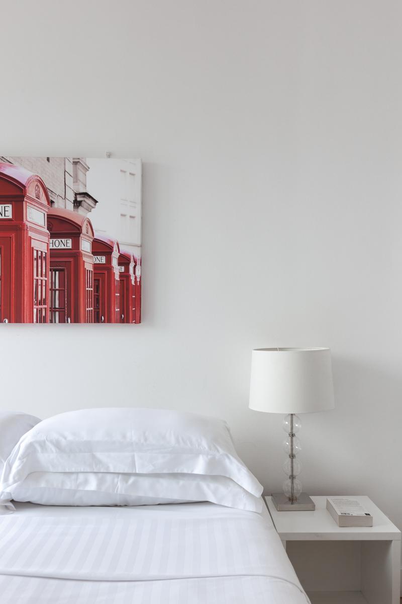 La porte mène à la dernière pièce de cette maison – la chambre à coucher principale. La salle de bains et les toilettes séparées (juste à droite de l’entrée) sont toutes deux carrelées en noir de jais. En revanche, la chambre à coucher elle-même est entièrement en blanc – des simples rideaux aux lampes de chevet classiques – mais pour une impression de cabine téléphonique rouge qui est suspendue au-dessus du lit.