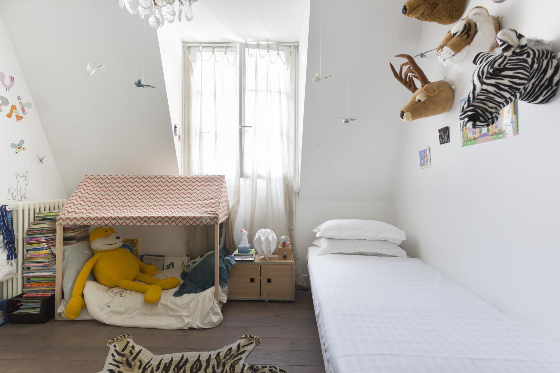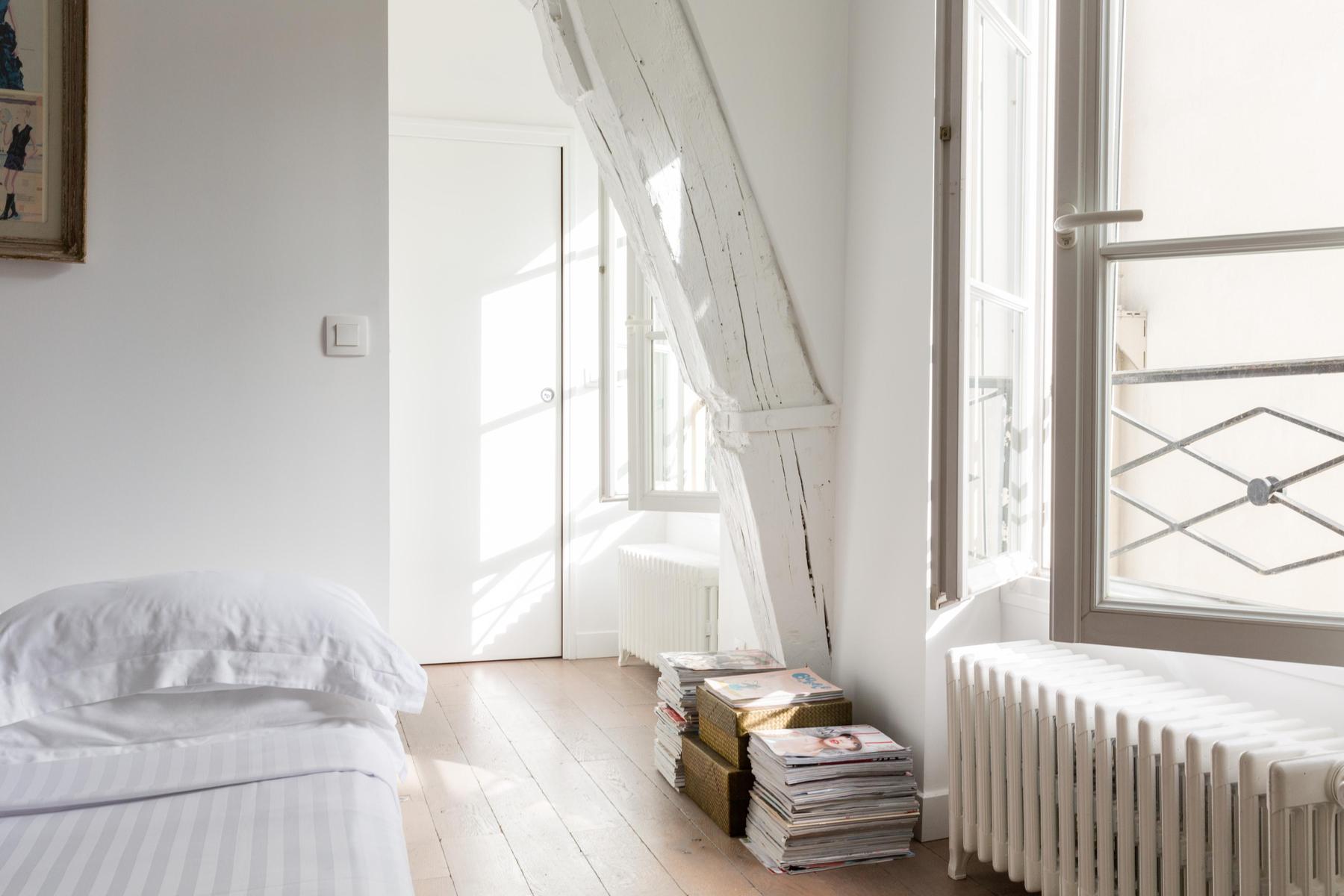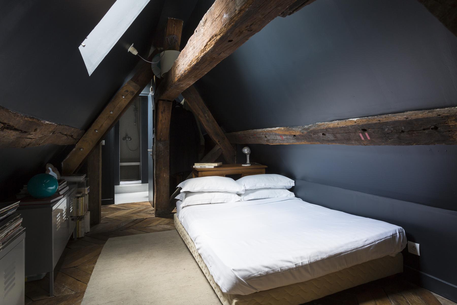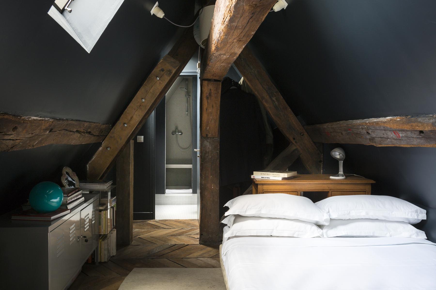 Sur cette rue animée du Marais, la splendeur du XVIIe siècle et la créativité ludique s’entrechoquent. Les poutres anciennes de cette maison sont peintes en blanc comme ses murs, et sur les planchers de bois, les chaises en Perspex et les tables en verre se perchent le long des coffres en noyer. Avec sa juxtaposition intrigante d’ancien et de nouveau, cette maison est une pour toutes les humeurs. Placé sous un grand chandelier en cristal, le bureau antique est un endroit idéal pour étudier, tandis que le fauteuil en velours jaune de la chambre à coucher principale, recouvert d’une peau de mouton douce et entouré de diverses œuvres d’art, est un endroit doux et relaxant.