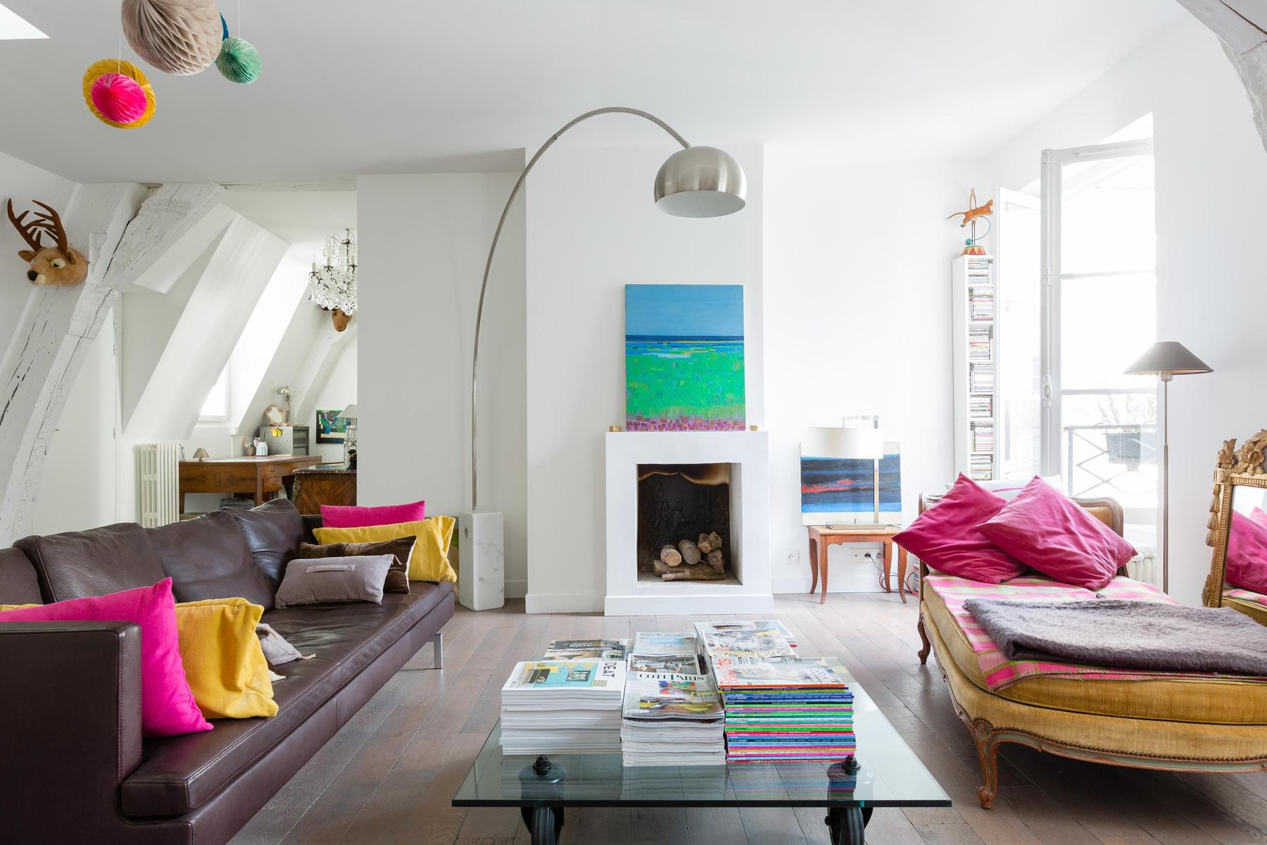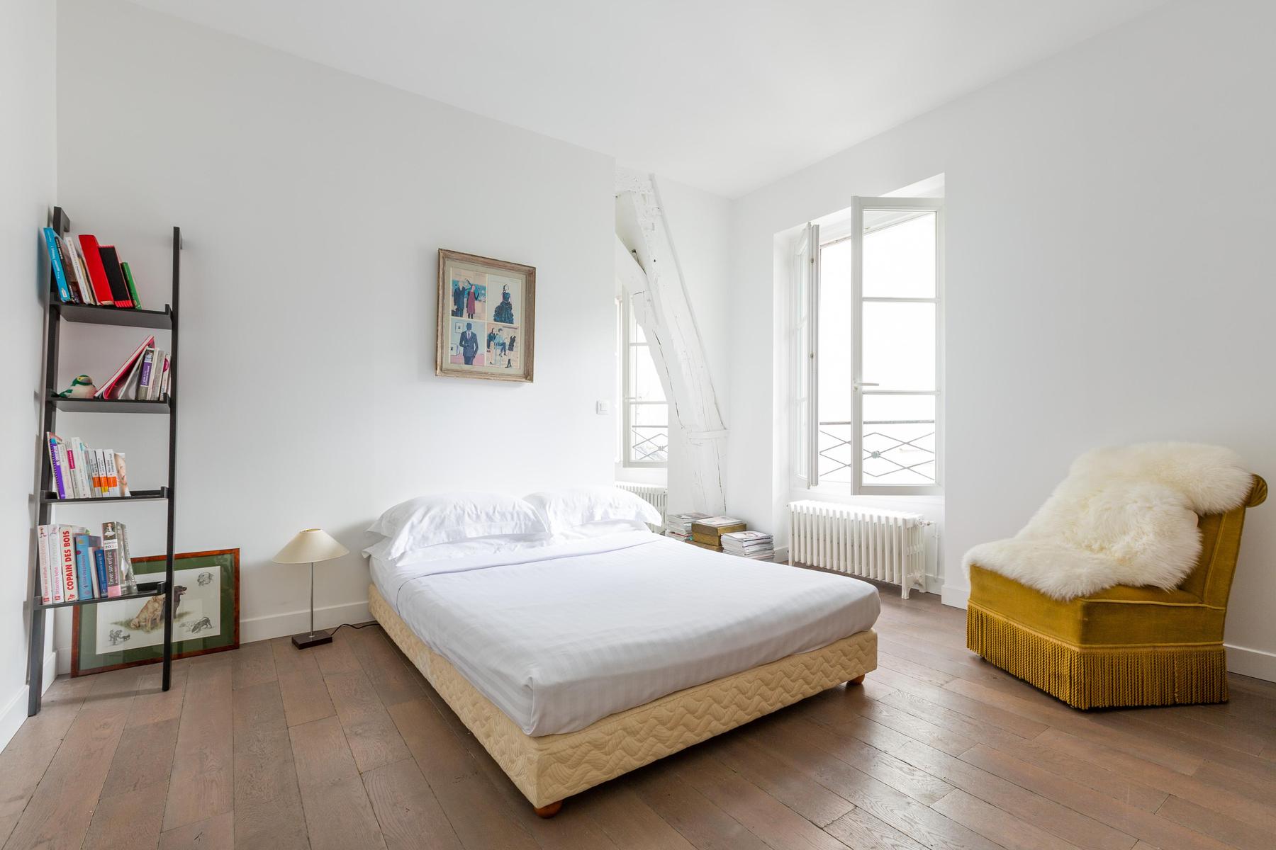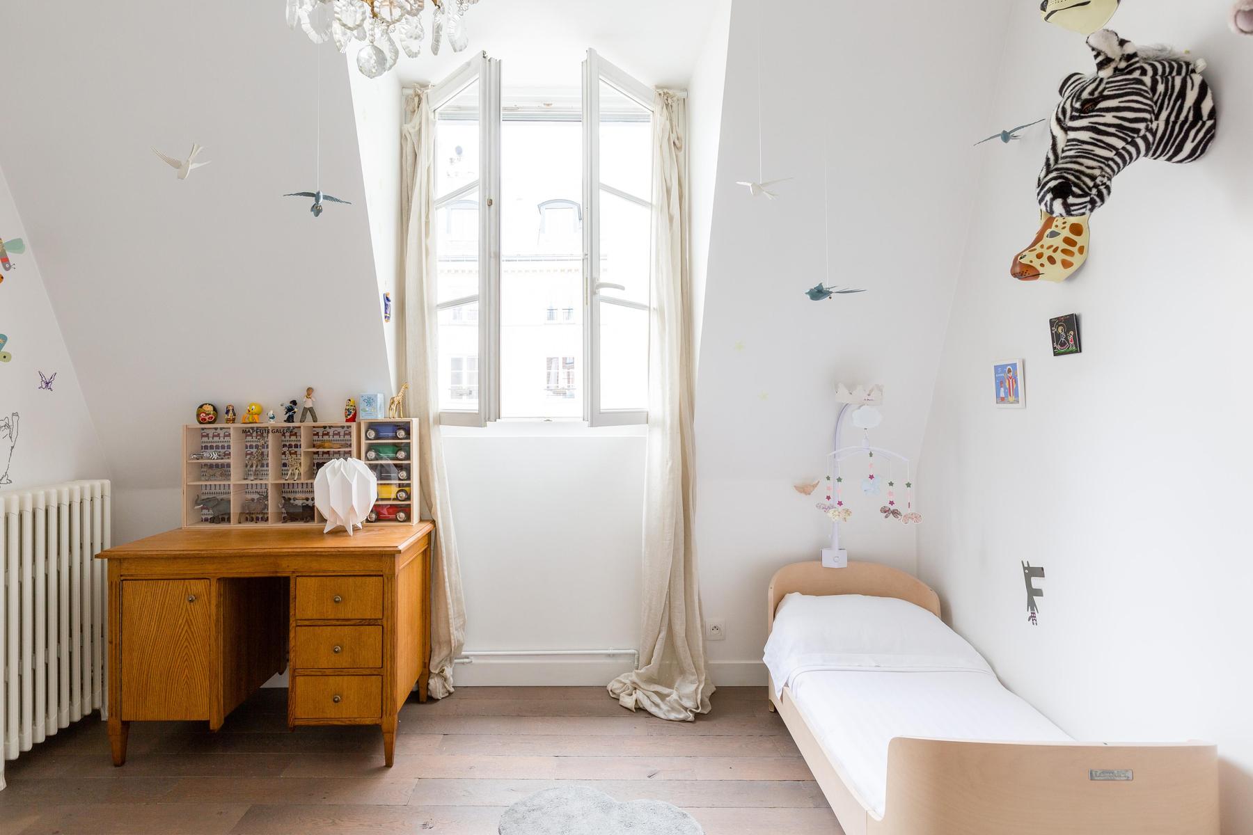 Sur cette rue animée du Marais, la splendeur du XVIIe siècle et la créativité ludique s’entrechoquent. Les poutres anciennes de cette maison sont peintes en blanc comme ses murs, et sur les planchers de bois, les chaises en Perspex et les tables en verre se perchent le long des coffres en noyer. Avec sa juxtaposition intrigante d’ancien et de nouveau, cette maison est une pour toutes les humeurs. Placé sous un grand chandelier en cristal, le bureau antique est un endroit idéal pour étudier, tandis que le fauteuil en velours jaune de la chambre à coucher principale, recouvert d’une peau de mouton douce et entouré de diverses œuvres d’art, est un endroit doux et relaxant.