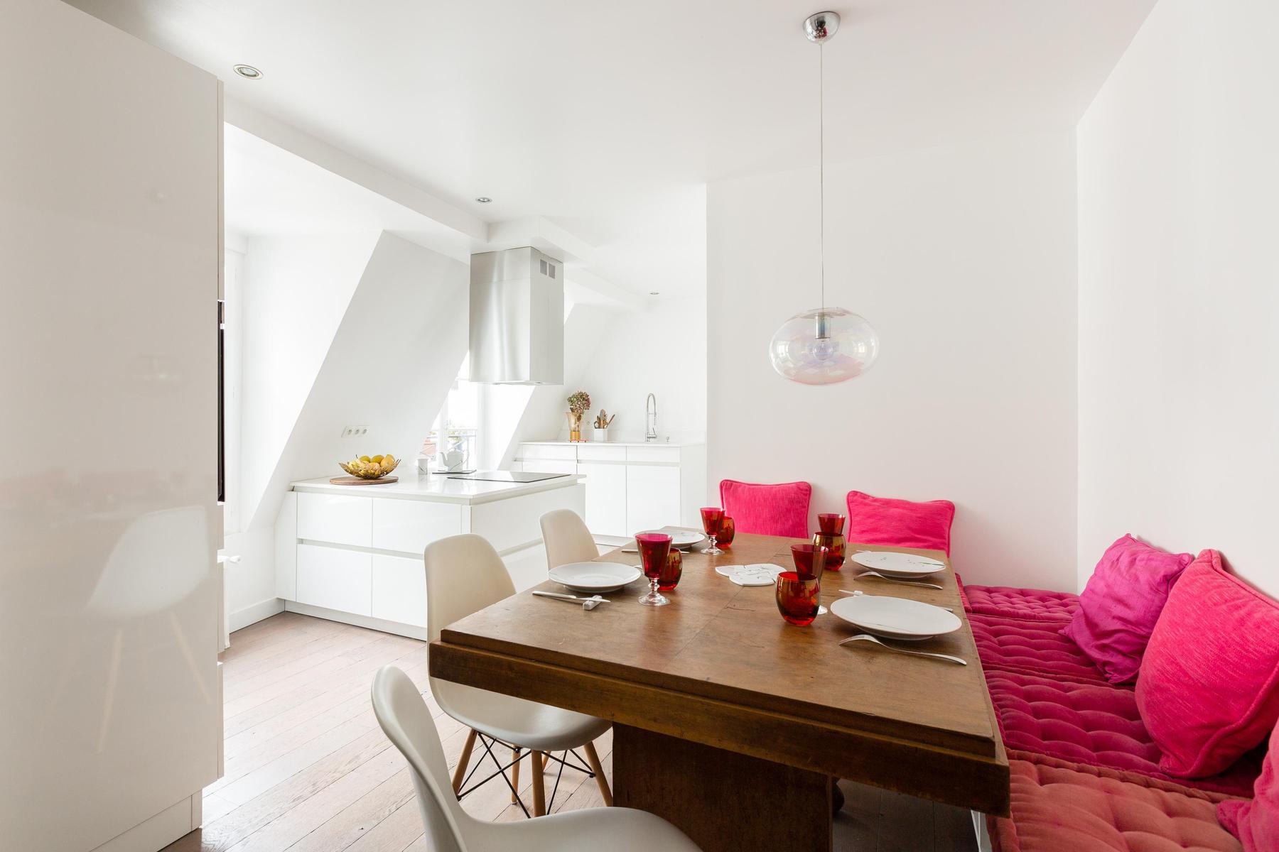 Le caractère, bien que la rue Saint-Denis l’ait en abondance, ne l’emporte jamais sur le confort. Malgré le drame des salles de bains sombres de cette maison, chacune d’entre elles est magnifiquement équipée. Et si la cuisine blanche et élégante contraste avec les couleurs, elle est tout aussi bien conçue, en particulier la table à manger flanquée de bancs en velours. Le salon est l’espace qui livre vraiment, avec sa chaise longue flamboyante qui surplombe les toits de Paris. Mais ne vous reposez pas trop longtemps avant d’explorer la ville – les boutiques et bars animés du Marais, l’excitante Ile de la Cité et le Louvre sont tous – incroyablement – à distance de marche.