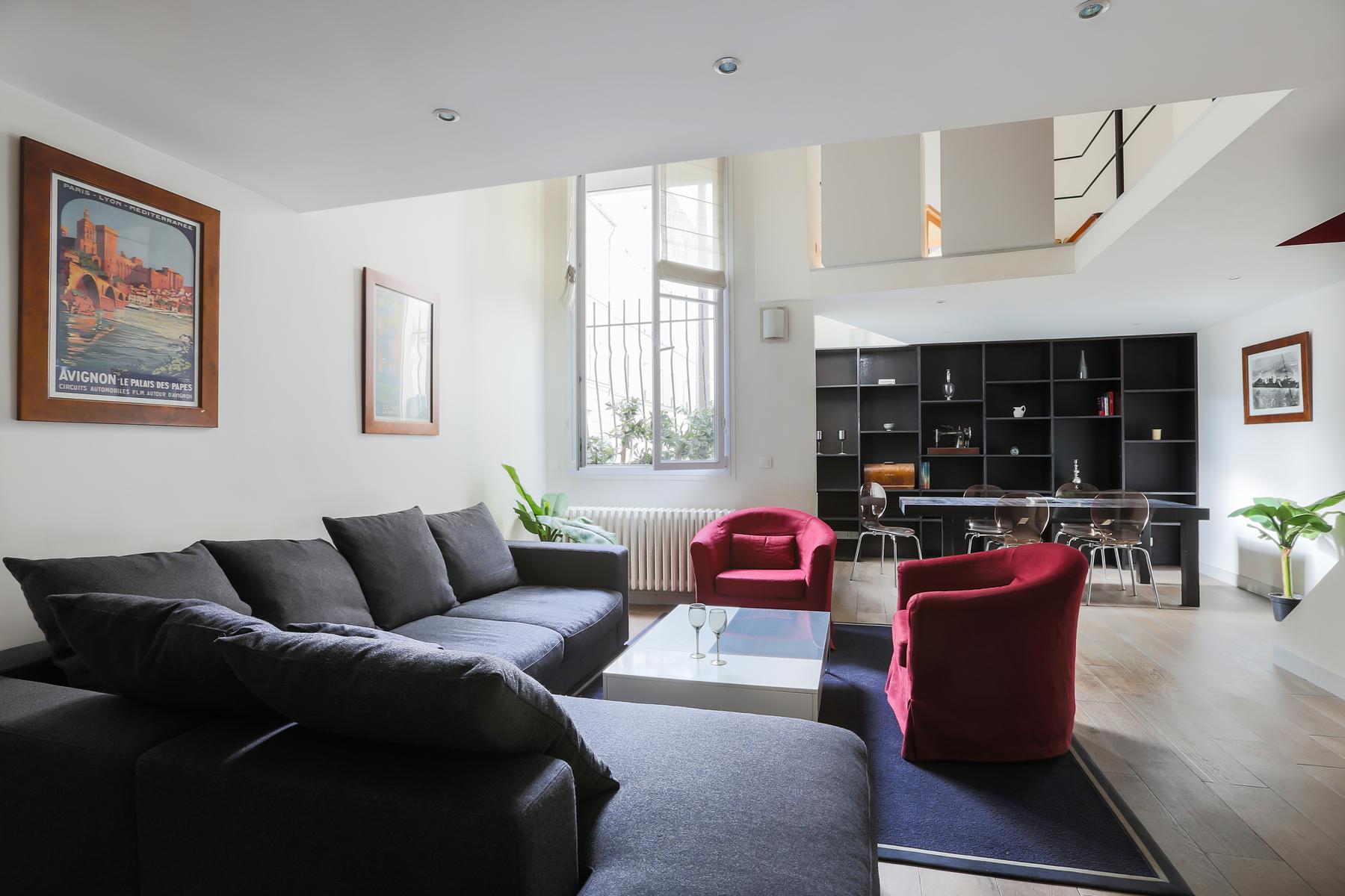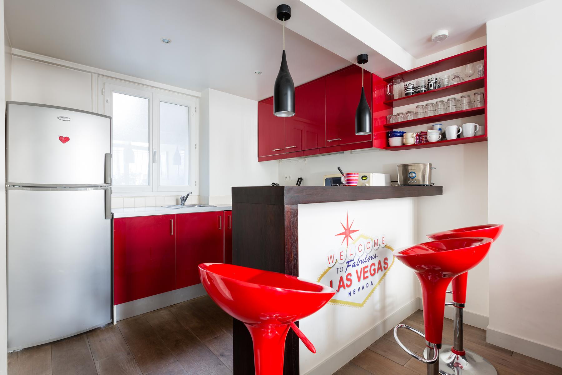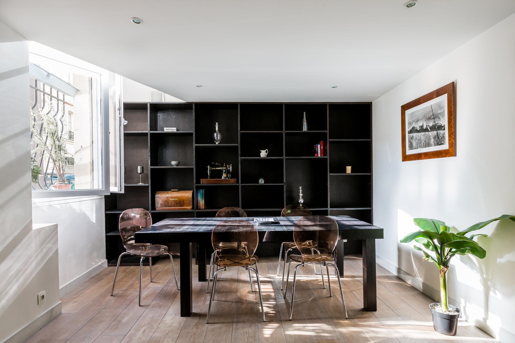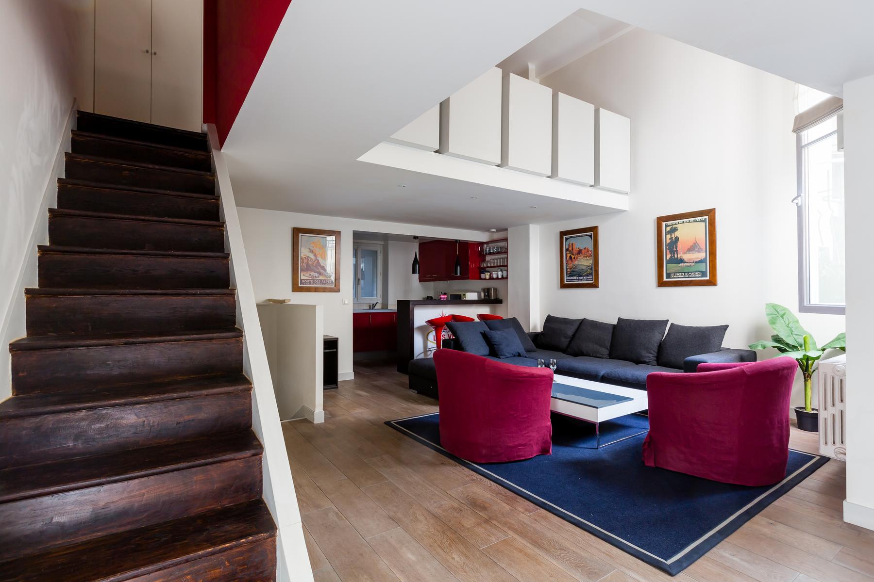 A quelques pas de la Tour Eiffel, cette maison est un endroit chic. Tout d’abord, il y a la salle de séjour ouverte, où il y a une cuisine rouge et blanche à l’extrémité proche. Sur la gauche se trouve une salle de toilette, puis, au-delà du bar brillant du petit déjeuner, vous trouverez le coin salon avec un grand canapé d’angle, deux fauteuils et une table basse élégante. Juste après, il y a une salle à manger, sa table noire avec des chaises design et ses étagères doublées d’accessoires tout aussi élégants.