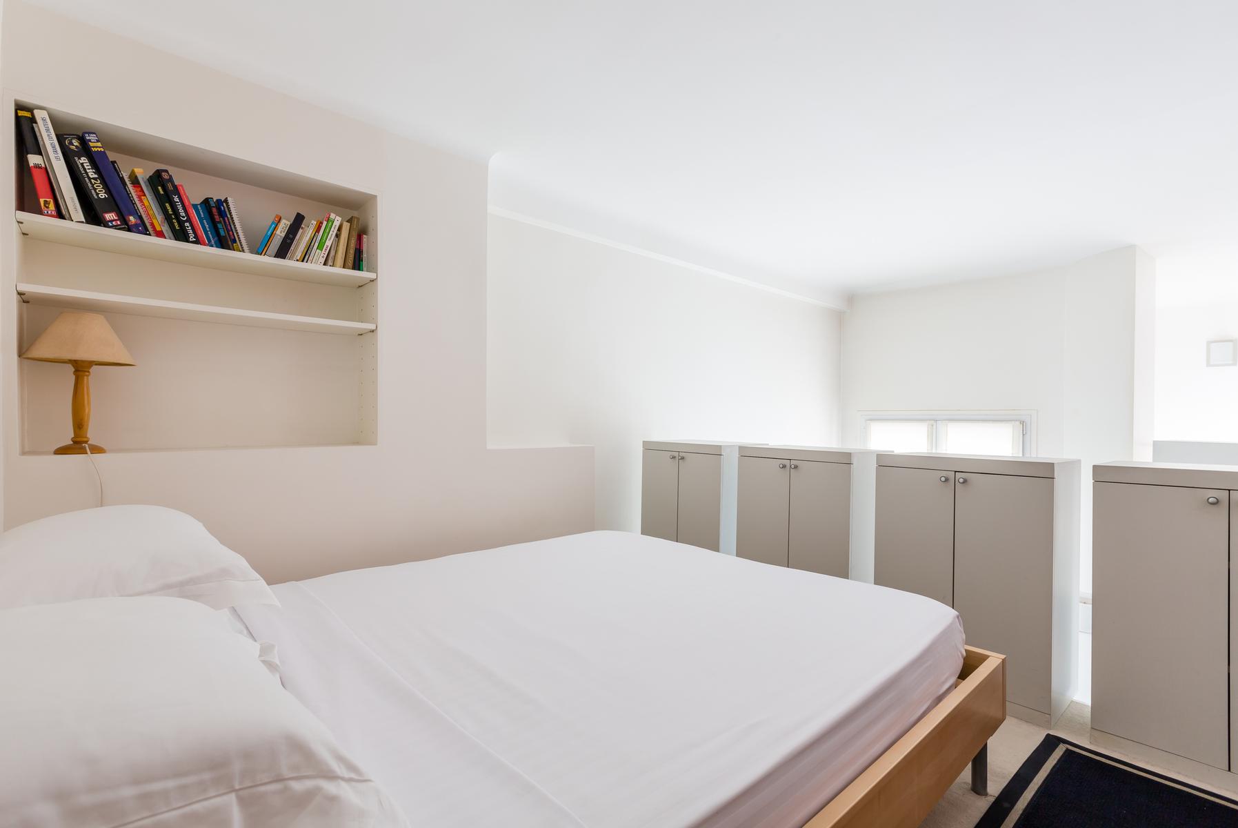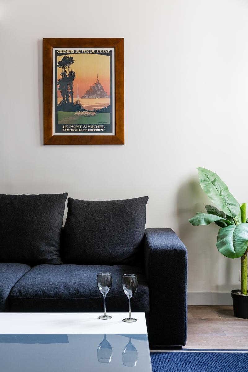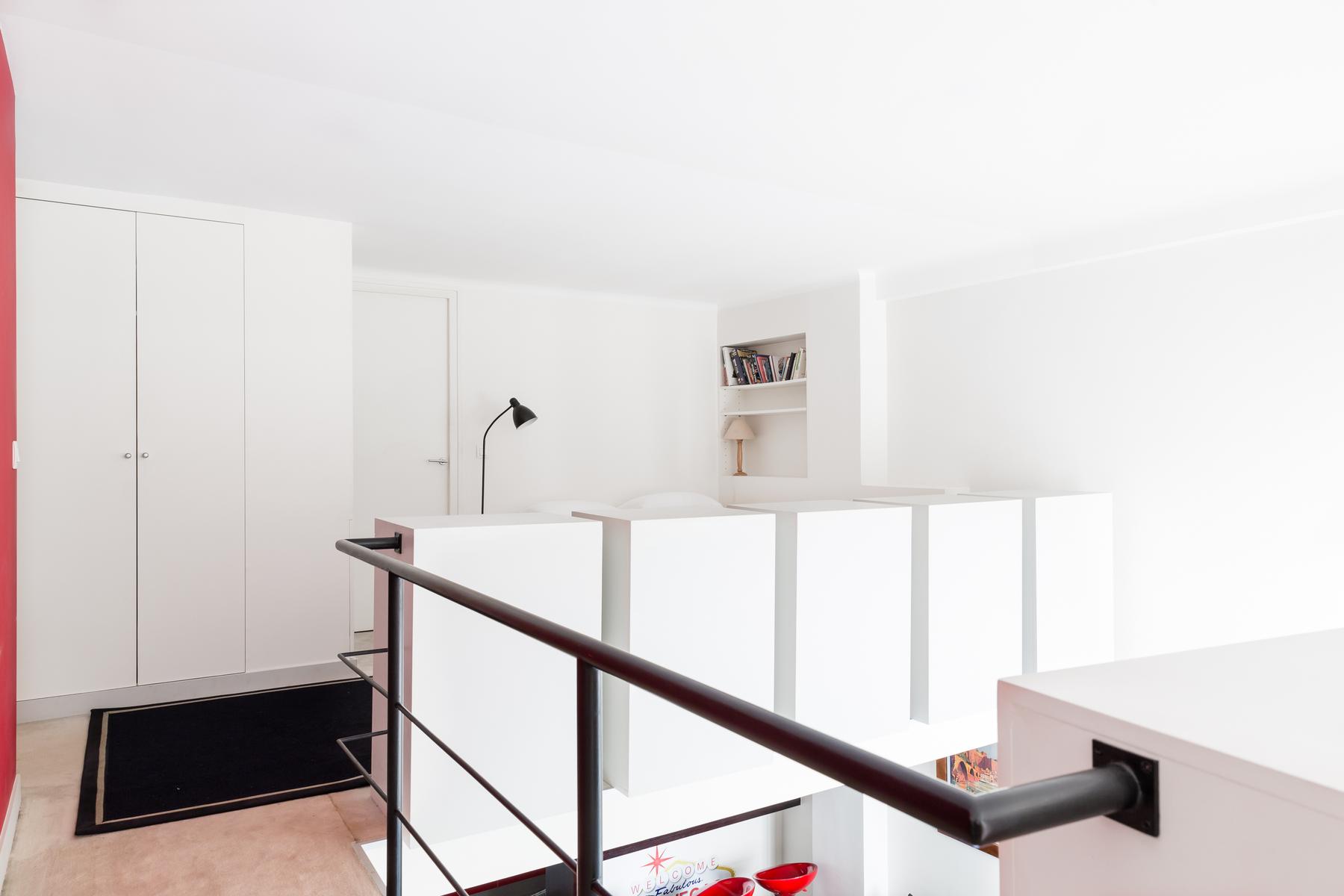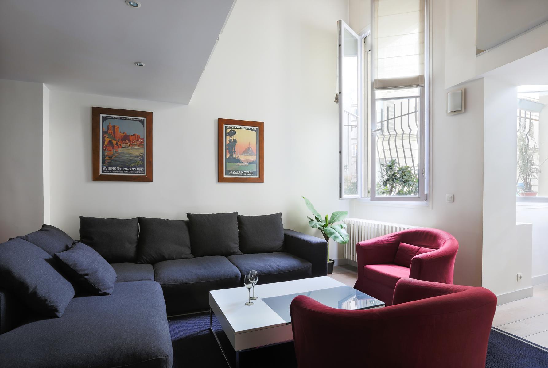 A quelques pas de la Tour Eiffel, cette maison est un endroit chic. Tout d’abord, il y a la salle de séjour ouverte, où il y a une cuisine rouge et blanche à l’extrémité proche. Sur la gauche se trouve une salle de toilette, puis, au-delà du bar brillant du petit déjeuner, vous trouverez le coin salon avec un grand canapé d’angle, deux fauteuils et une table basse élégante. Juste après, il y a une salle à manger, sa table noire avec des chaises design et ses étagères doublées d’accessoires tout aussi élégants.
