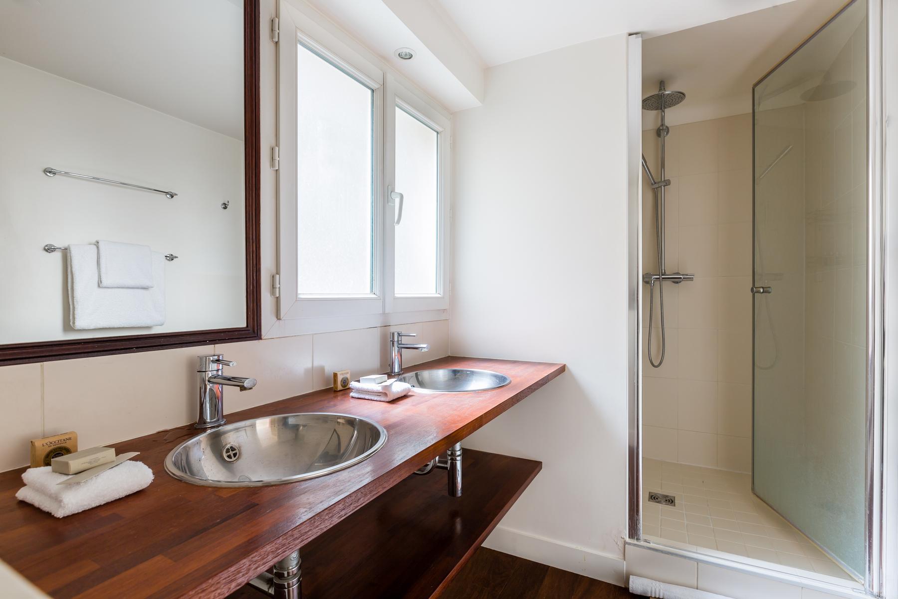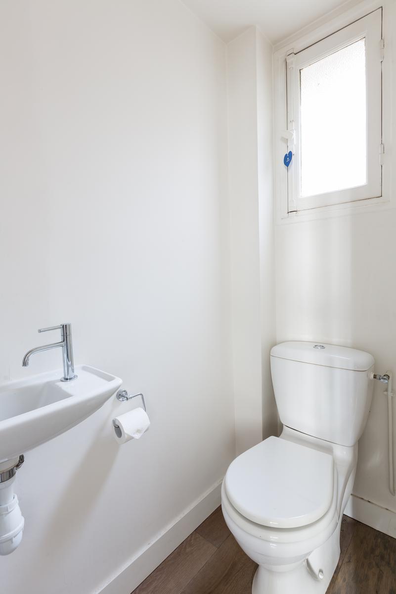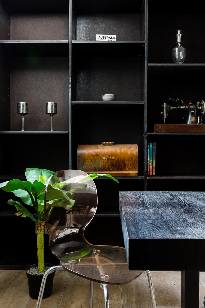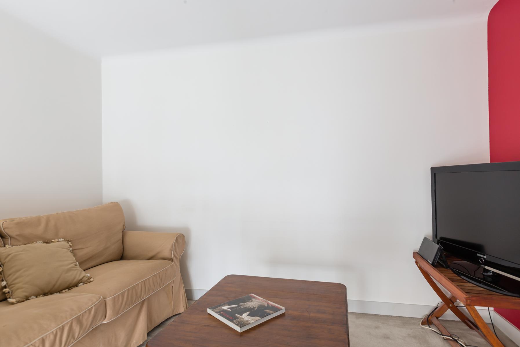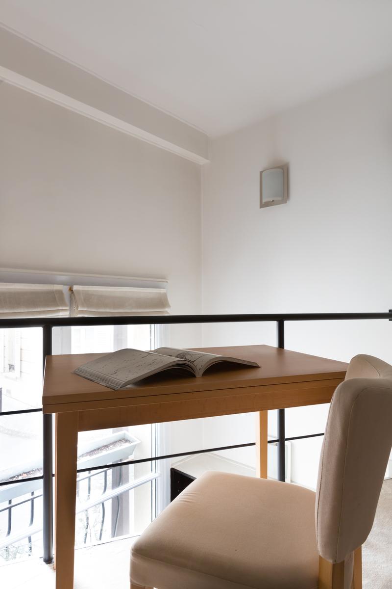 A quelques pas de la Tour Eiffel, cette maison est un endroit chic. Tout d’abord, il y a la salle de séjour ouverte, où il y a une cuisine rouge et blanche à l’extrémité proche. Sur la gauche se trouve une salle de toilette, puis, au-delà du bar brillant du petit déjeuner, vous trouverez le coin salon avec un grand canapé d’angle, deux fauteuils et une table basse élégante. Juste après, il y a une salle à manger, sa table noire avec des chaises design et ses étagères doublées d’accessoires tout aussi élégants.