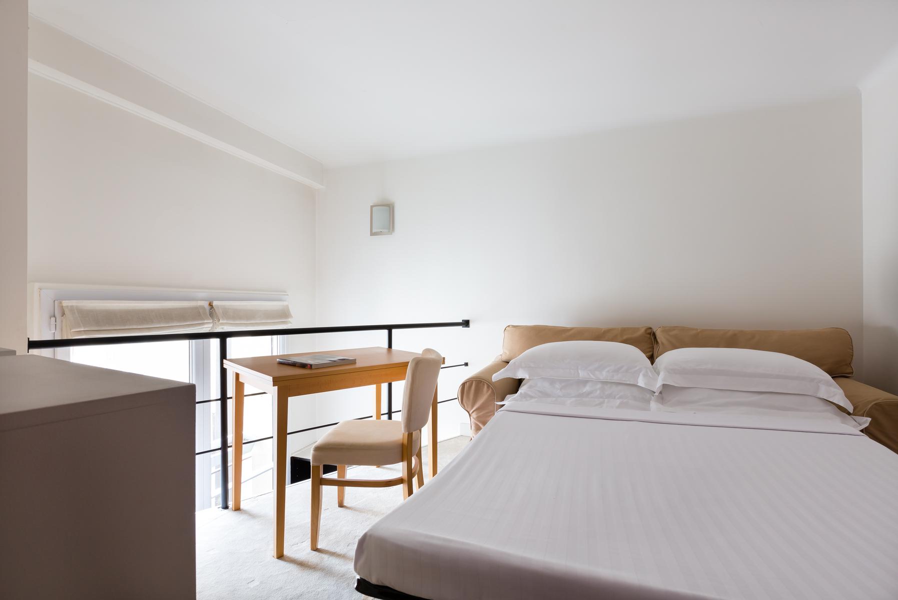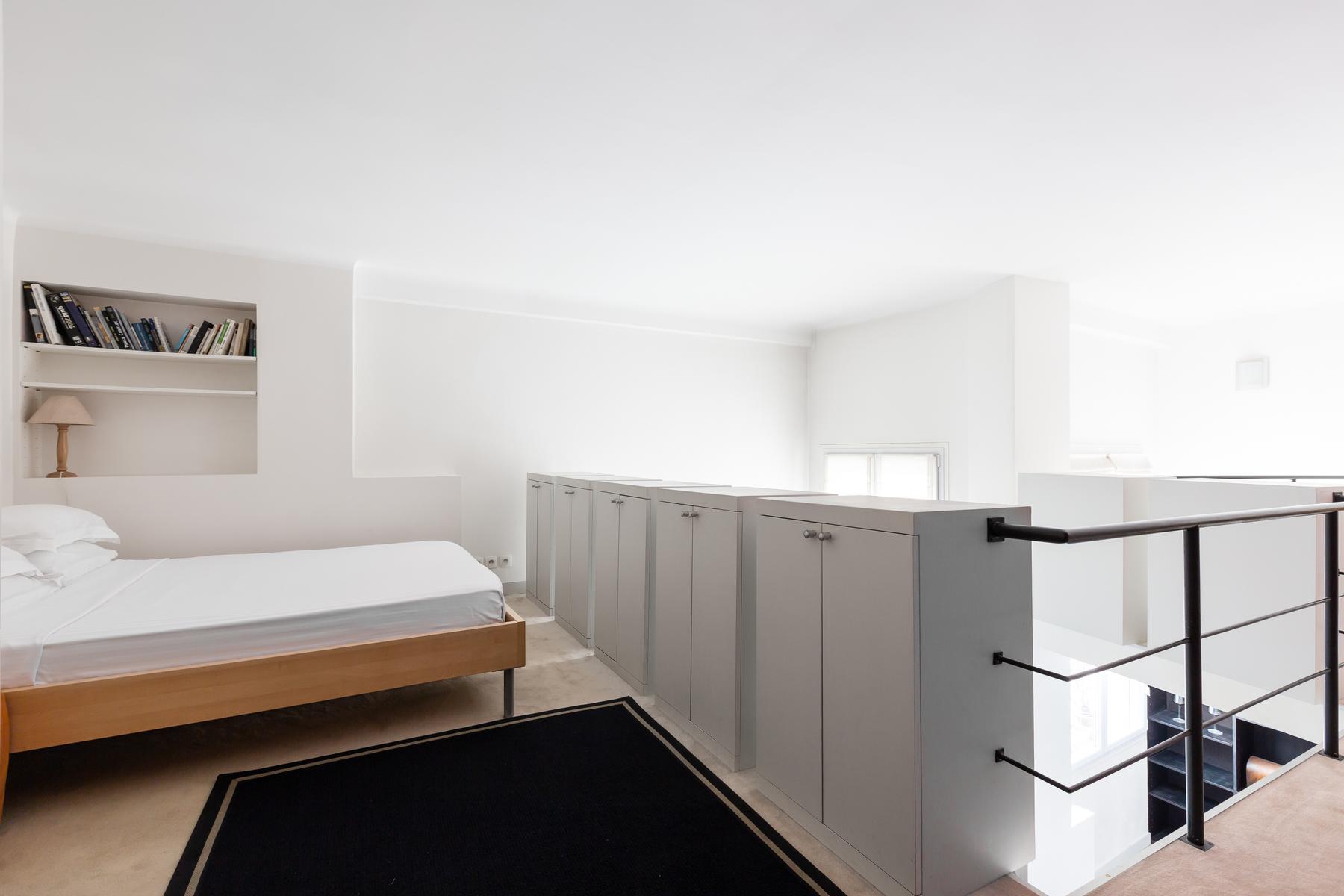 Ensuite, un escalier vous emmène jusqu’à une mezzanine. D’un côté, il y a un bureau – un coin confortable avec un petit bureau et un canapé-lit. Et à l’autre, il y a la chambre principale. Avec son lit en bois, son tapis noir et blanc et sa salle de bain soignée (avec douche), cette dernière chambre est d’une simplicité rafraîchissante.