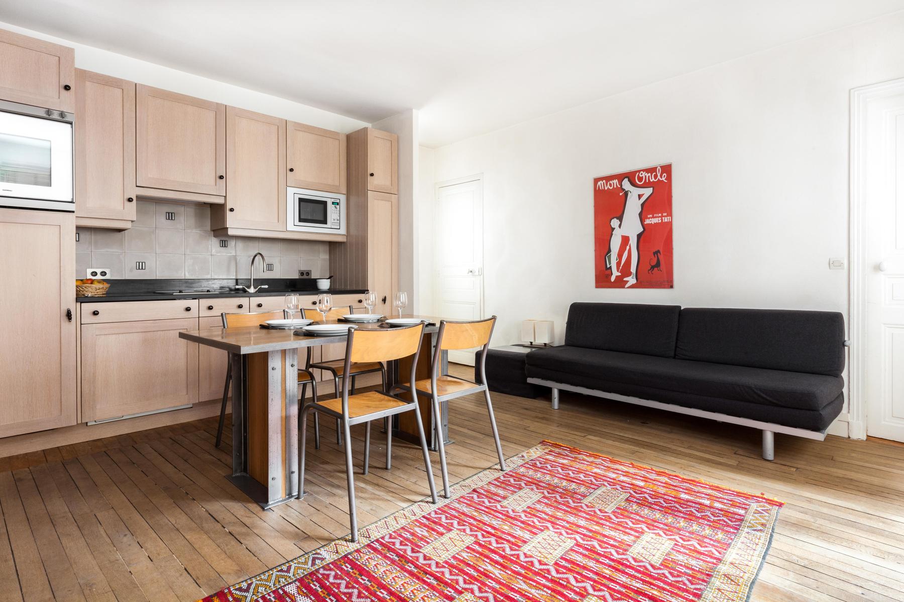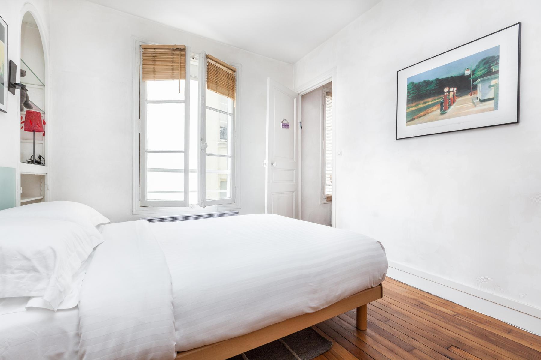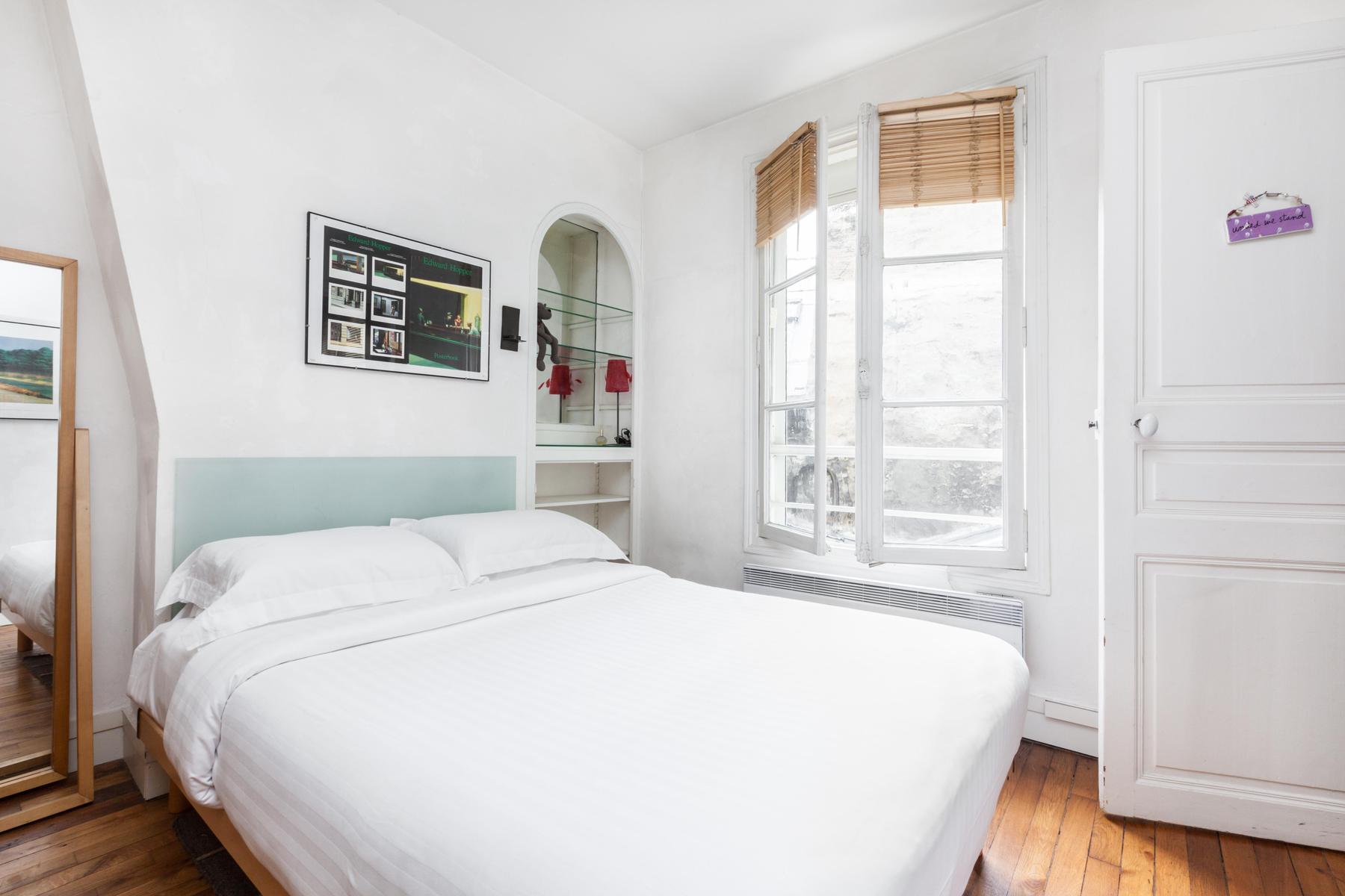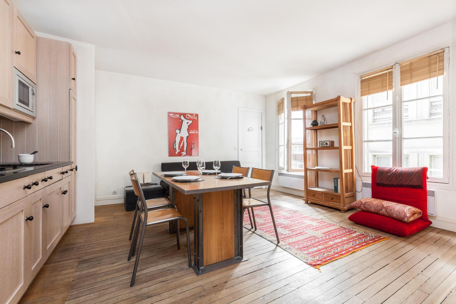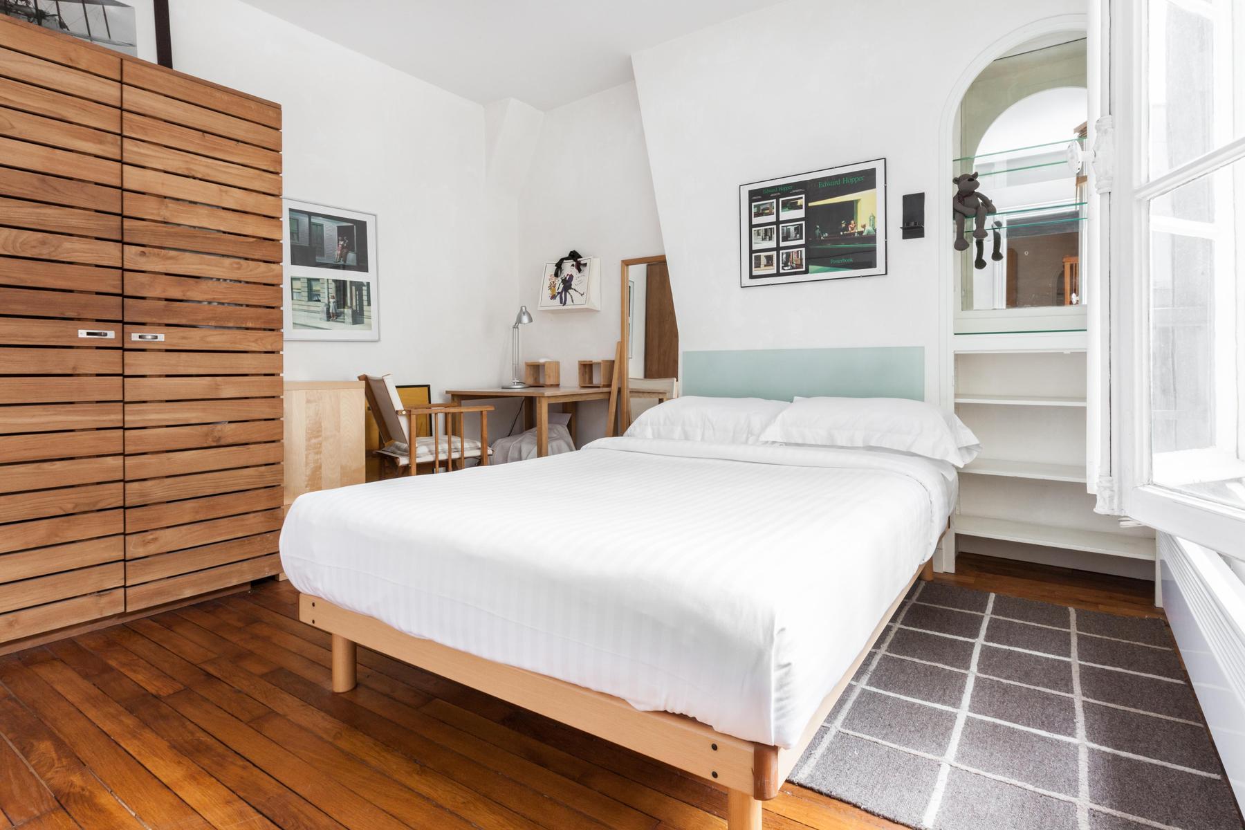 La rue Saint Honoré a une certaine aura. Et ce n'est pas étonnant, situé dans le foyer historique des Halles, il permet d'accéder facilement à des reliques parisiennes comme l'église Saint Eustache. Mais l’atmosphère riche est aussi due aux intérieurs régaliens : les cascades de lumière naturelle à travers des fenêtres majestueuses, les planchers et les meubles en bois chic sont équilibrés par un thème minimaliste, et les imprimés d’art moderne complètent un schéma de couleurs apaisantes de couleurs clairsemées, rouges royaux et tons de terre. Alors, régalez-vous chez vous avec des coupes de vin ou partez à la poursuite de votre propre Graal parisien.