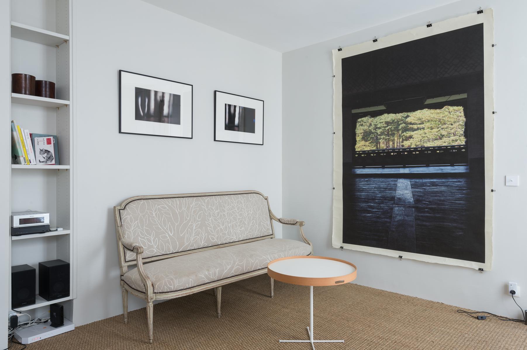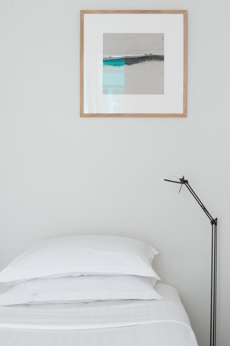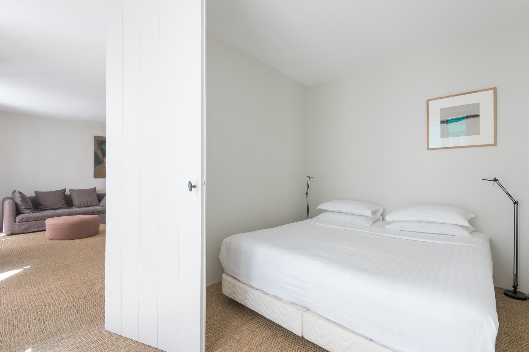 Ensuite, une autre porte ouverte vous emmène dans le salon. C’est un espace serein, avec des murs blancs (qui sont accrochés avec des œuvres d’art contemplatives) et des tapis de mer. Il a deux canapés – l’un confortable, l’autre plus élégant, avec un joli motif de feuilles. Au fond, une porte s’ouvre sur la chambre des maîtres à l’arrière-plan. Ici, il y a un lit double simple et une salle de bain avec douche.