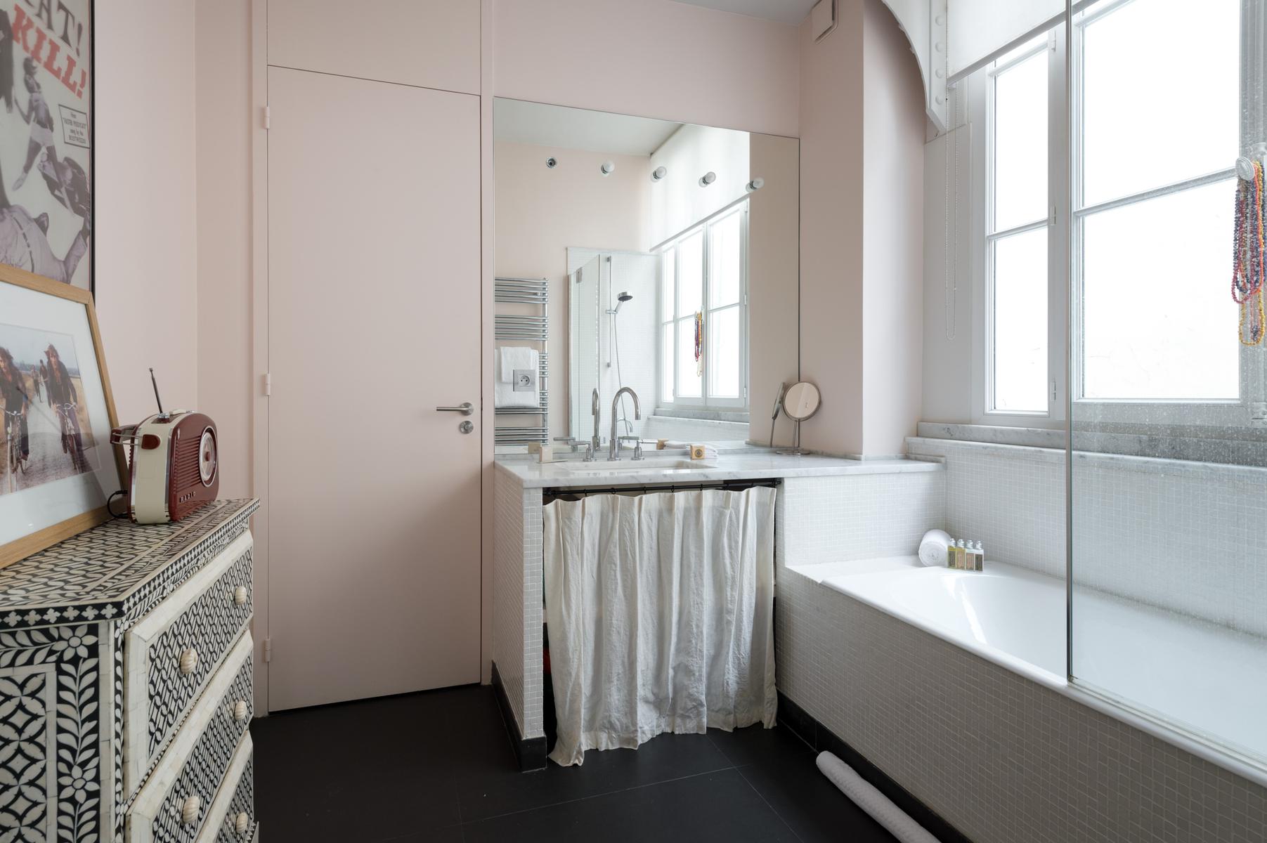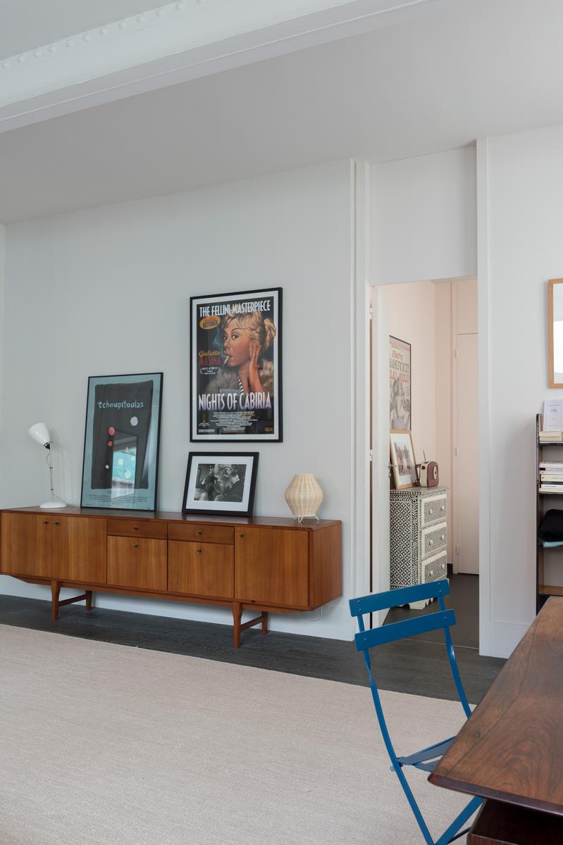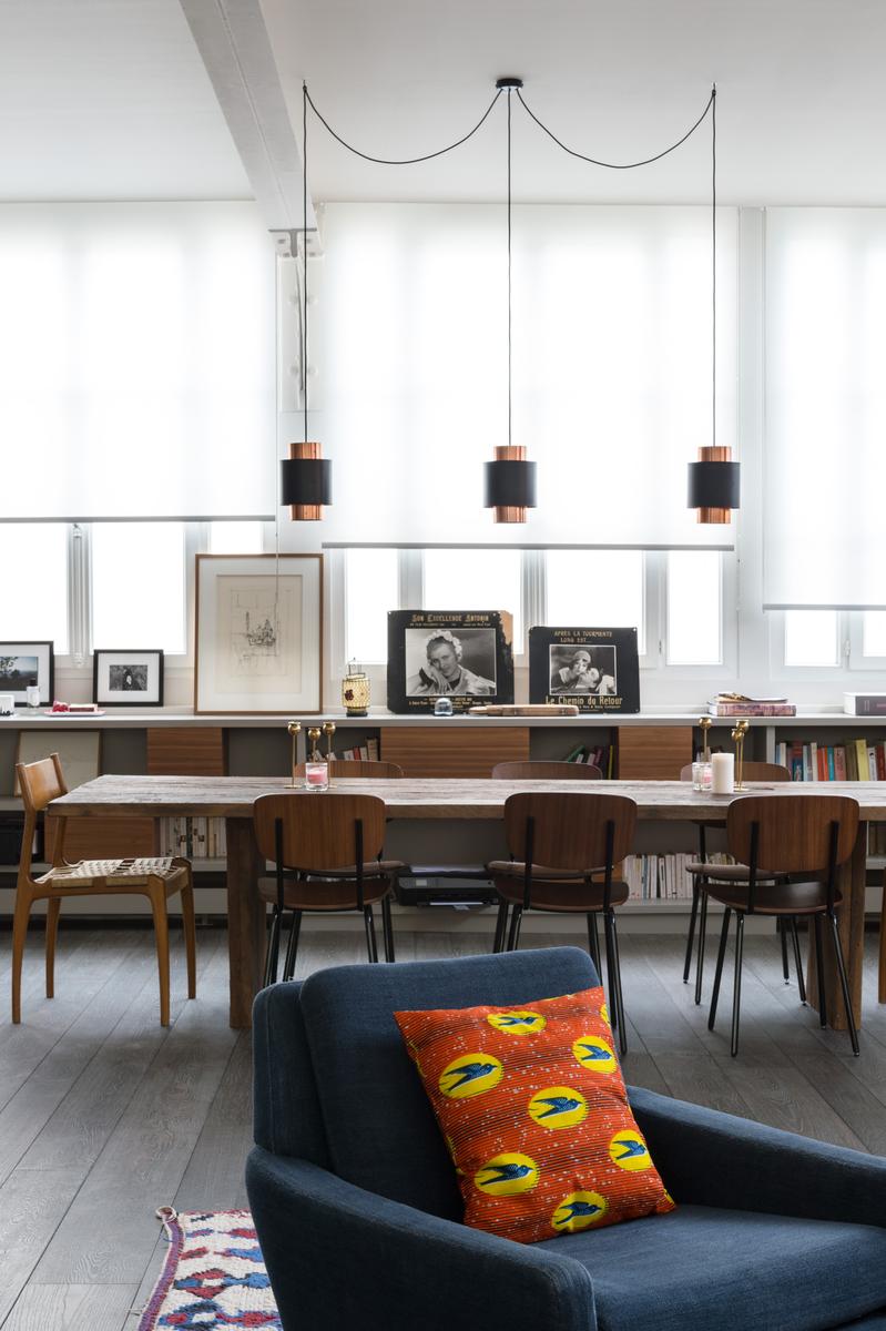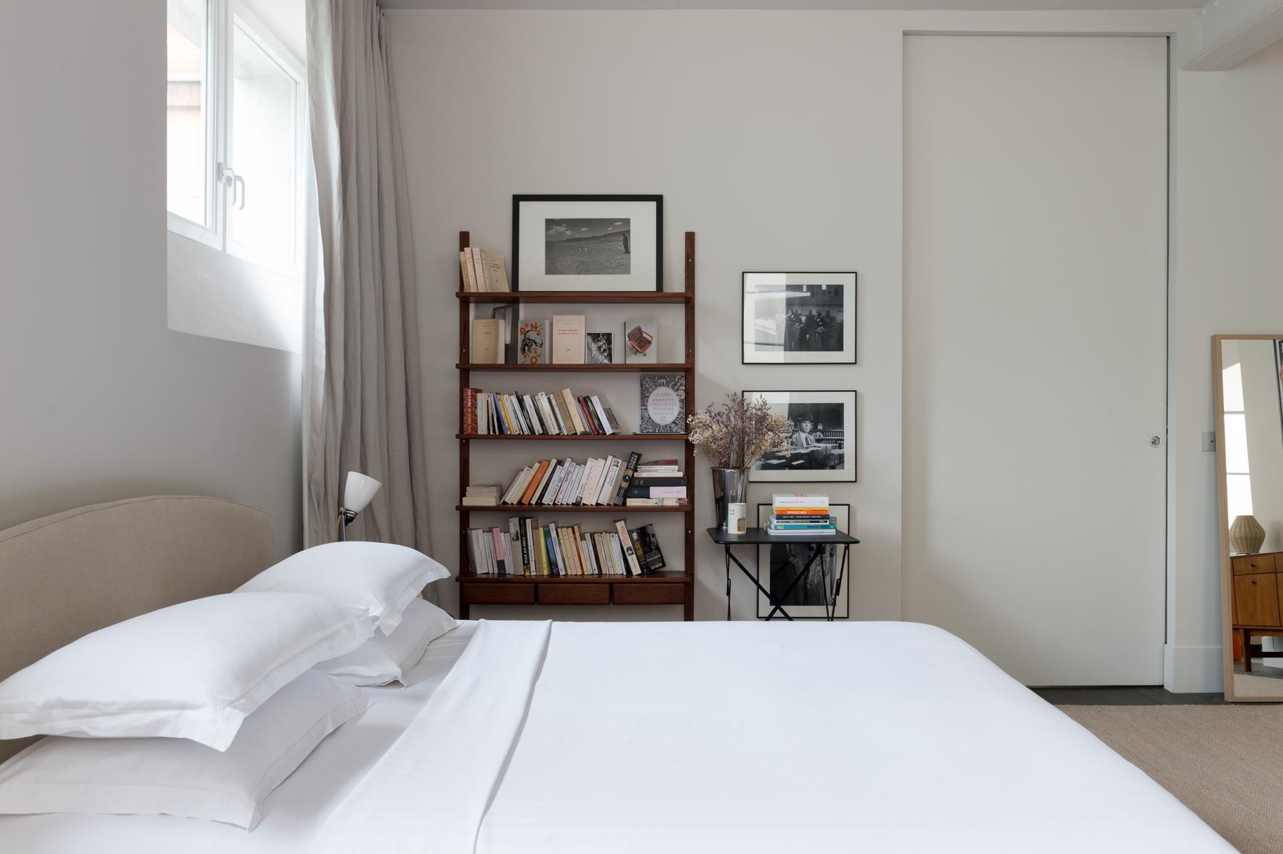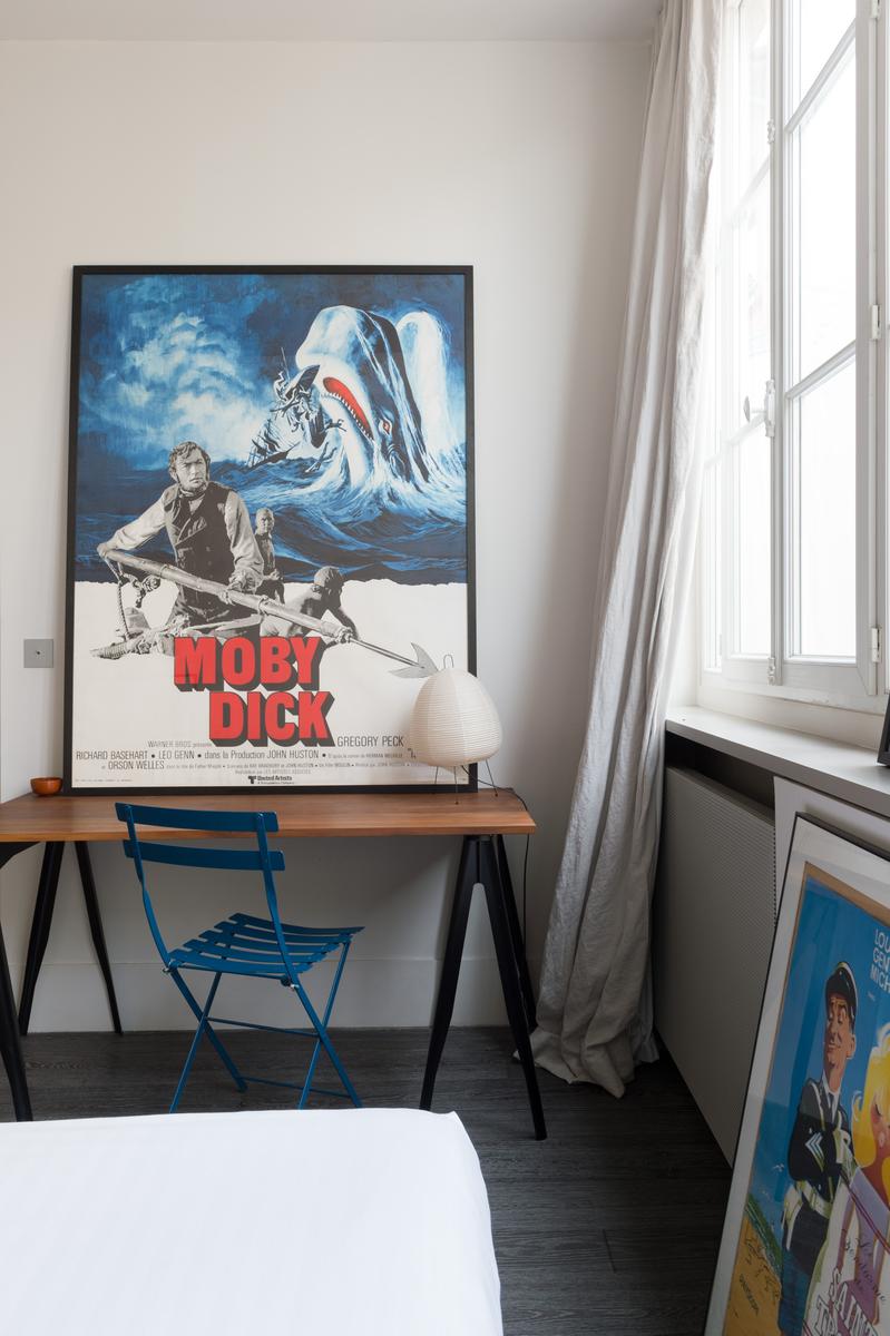 Un design élégant, des affiches de films rétro et une sélection raffinée de meubles – il n’est pas surprenant que le propriétaire travaille dans l’industrie cinématographique. À l’intérieur, il y a un cabinet de toilette à droite, et une salle de bain contemporaine droit devant. Ensuite se trouve la deuxième chambre à coucher (décorée de quelques affiches de films encadrées), puis le salon à aire ouverte sur la gauche. À l’extrémité proche de cette pièce aux larges fenêtres peintes en blanc se trouve la cuisine, qui possède des comptoirs de marbre et un bar assorti pour le petit-déjeuner. Ci-contre, une longue table de salle à manger d’époque, éclairée par des lampes en cuivre. Puis, dans le coin le plus éloigné, vous trouverez le coin salon – avec des meubles aux motifs audacieux et d’élégants alambics en noir et blanc.
