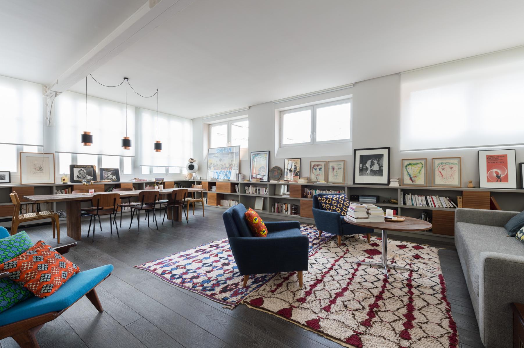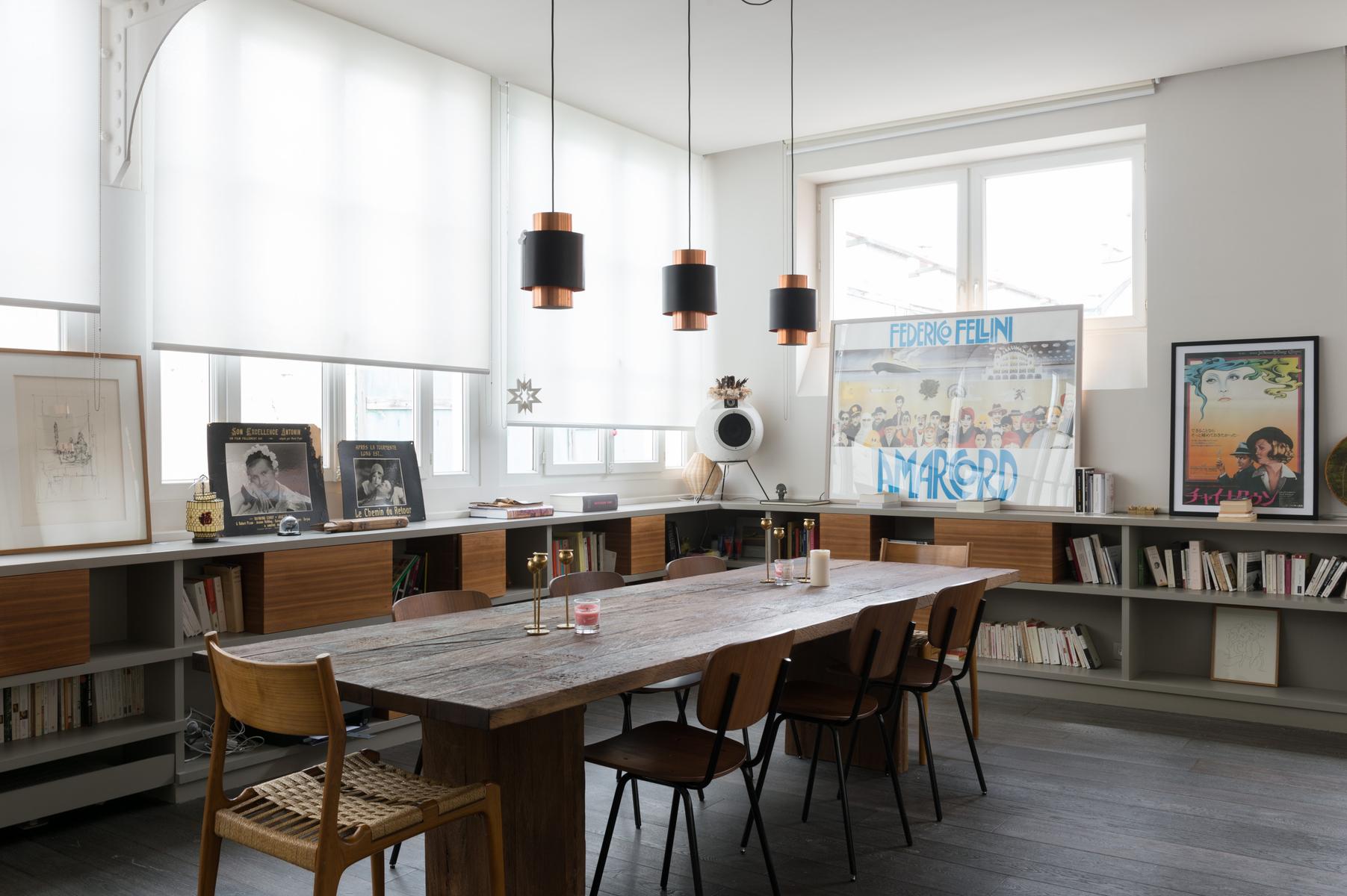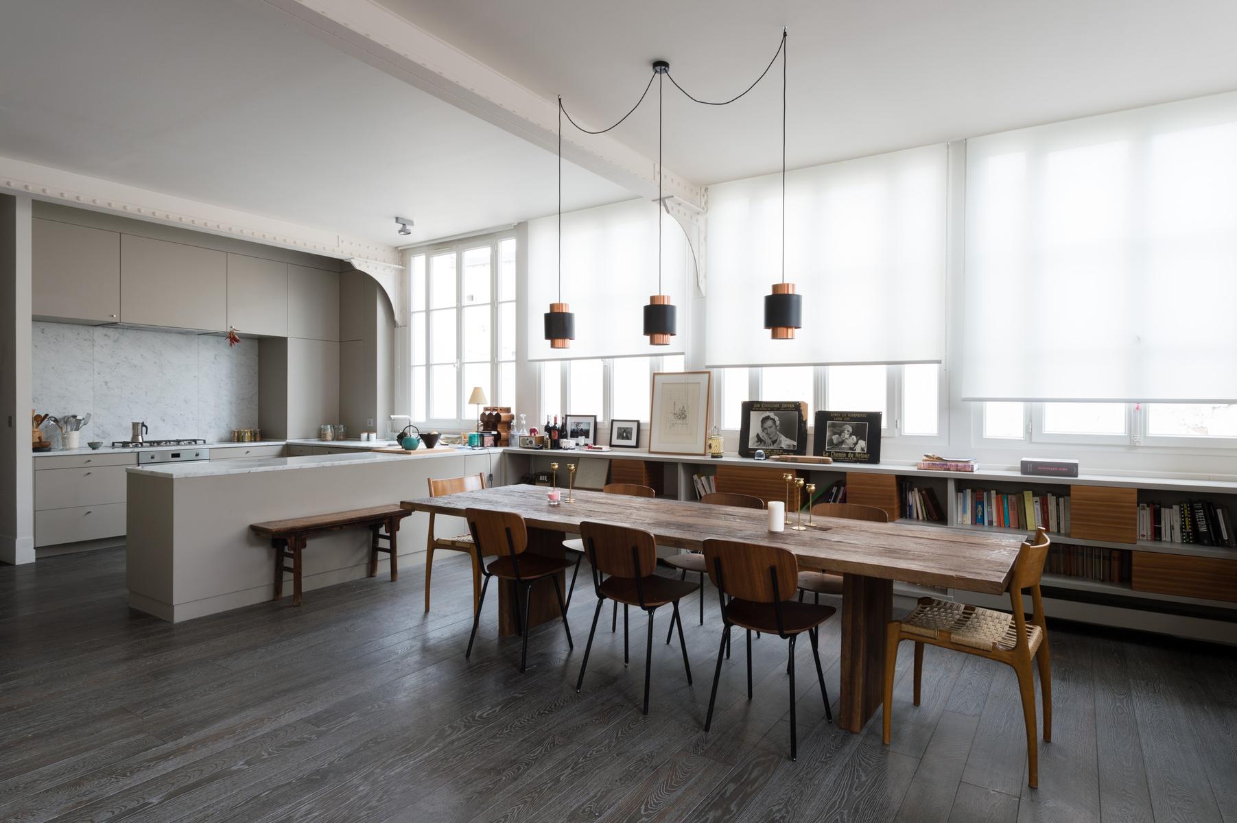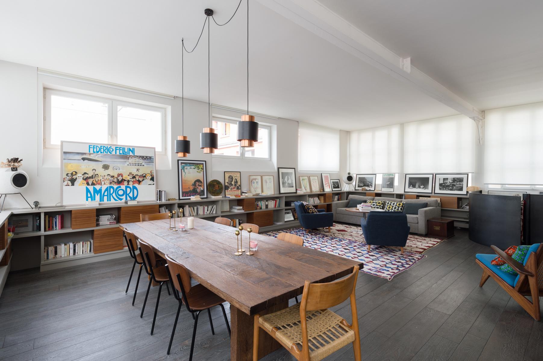 Un design élégant, des affiches de films rétro et une sélection raffinée de meubles – il n’est pas surprenant que le propriétaire travaille dans l’industrie cinématographique. À l’intérieur, il y a un cabinet de toilette à droite, et une salle de bain contemporaine droit devant. Ensuite se trouve la deuxième chambre à coucher (décorée de quelques affiches de films encadrées), puis le salon à aire ouverte sur la gauche. À l’extrémité proche de cette pièce aux larges fenêtres peintes en blanc se trouve la cuisine, qui possède des comptoirs de marbre et un bar assorti pour le petit-déjeuner. Ci-contre, une longue table de salle à manger d’époque, éclairée par des lampes en cuivre. Puis, dans le coin le plus éloigné, vous trouverez le coin salon – avec des meubles aux motifs audacieux et d’élégants alambics en noir et blanc.