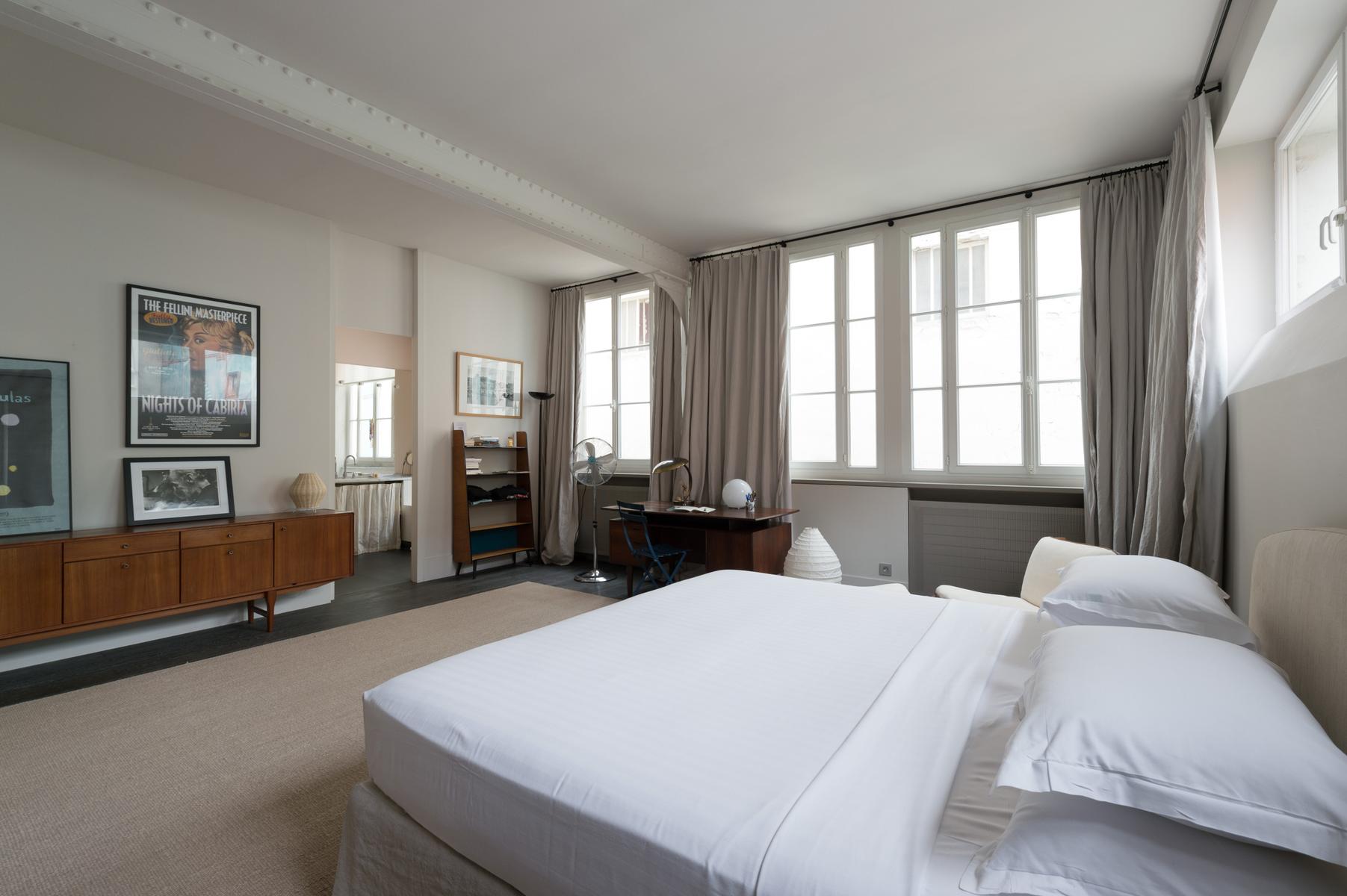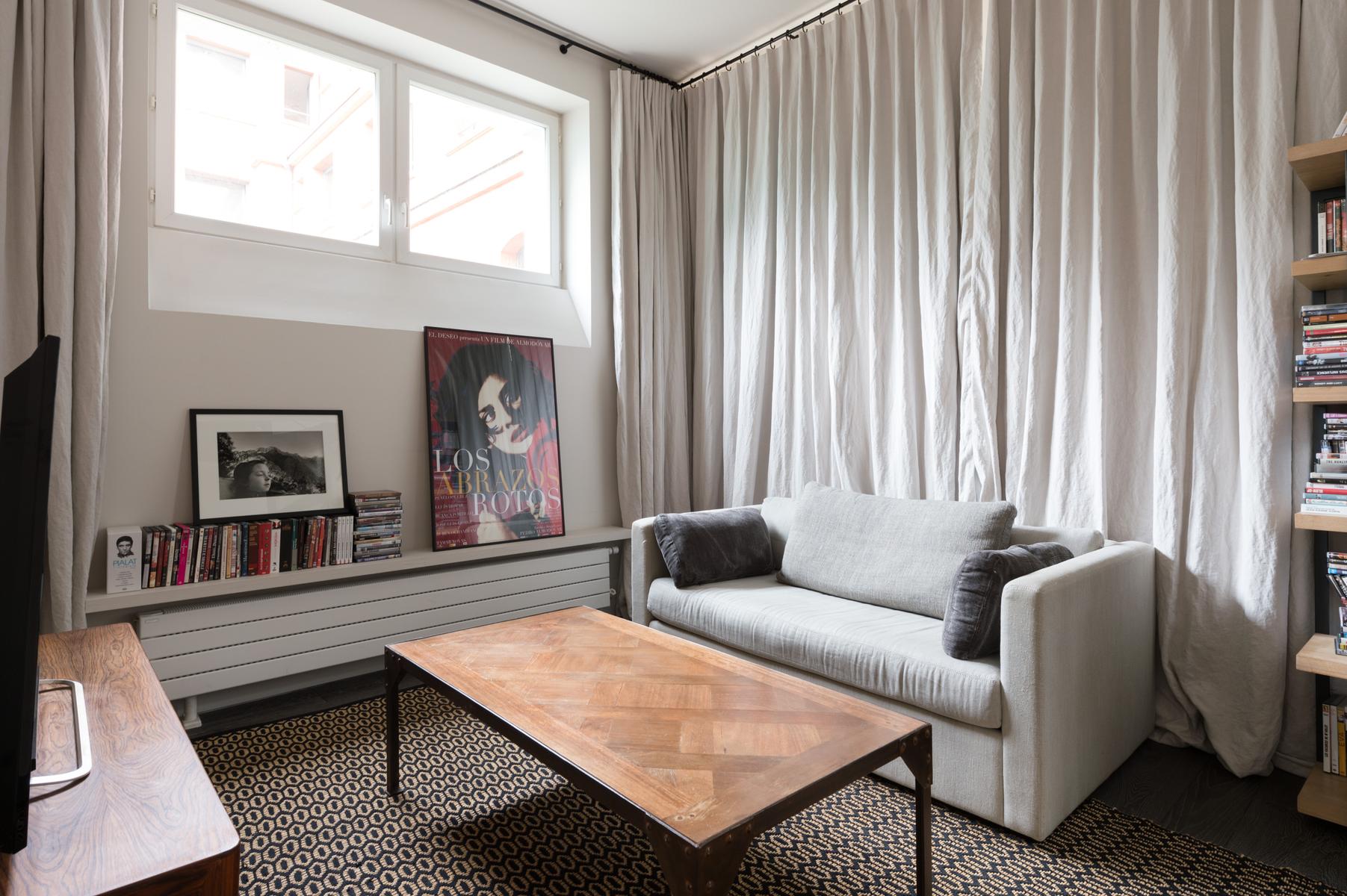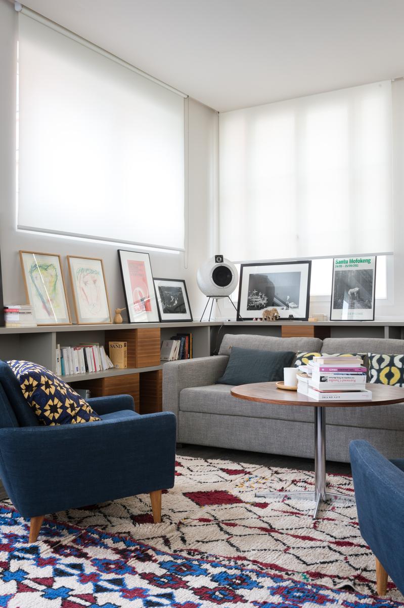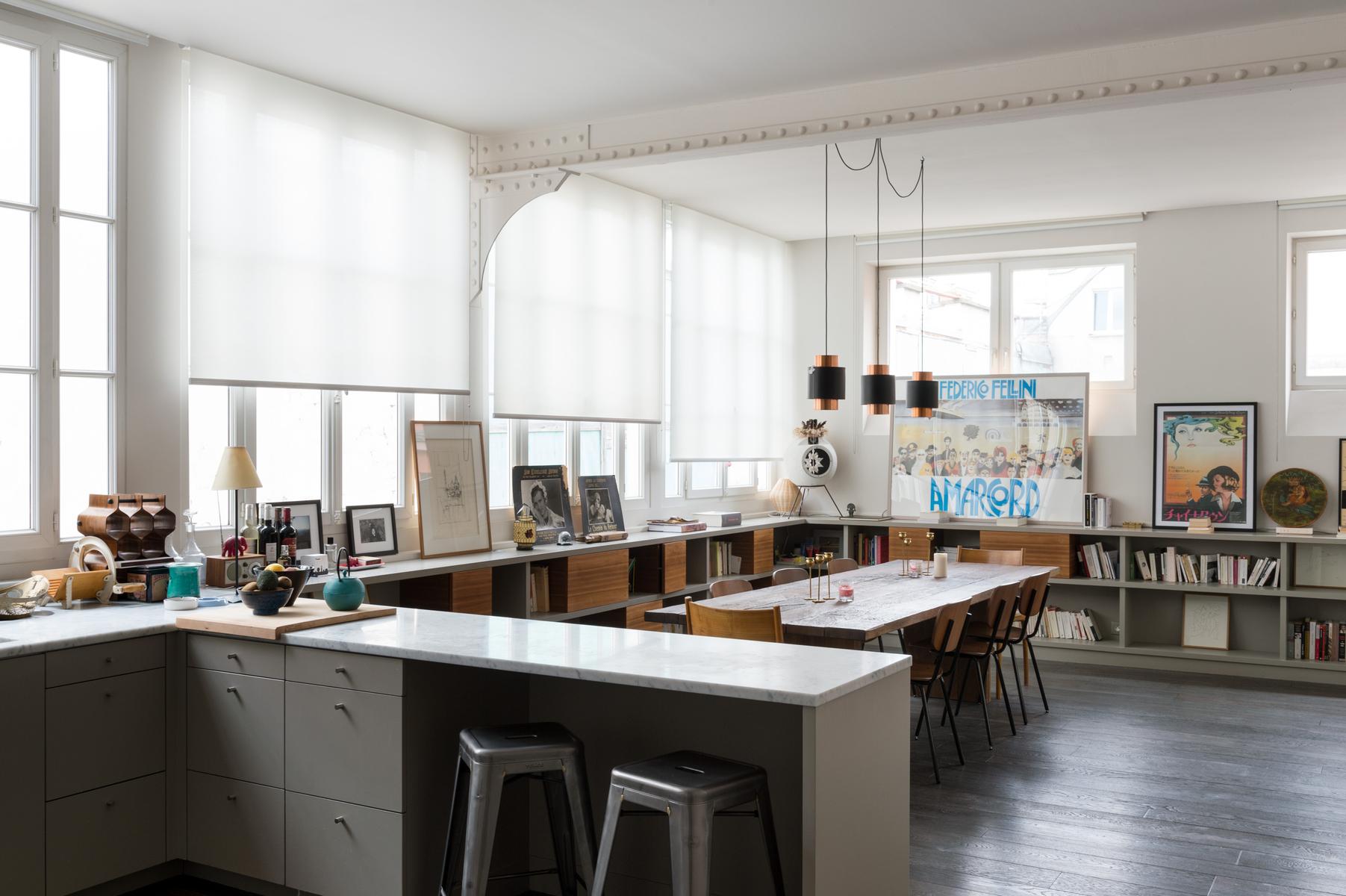 Un design élégant, des affiches de films rétro et une sélection raffinée de meubles – il n’est pas surprenant que le propriétaire travaille dans l’industrie cinématographique. À l’intérieur, il y a un cabinet de toilette à droite, et une salle de bain contemporaine droit devant. Ensuite se trouve la deuxième chambre à coucher (décorée de quelques affiches de films encadrées), puis le salon à aire ouverte sur la gauche. À l’extrémité proche de cette pièce aux larges fenêtres peintes en blanc se trouve la cuisine, qui possède des comptoirs de marbre et un bar assorti pour le petit-déjeuner. Ci-contre, une longue table de salle à manger d’époque, éclairée par des lampes en cuivre. Puis, dans le coin le plus éloigné, vous trouverez le coin salon – avec des meubles aux motifs audacieux et d’élégants alambics en noir et blanc.