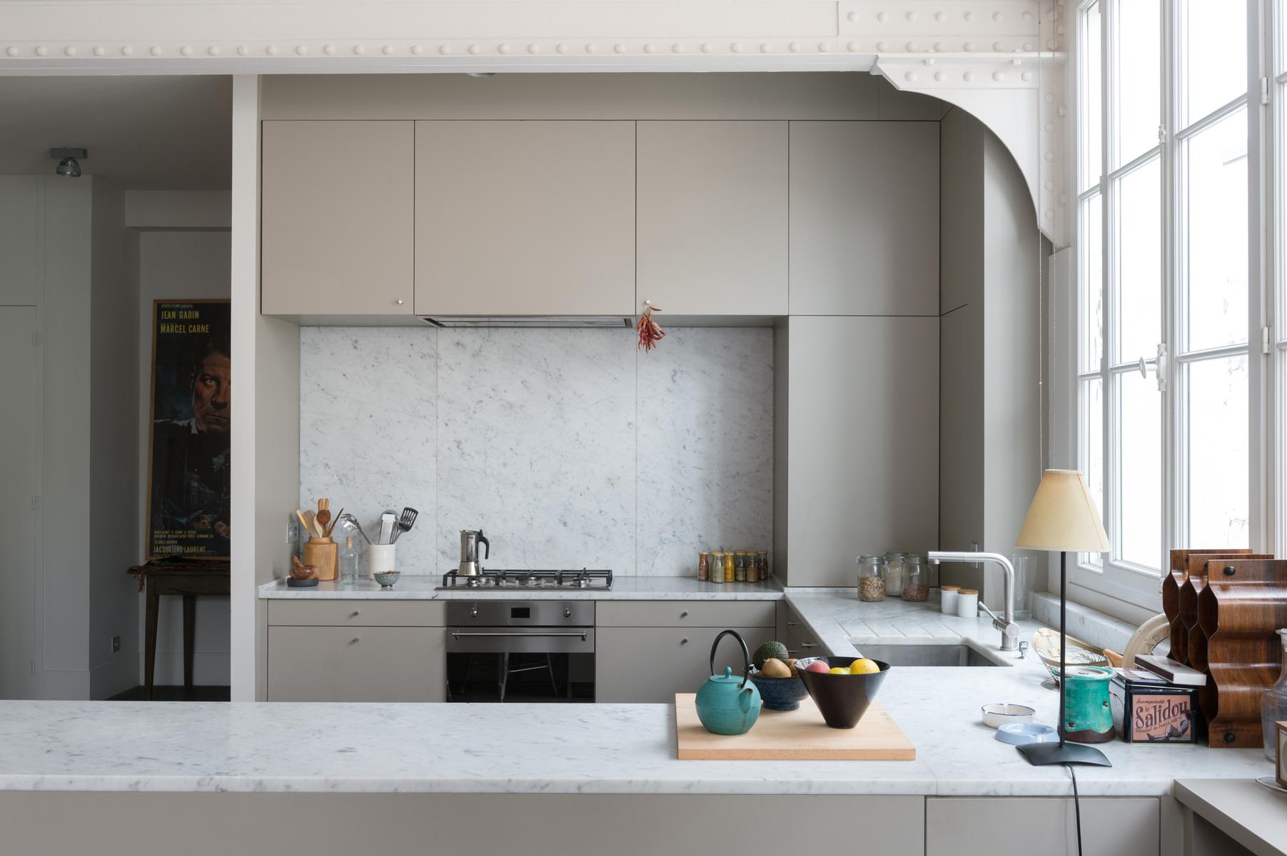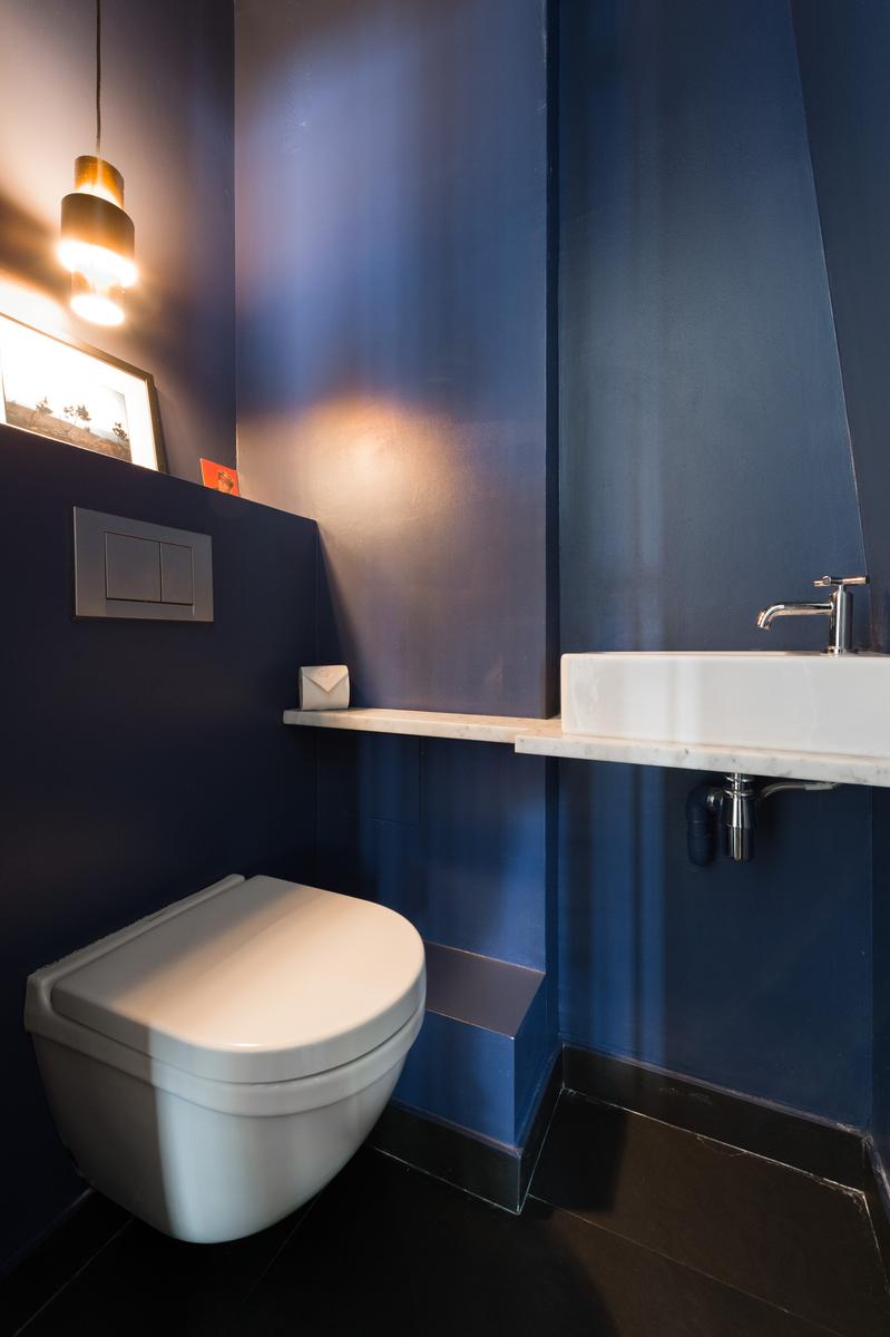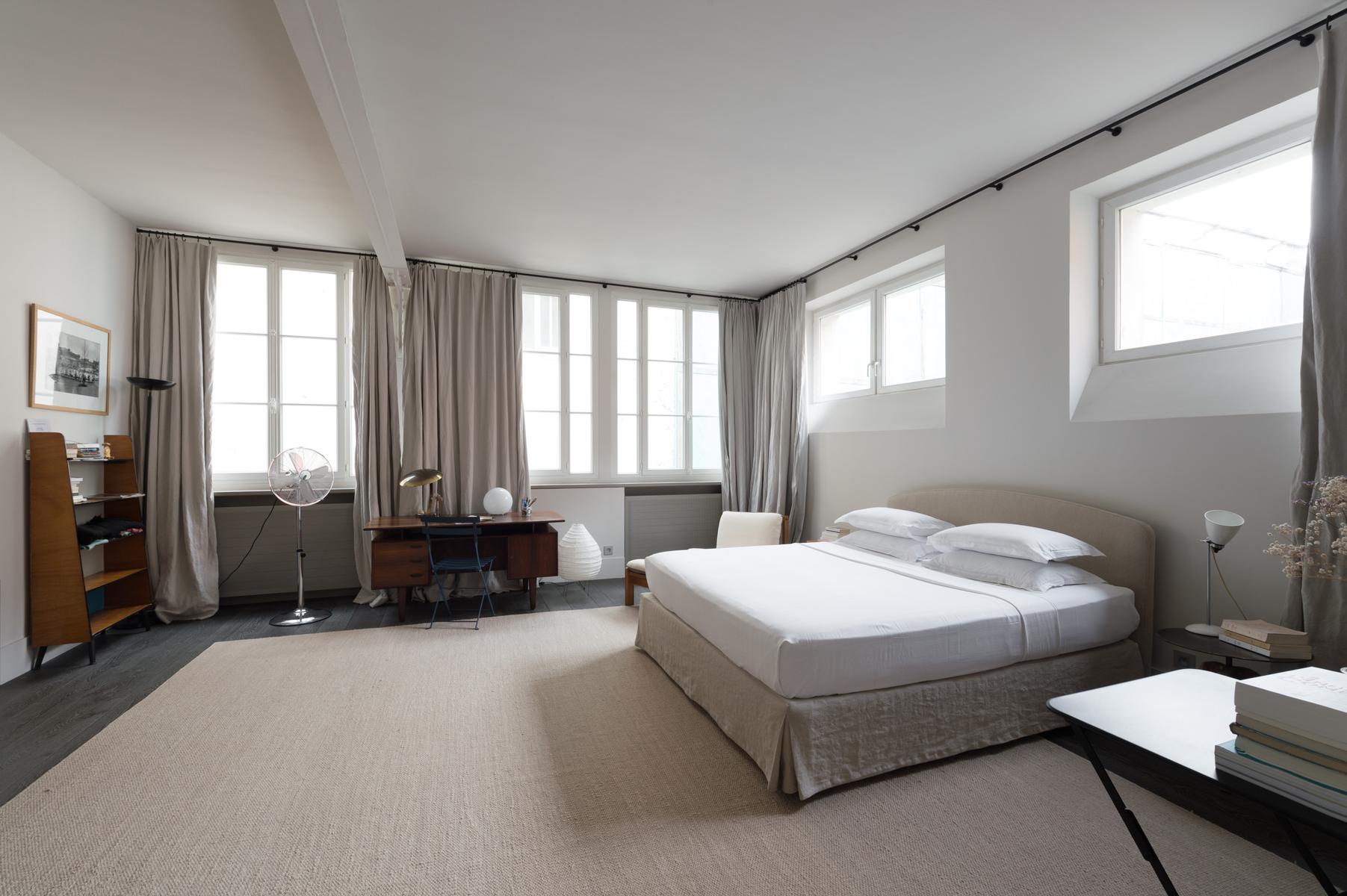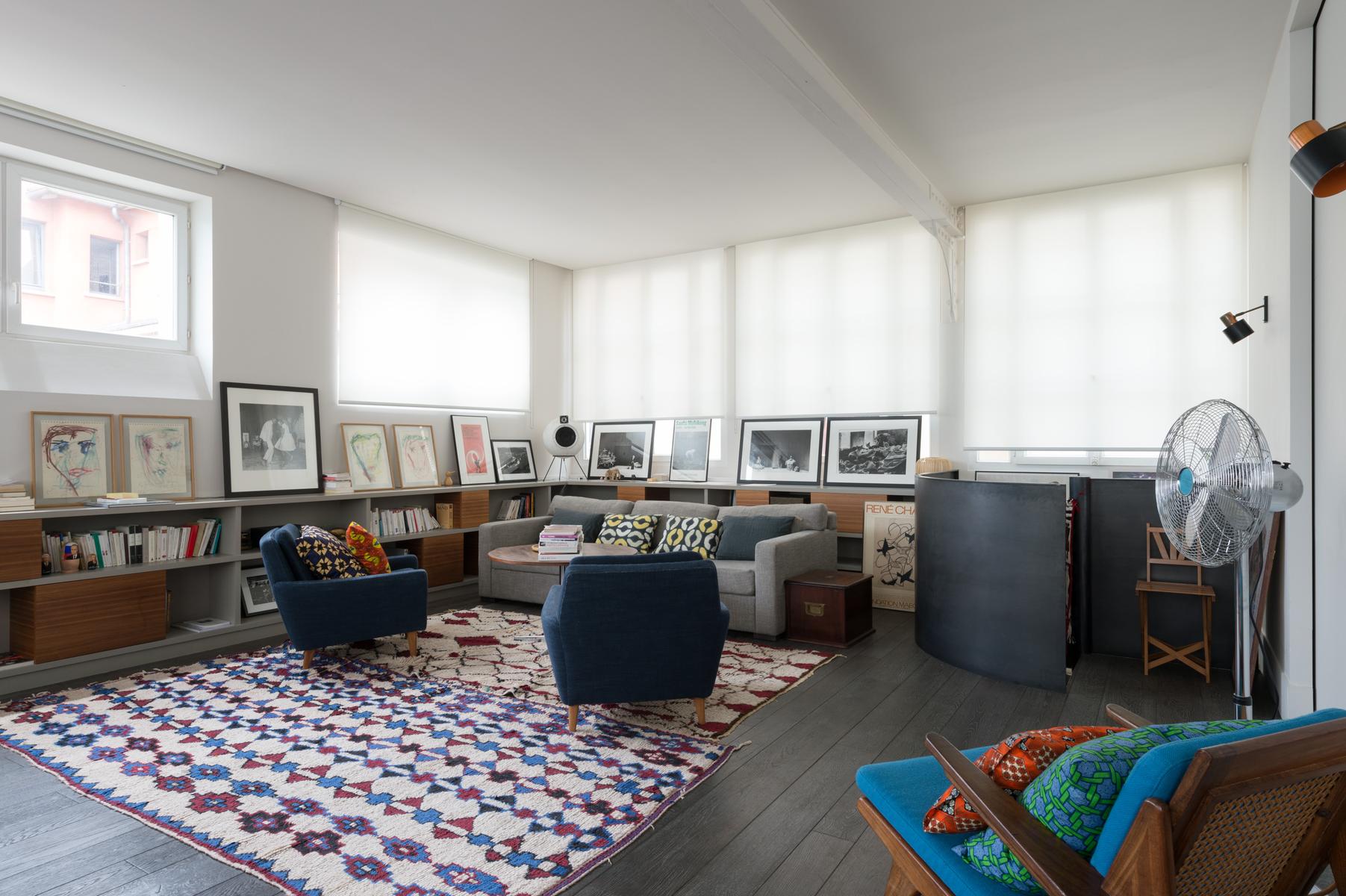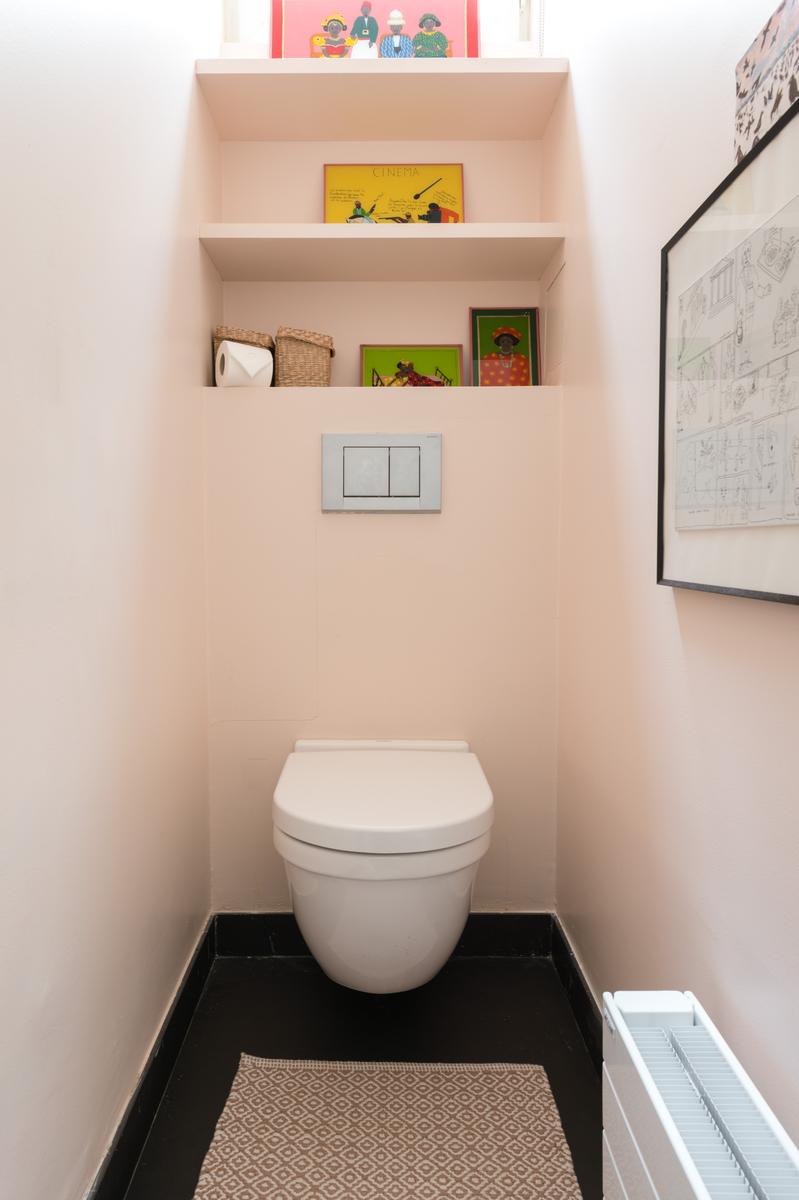 Un design élégant, des affiches de films rétro et une sélection raffinée de meubles – il n’est pas surprenant que le propriétaire travaille dans l’industrie cinématographique. À l’intérieur, il y a un cabinet de toilette à droite, et une salle de bain contemporaine droit devant. Ensuite se trouve la deuxième chambre à coucher (décorée de quelques affiches de films encadrées), puis le salon à aire ouverte sur la gauche. À l’extrémité proche de cette pièce aux larges fenêtres peintes en blanc se trouve la cuisine, qui possède des comptoirs de marbre et un bar assorti pour le petit-déjeuner. Ci-contre, une longue table de salle à manger d’époque, éclairée par des lampes en cuivre. Puis, dans le coin le plus éloigné, vous trouverez le coin salon – avec des meubles aux motifs audacieux et d’élégants alambics en noir et blanc.