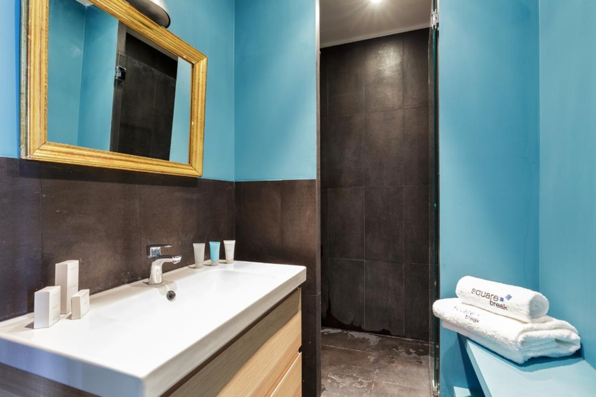 La salle de bain est composée d’un grand lavabo et d’une belle douche à l’italienne en pierre noire. On peut même trouver des livres dans les toilettes séparées.