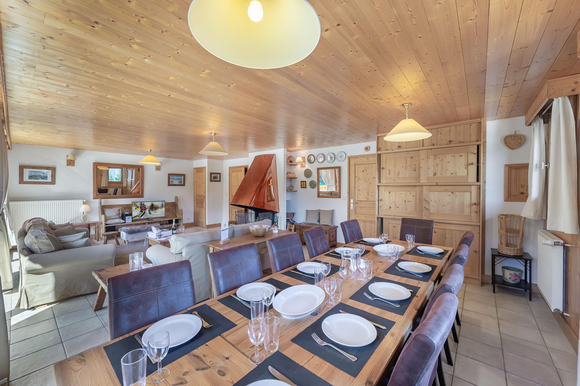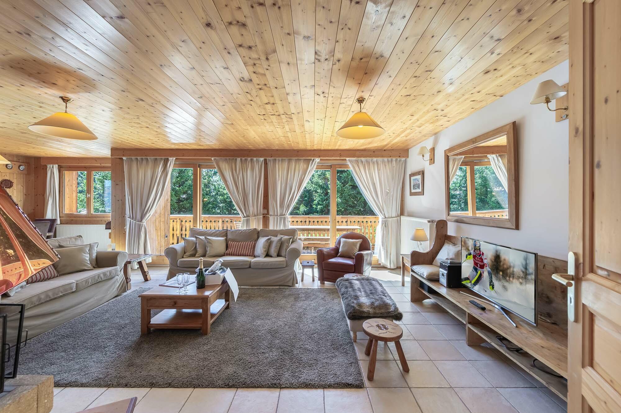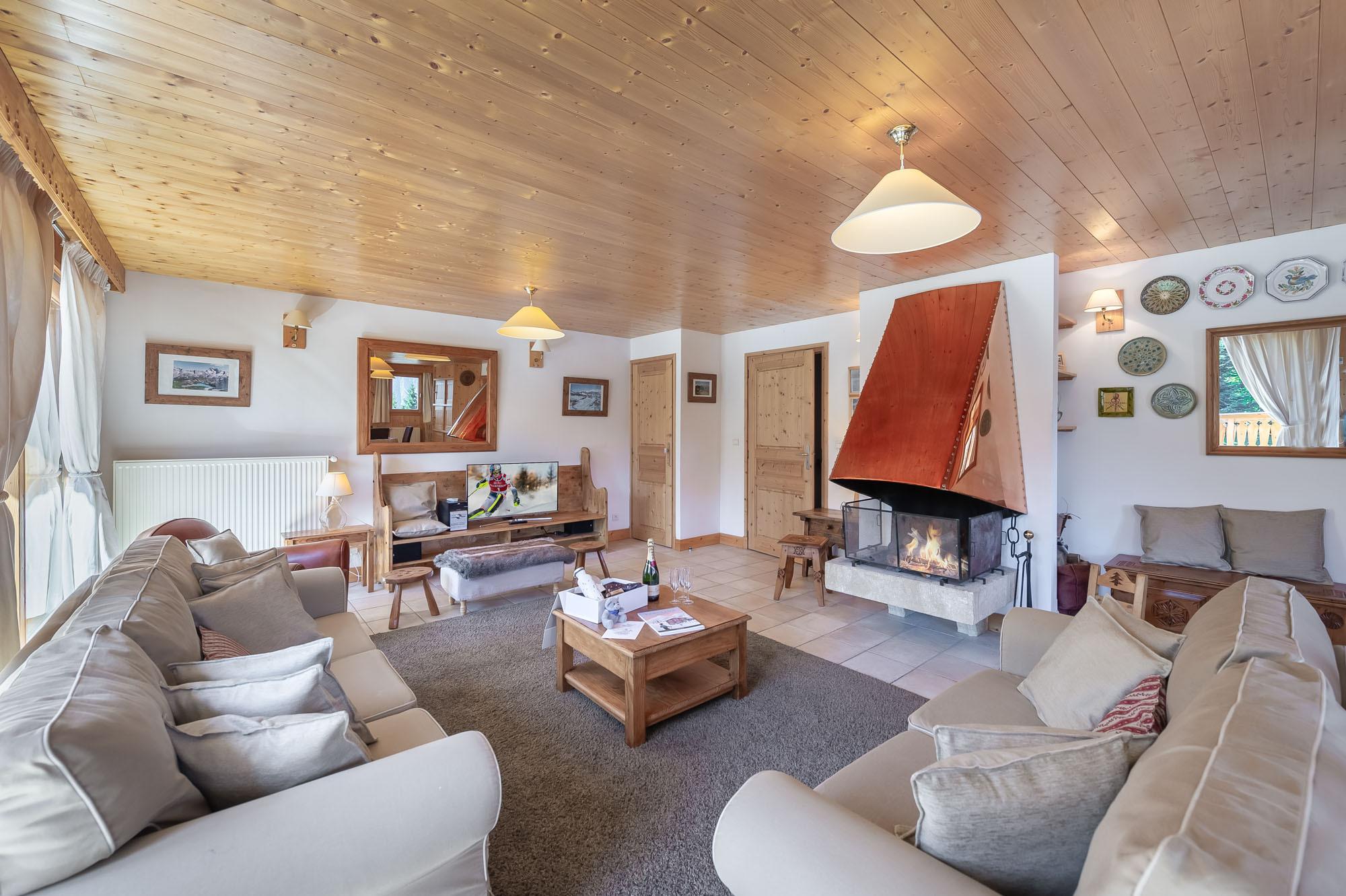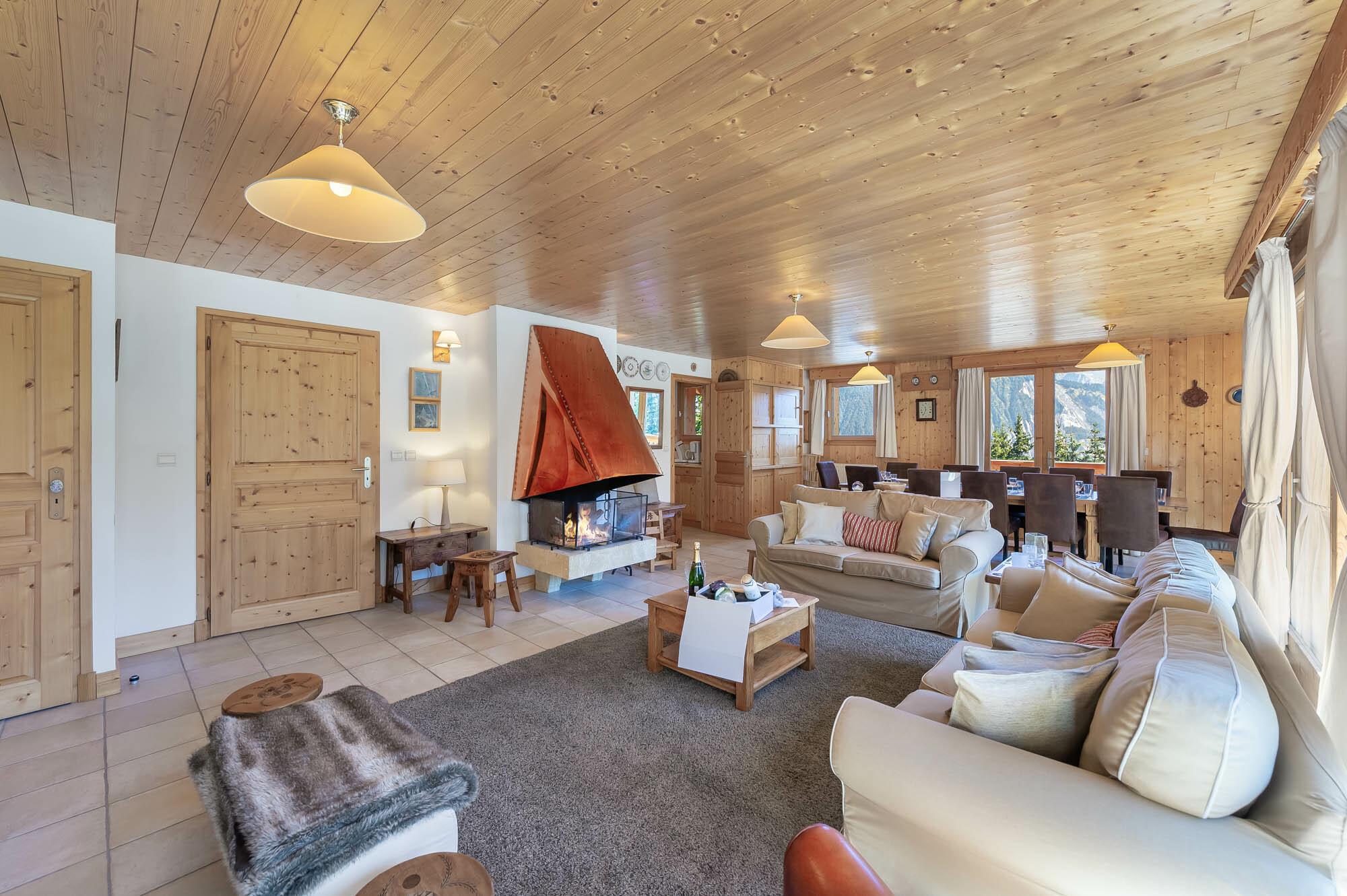Derrière sa façade traditionnelle se cache une atmosphère élégante et conviviale. Les grandes baies vitrées inondent les pièces d’une clarté douce, tandis que la cheminée centrale devient le cœur battant du chalet.