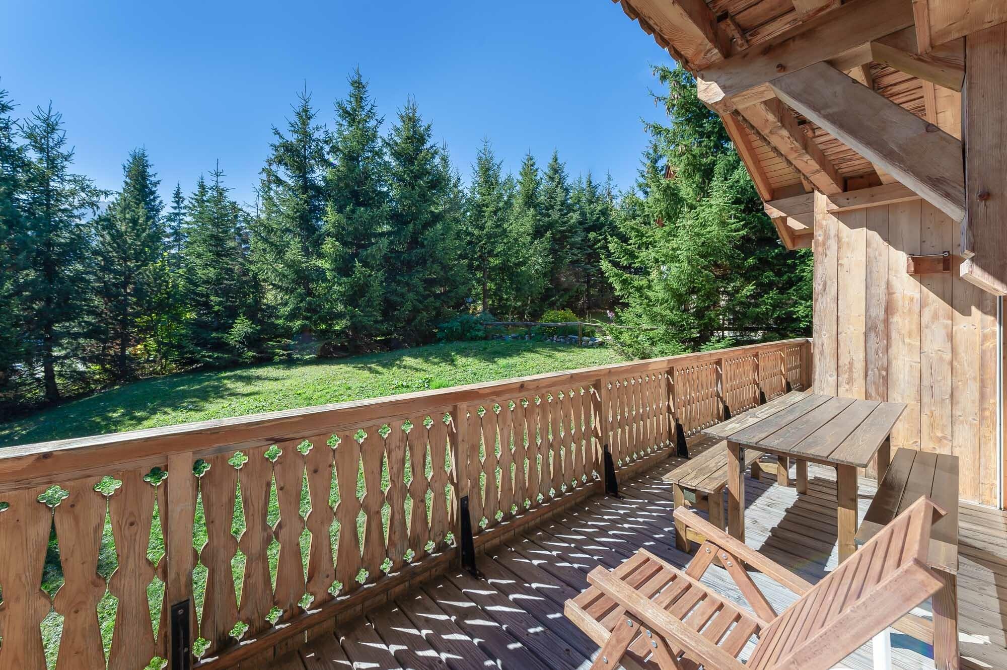 Le salon et la salle à manger s’ouvrent sur une terrasse panoramique offrant une vue splendide sur les sapins et les montagnes environnantes.