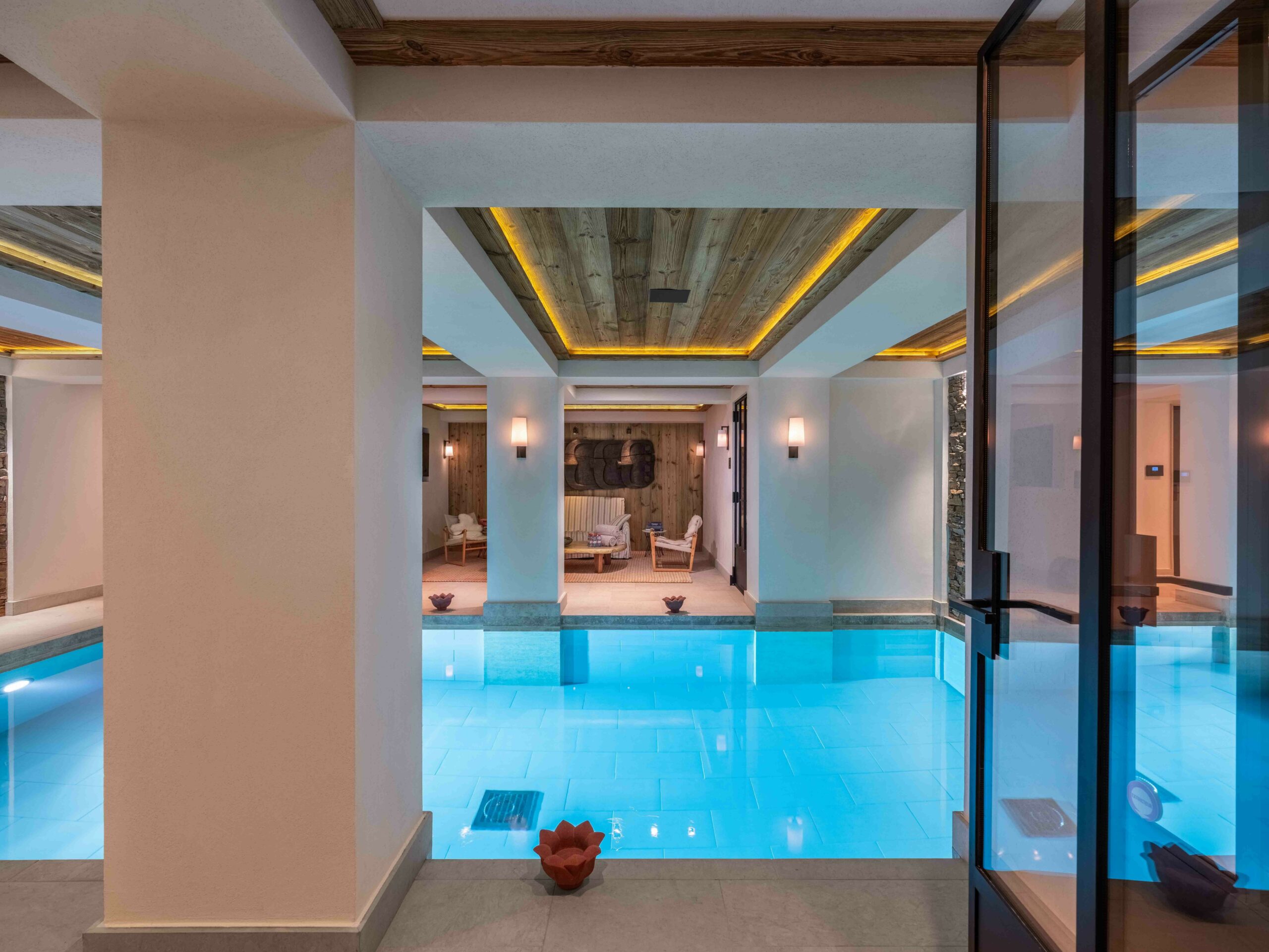 Après une journée de ski, le spa du chalet Manu devient un sanctuaire de détente. La piscine chauffée reflète la lumière douce des bougies, le hammam diffuse des senteurs d’eucalyptus, la salle de sport réveille l’énergie du corps. Plus loin, un salon de cinéma, une bibliothèque et un billard rappellent que la détente se décline aussi dans la convivialité. Tout ici respire le confort et la sérénité d’une vie alpine d’exception.