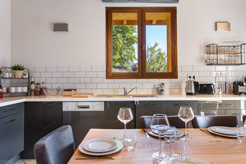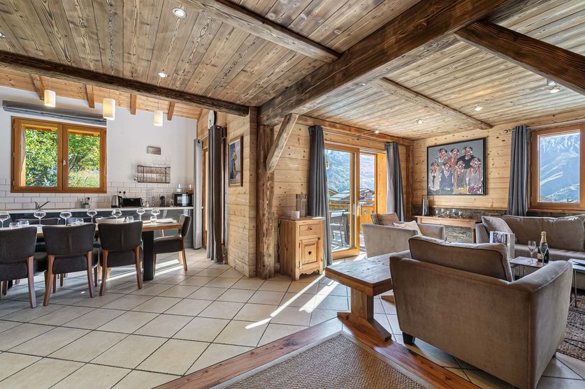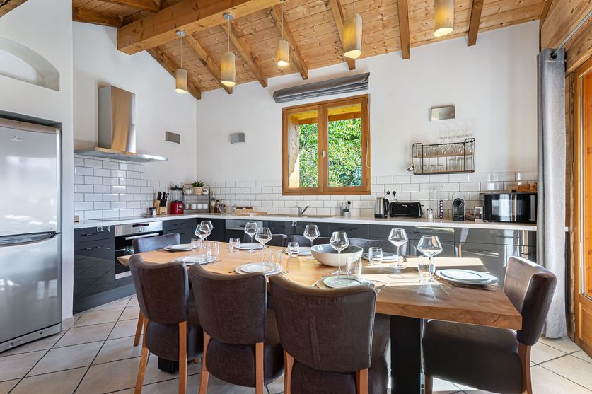 Les pièces de vie sont tout aussi spacieuses et confortables avec une cuisine entièrement équipée ouverte sur le salon. Le mélange de bois et tissus procure au salon un espace intimiste avec la belle cheminée et un coin repas pour recevoir les 10 convives.