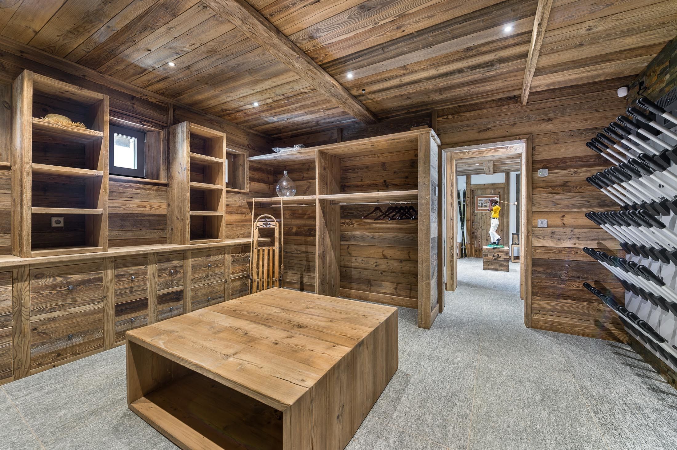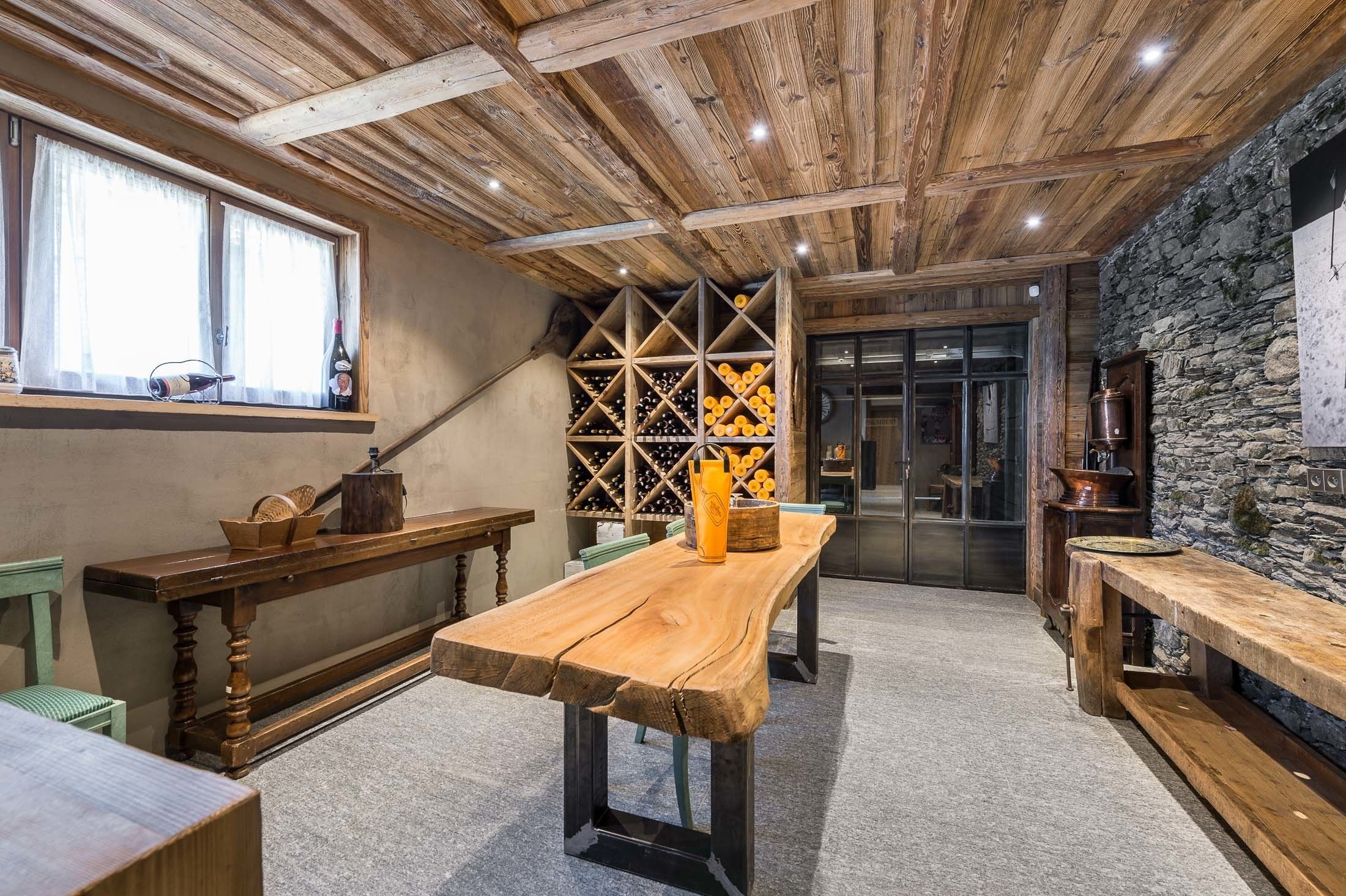 NIVEAU 2/ Entrée du chalet avec local à skis, garage, cellier, buanderie. Un ascenseur pour tous les niveaux du chalet. poêle à bois. 1 WC invité.