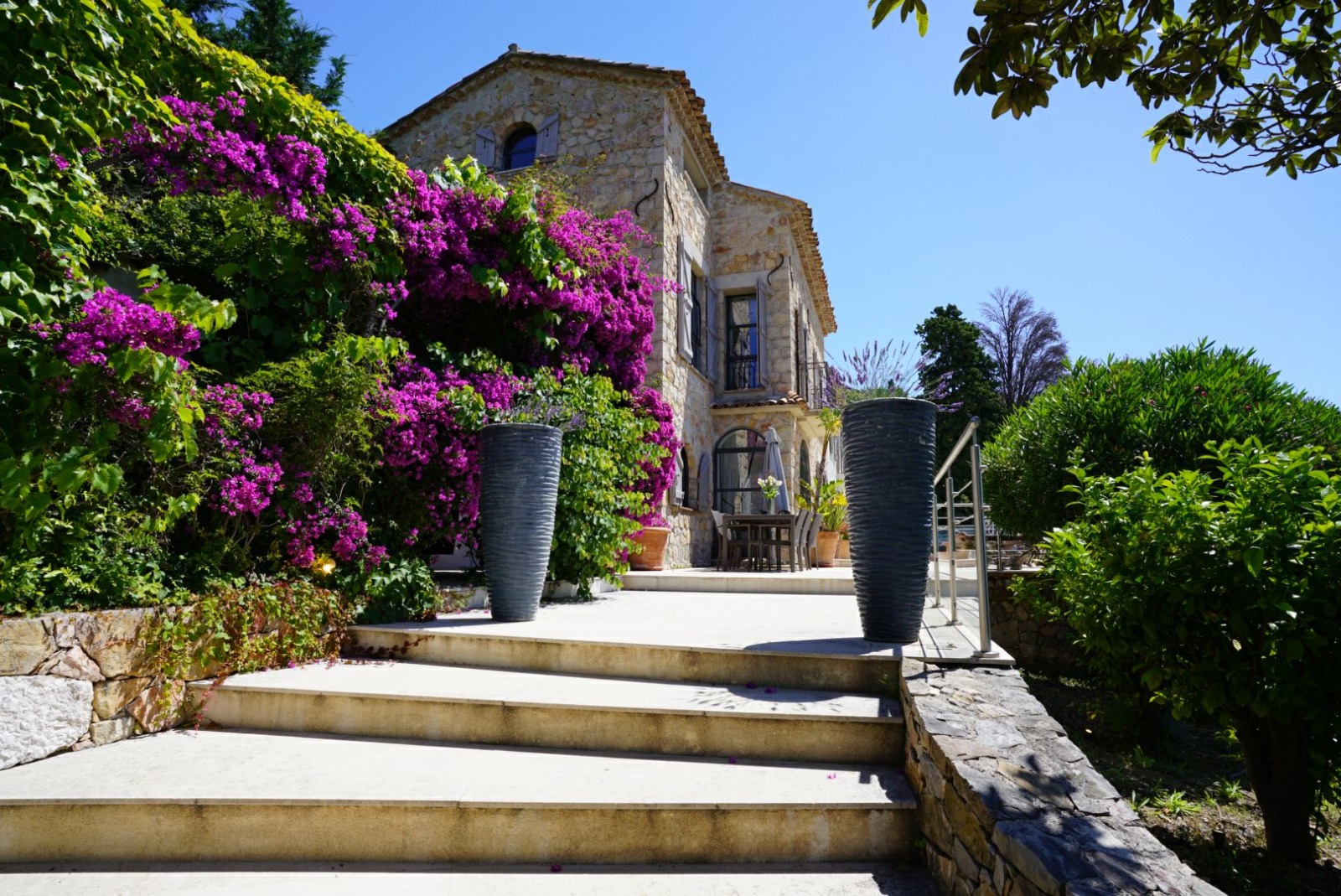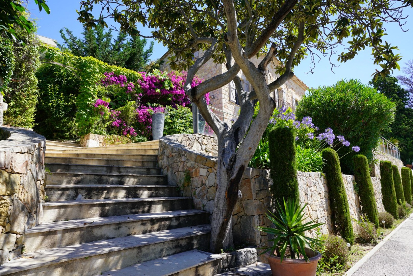 Puis, le jardin est bien entretenu et arboré avec les fleurs de la méditerranée. En fait, la vue est magique avec cette belle vue mer bleue depuis la terrasse.