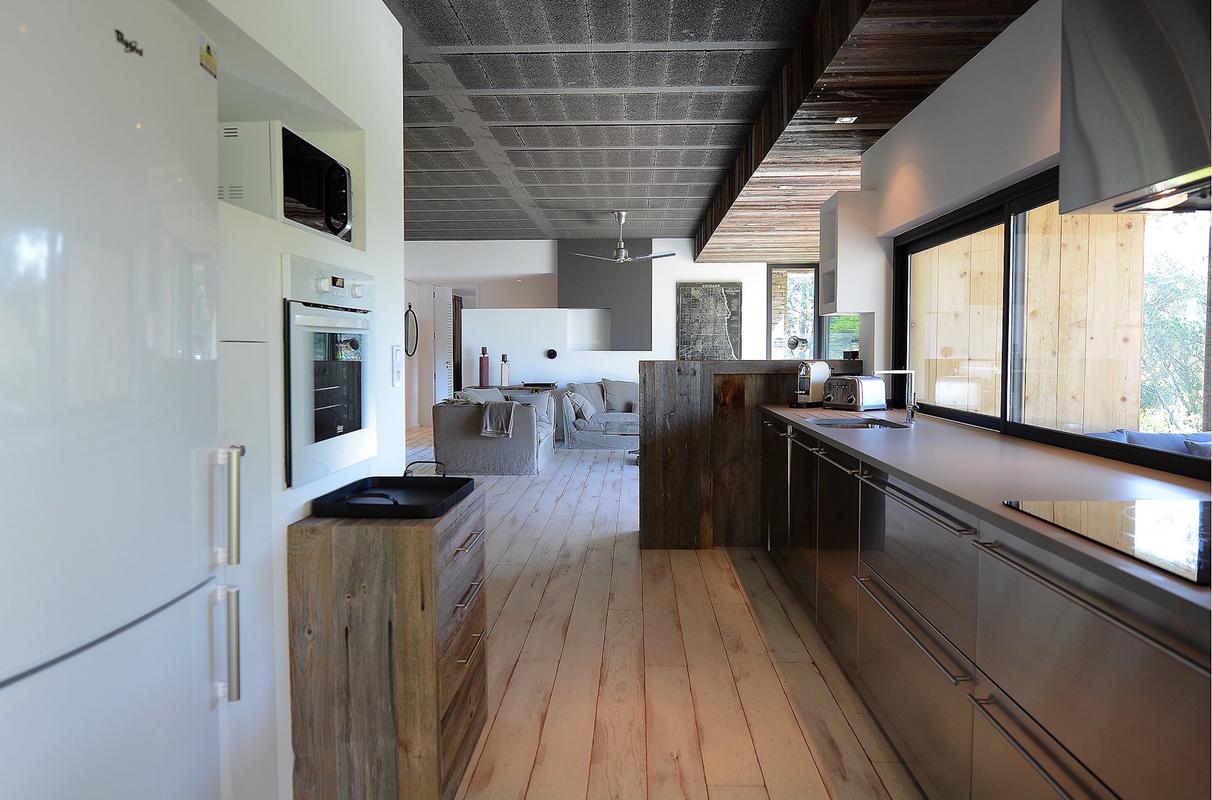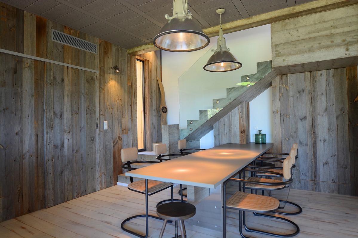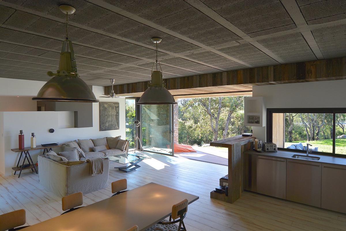 La villa de 180m2 a un intérieur moderne et élégant de style loft, avec des espaces ouverts et des matériaux de haute qualité tels que le bois et la pierre. Les grandes baies vitrées réunissent l’extérieur et en.