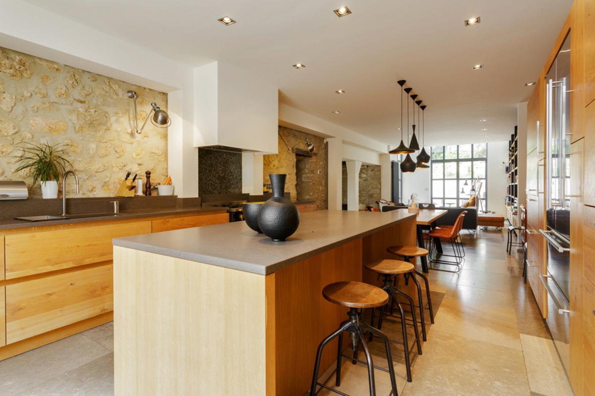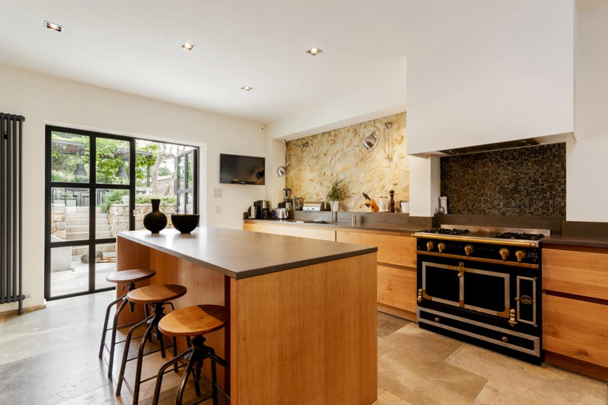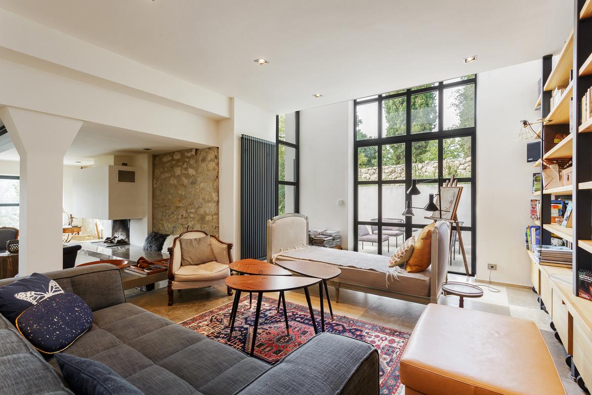 Au rez-de-chaussée, une grande entrée s’ouvre sur la belle cuisine/salle à manger, le cœur de la maison. Merveilleusement bien équipé (poêle La Cornue pour les experts), il s’ouvre d’un côté de la maison, où une salle à manger extérieure a été aménagée sous une tonnelle, légèrement au-dessus de la pièce. De l’entrée et de la cuisine, on accède aux deux espaces de vie : la salle de lecture et la salle de musique, à la fois cosy et élégant. Dans l’entrée, à votre droite, une salle de télévision avec un canapé confortable et des toilettes attenantes.