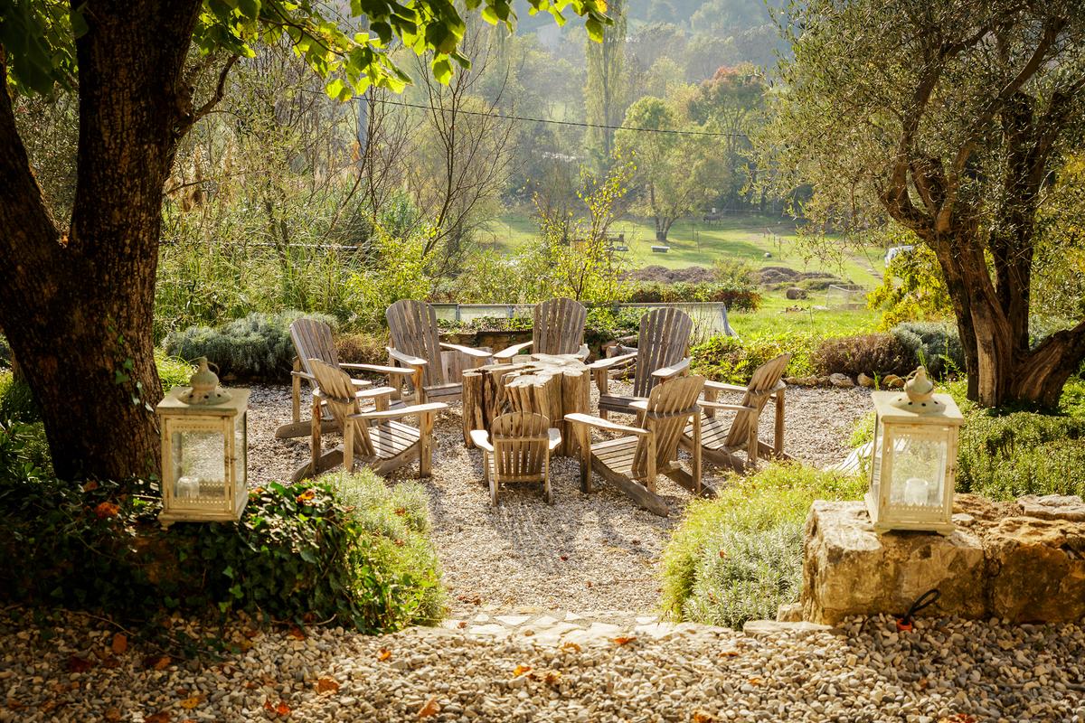 Devant la ferme, la belle terrasse ombragée est l’endroit idéal pour se réunir autour d’un verre à toute heure de la journée, avec vue sur un paysage magnifique.