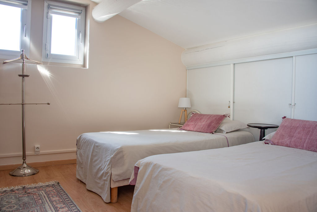 Au dernier niveau, une suite en sous pente, 2 lits de 90 avec salle de bain en suite et une petite terrasse très sympatique.