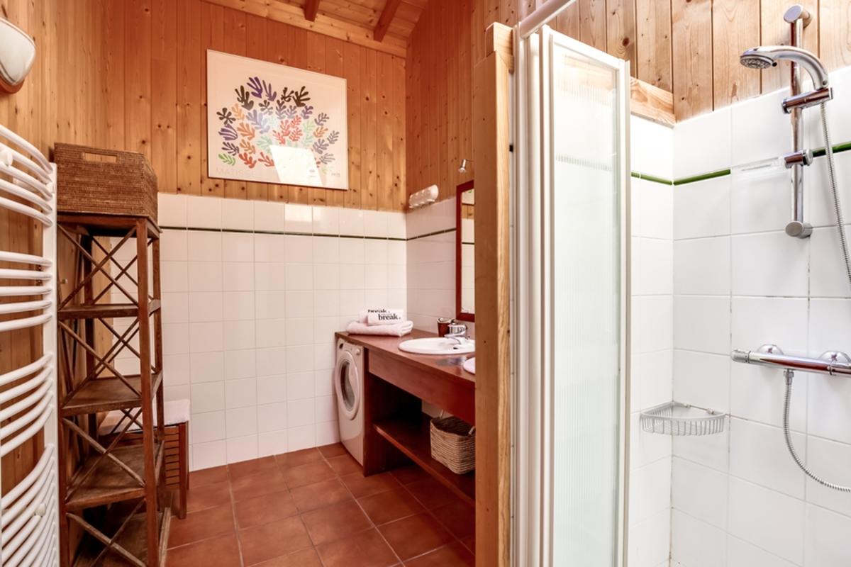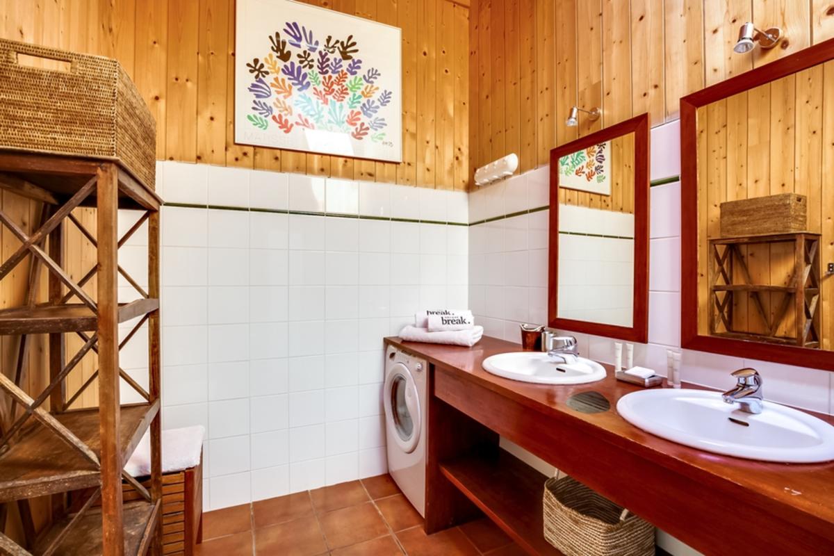 – grande salle de bain avec douche, lavabo double et machine à laver