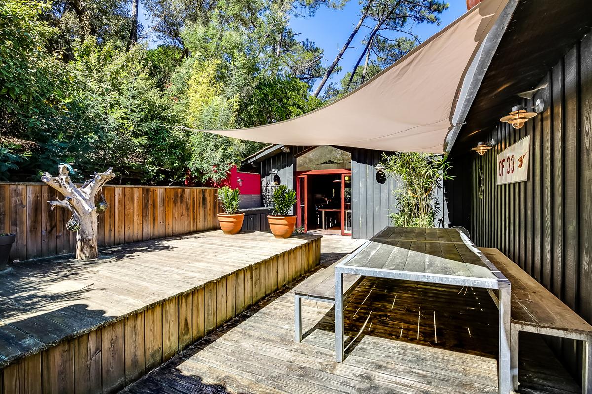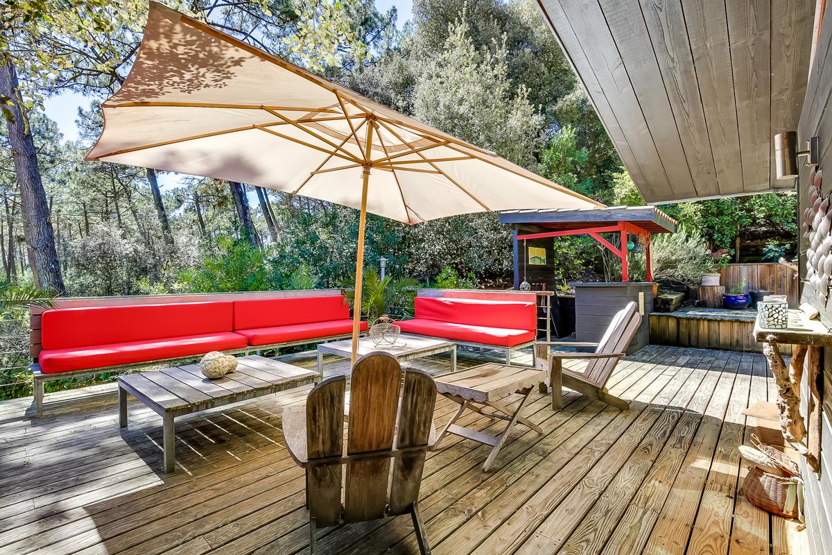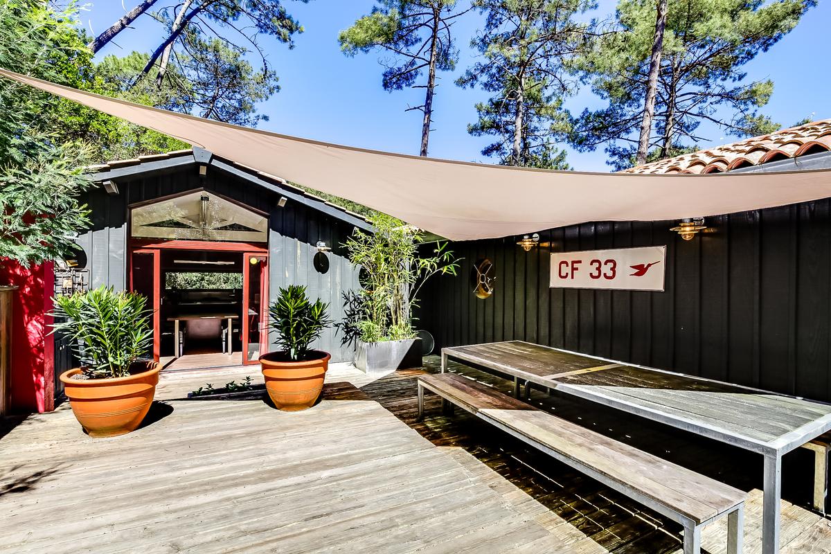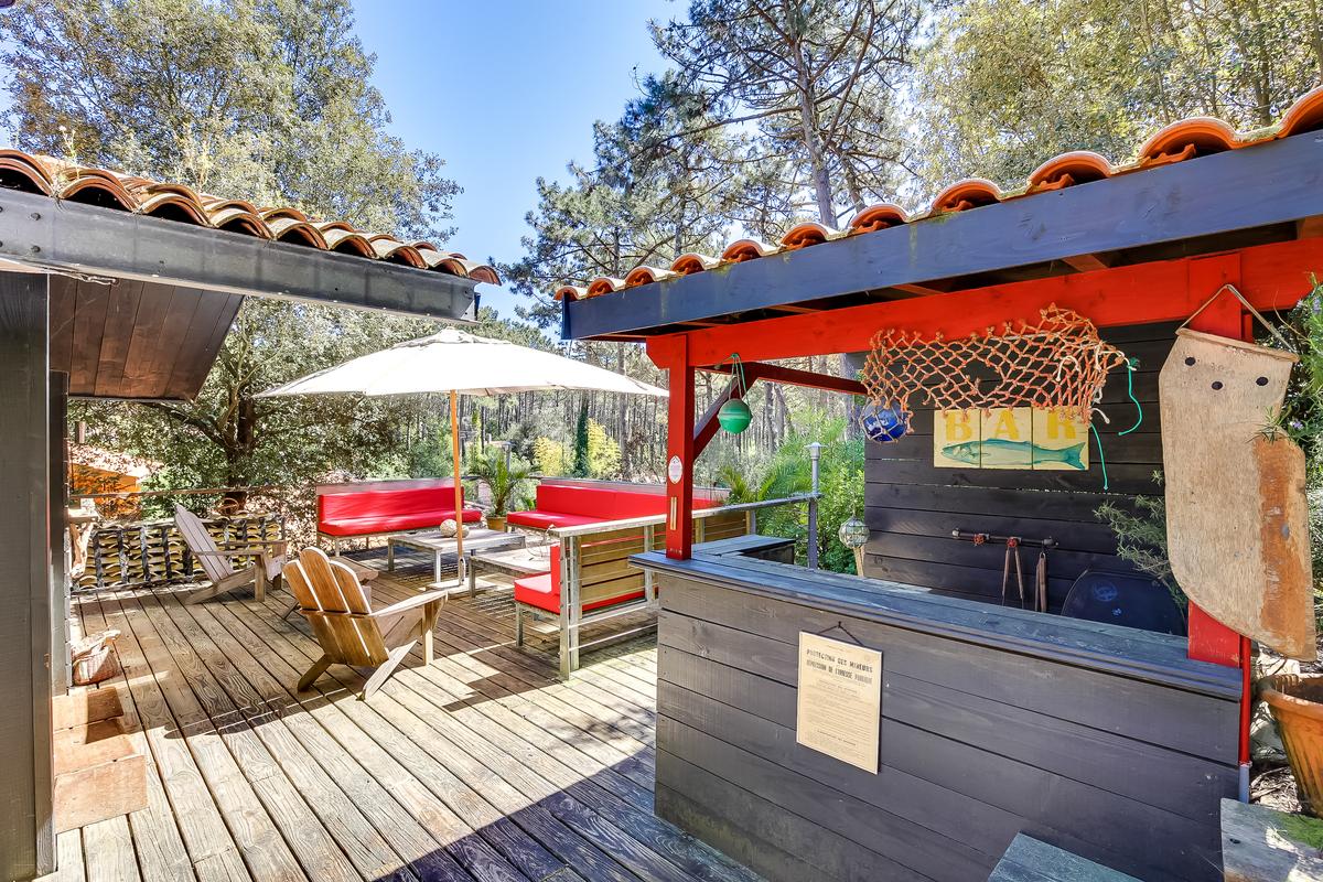 – terrasse avec salon extérieur, grande table pour manger à l’abri du soleil à l’ombre d’un tissu, véritable bar à huîtres, grill