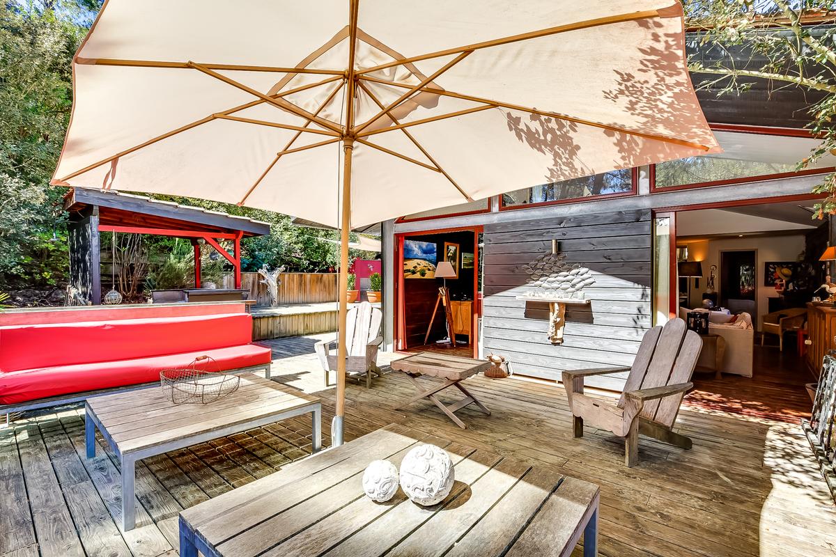 La magnifique terrasse est la pierre angulaire de la maison, un espace de vie avec salon, salle à manger et véritable bar à huîtres. La villa est organisée sur deux niveaux épousant la pente du terrain. En effet, vous pouvez vivre aussi bien à l’extérieur qu’à l’intérieur, en vous déplaçant librement. La décoration reflète l’esprit de l’endroit, chaleureux et un gage de qualité pour cette villa.