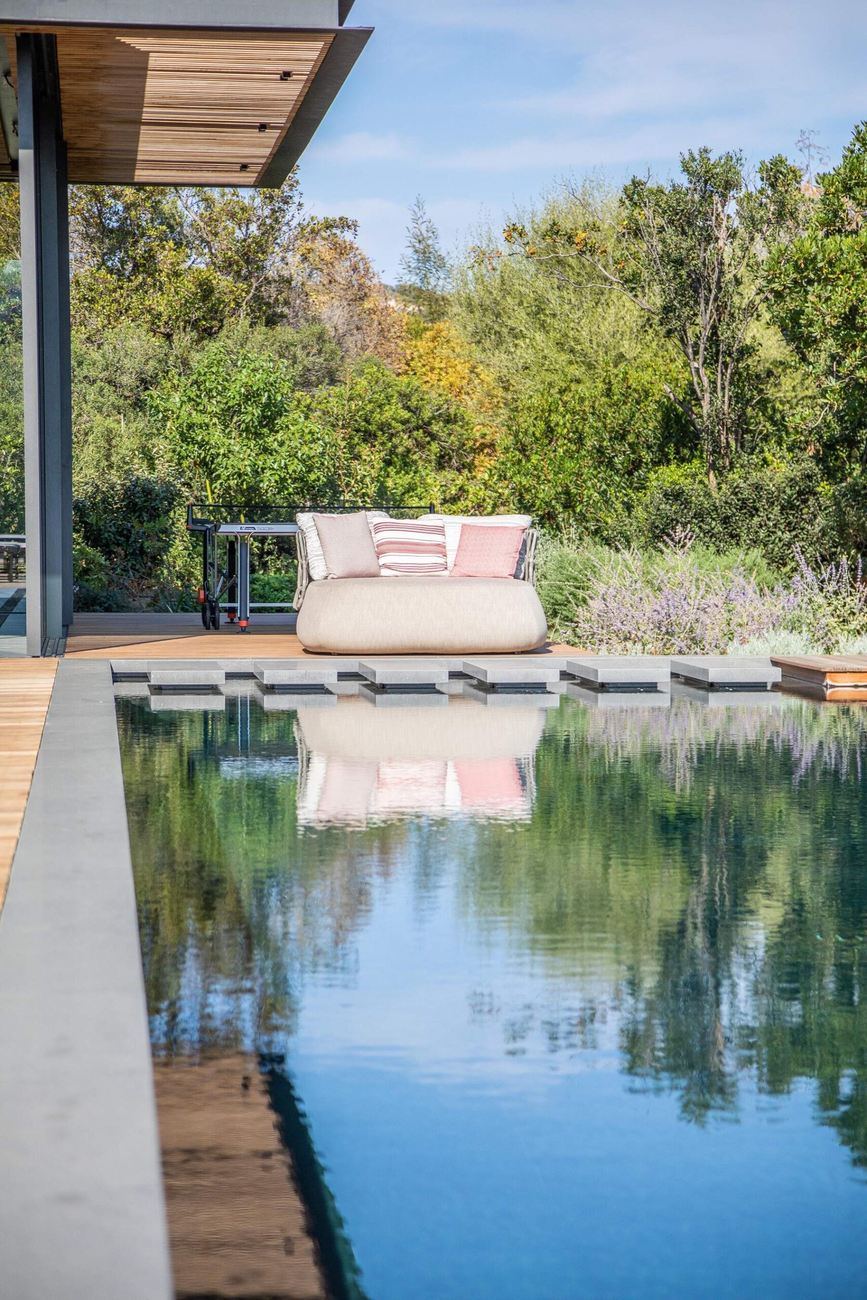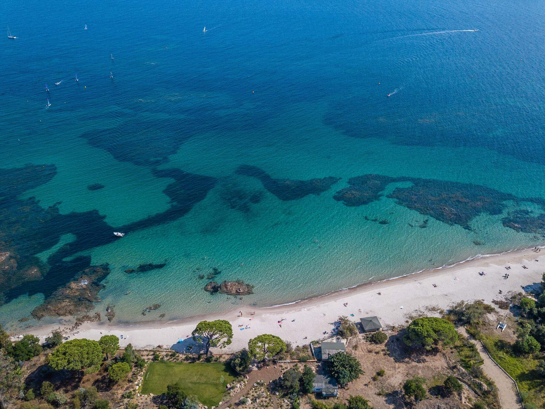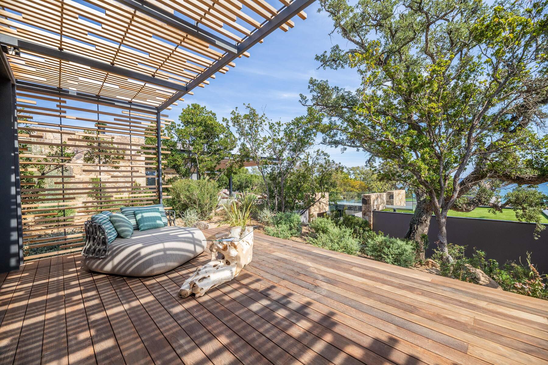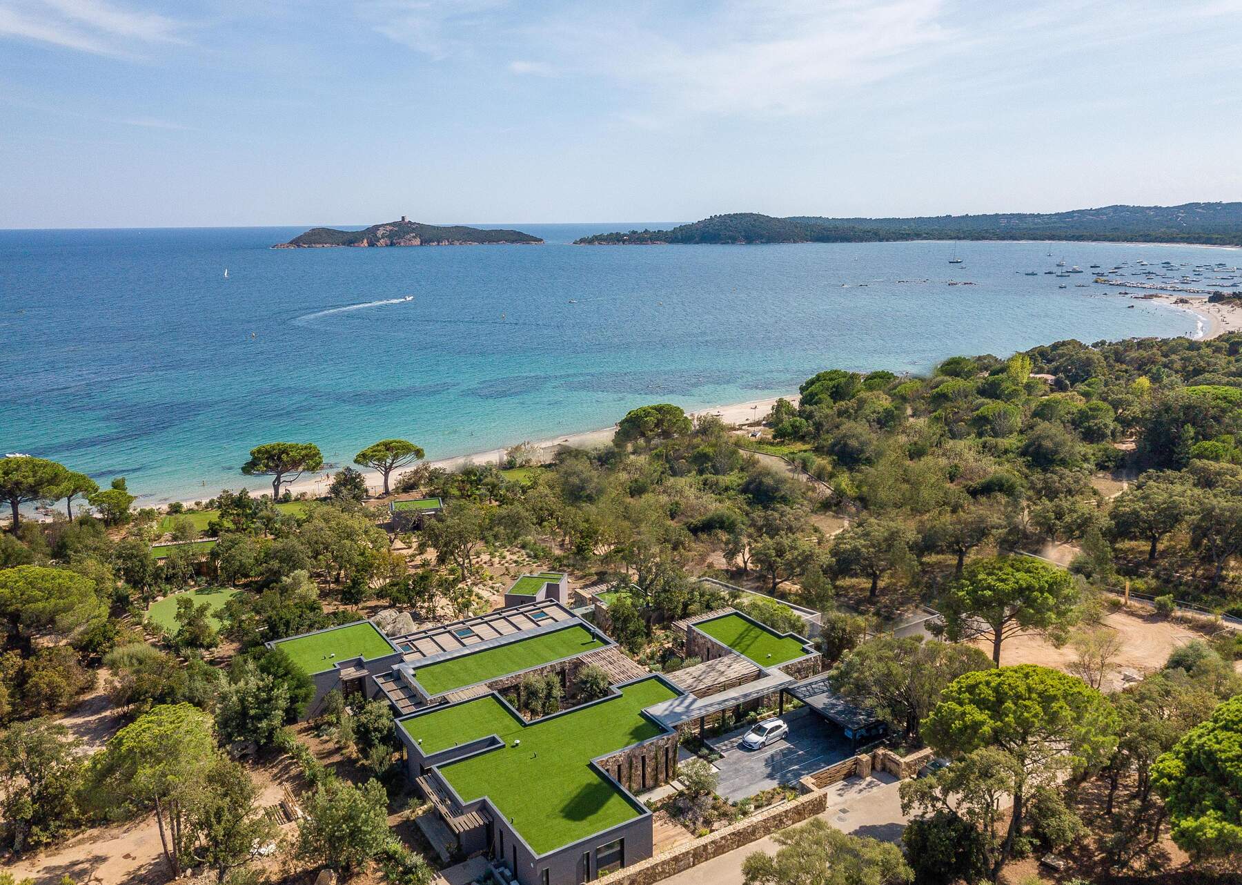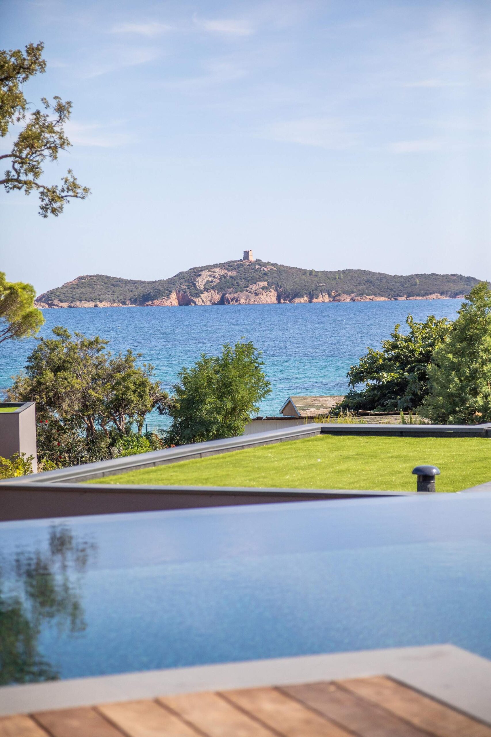 Le jardin arboré avec des essences méditerranéenne donne un air de maquis Corse à ce coin idyllique. Puis, la piscine à débordement, un couloir de nage, chauffée avec nage à contre courant et hydromassage. En effet, cette villa offre toutes les prestations sportives telles que hammam, jacuzzi, fitness, salle de sport, salle de massage. Les espaces ludiques sont nombreux pour le plaisir de chacun, terrain de boules, bar extérieur, terrain de football, ping Pong et Putting green. De plus, équipements nautiques à votre disposition, kayacs, paddles, location de bateaux possible également. A noter libre accès au golf.