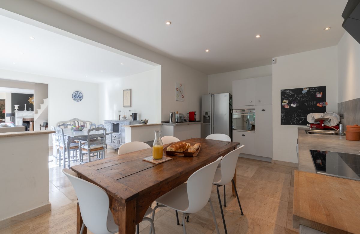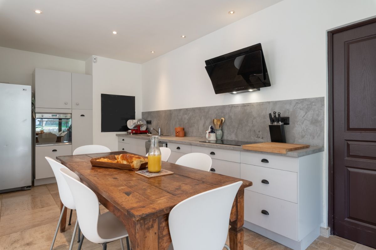 Puis, les pièces de vie très spacieuses, avec cuisine entièrement équipée ouverte. Des espaces très conviviaux, notamment le salon avec cheminée, mur en pierre. De plus une salle à manger très contemporaine ouverte sur l’extérieur par de grandes baies.