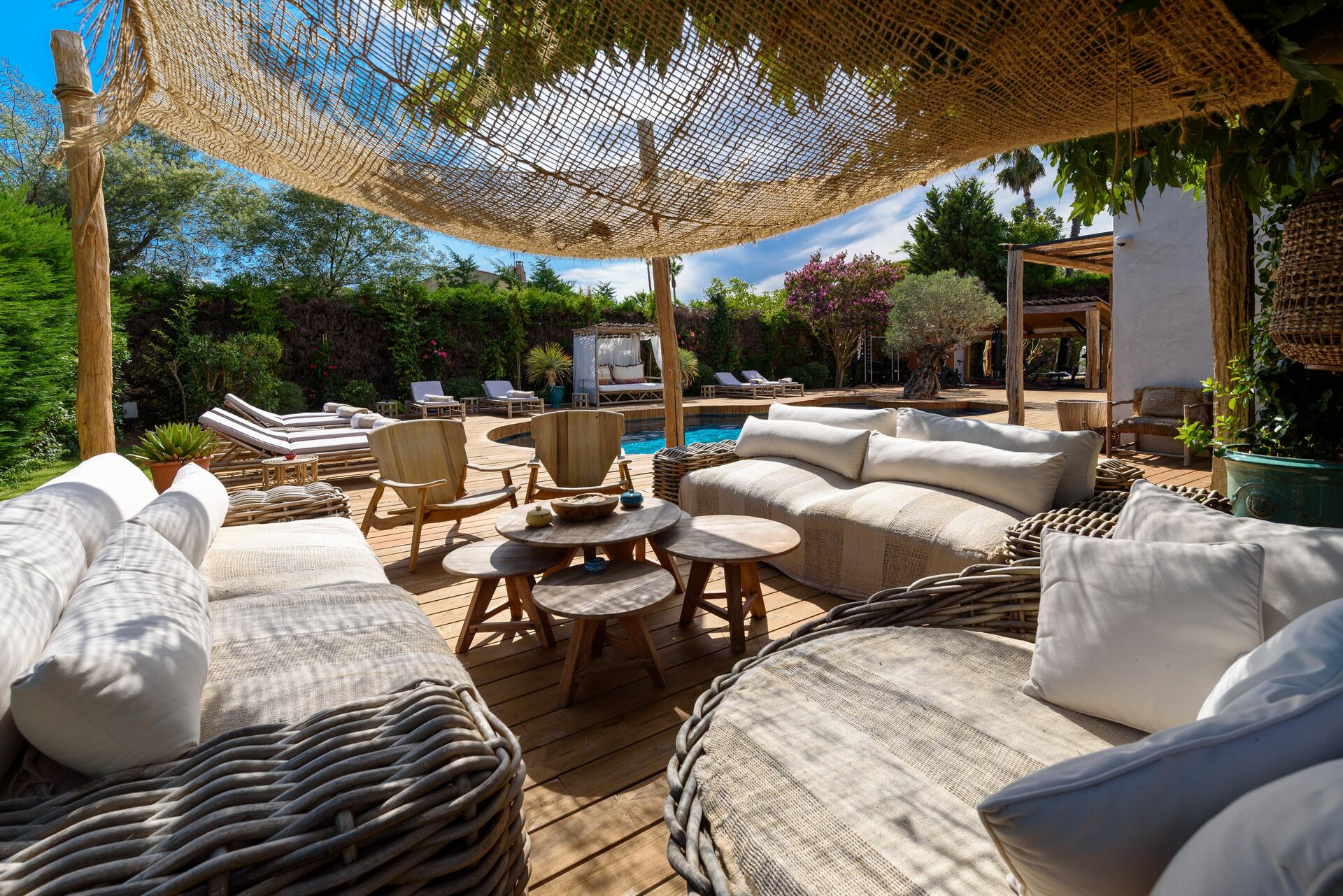 La villa à louer se compose de 5 chambres doubles, 5 salles de bain attenantes. Puis, une cuisine équipée, une salle à manger, un grand salon avec 4 canapés confortables. En effet, la villa Cicadis peut accueillir jusqu’à 10 convives.