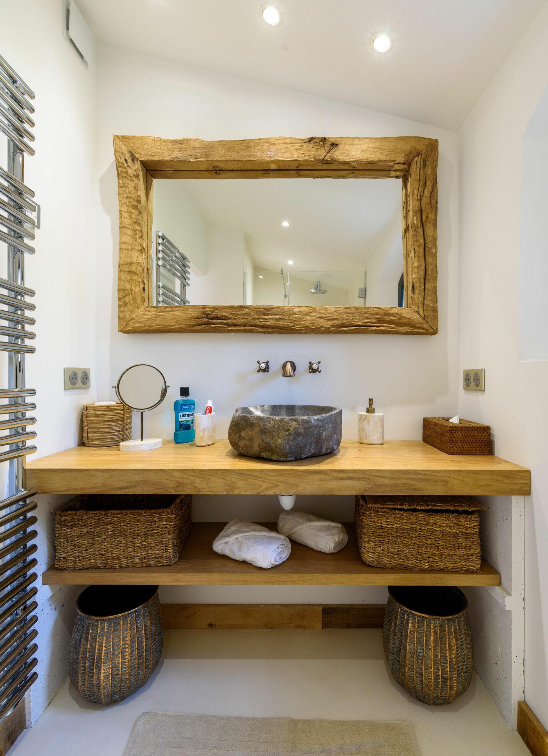 La décoration intérieure allie simplicité et élégance, utilisant des matériaux nobles et authentiques. En fait, la noblesse du chêne massif, du châtaignier ou du béton ciré blanc. En effet, les tons clairs et naturels rendent l’atmosphère agréable et paisible.