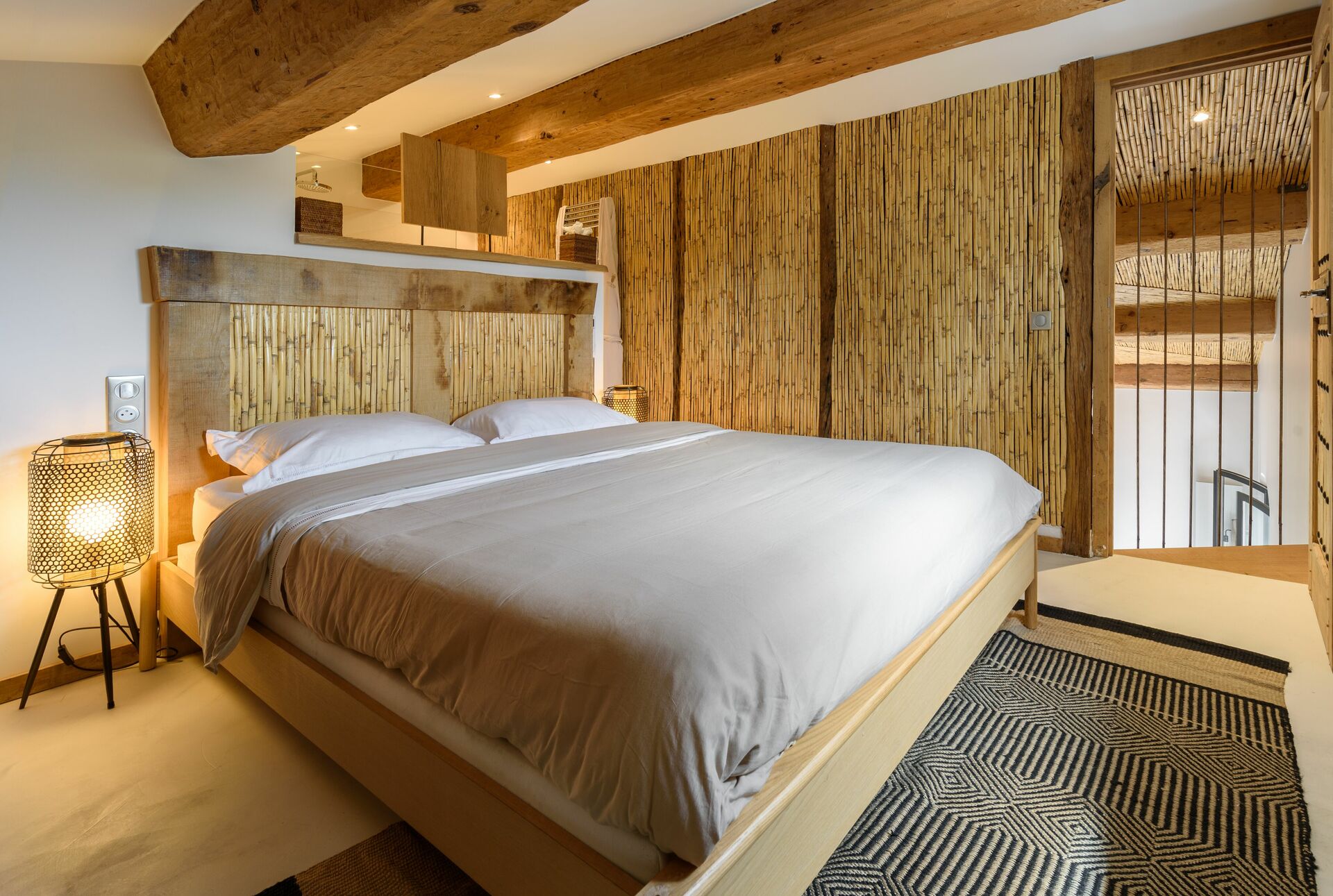 Puis, les cinq chambres ont chacune leur salle de bain privative, penderie. Elles sont aménagées dans le même esprit que les pièces communes, avec des tons chauds et boisés.