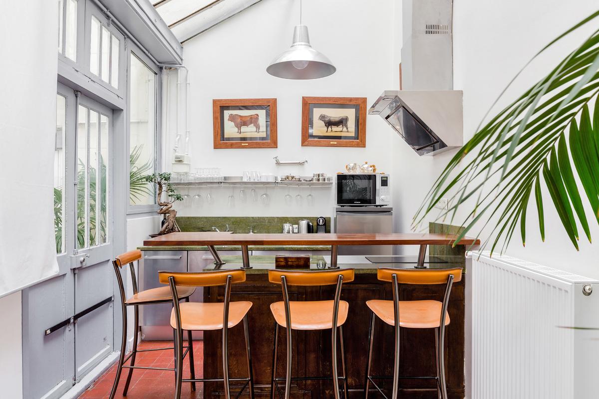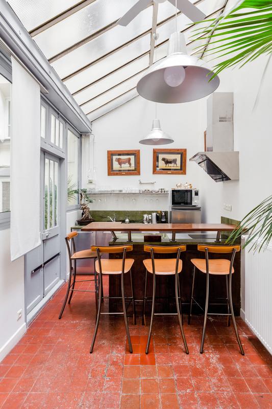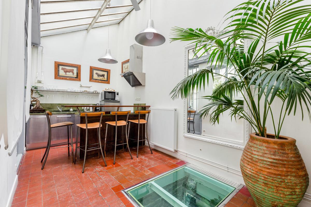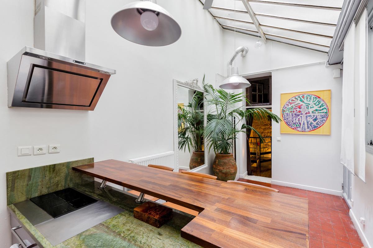 Vous entrez par la cuisine qui a un toit en verre. Plein de lumière, charmant, avec un bar et une table haute pour les repas. Le salon, qui mène également à la cour, se trouve à côté de la cuisine et dispose d’un canapé et d’un téléviseur à écran plat