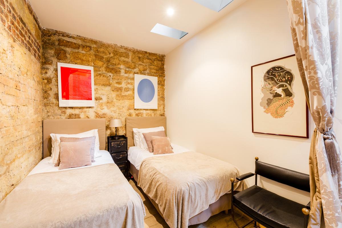 La disposition inhabituelle de l’appartement en fait un espace parfait pour une famille de quatre personnes, une cachette merveilleusement meublée.