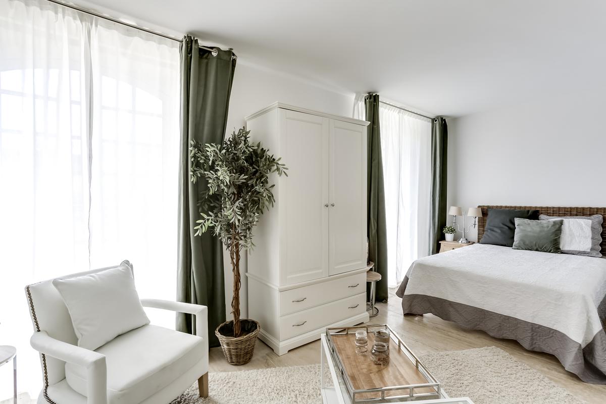 – Petite chambre à coucher menant au jardin sur le côté de la route, avec lit king size