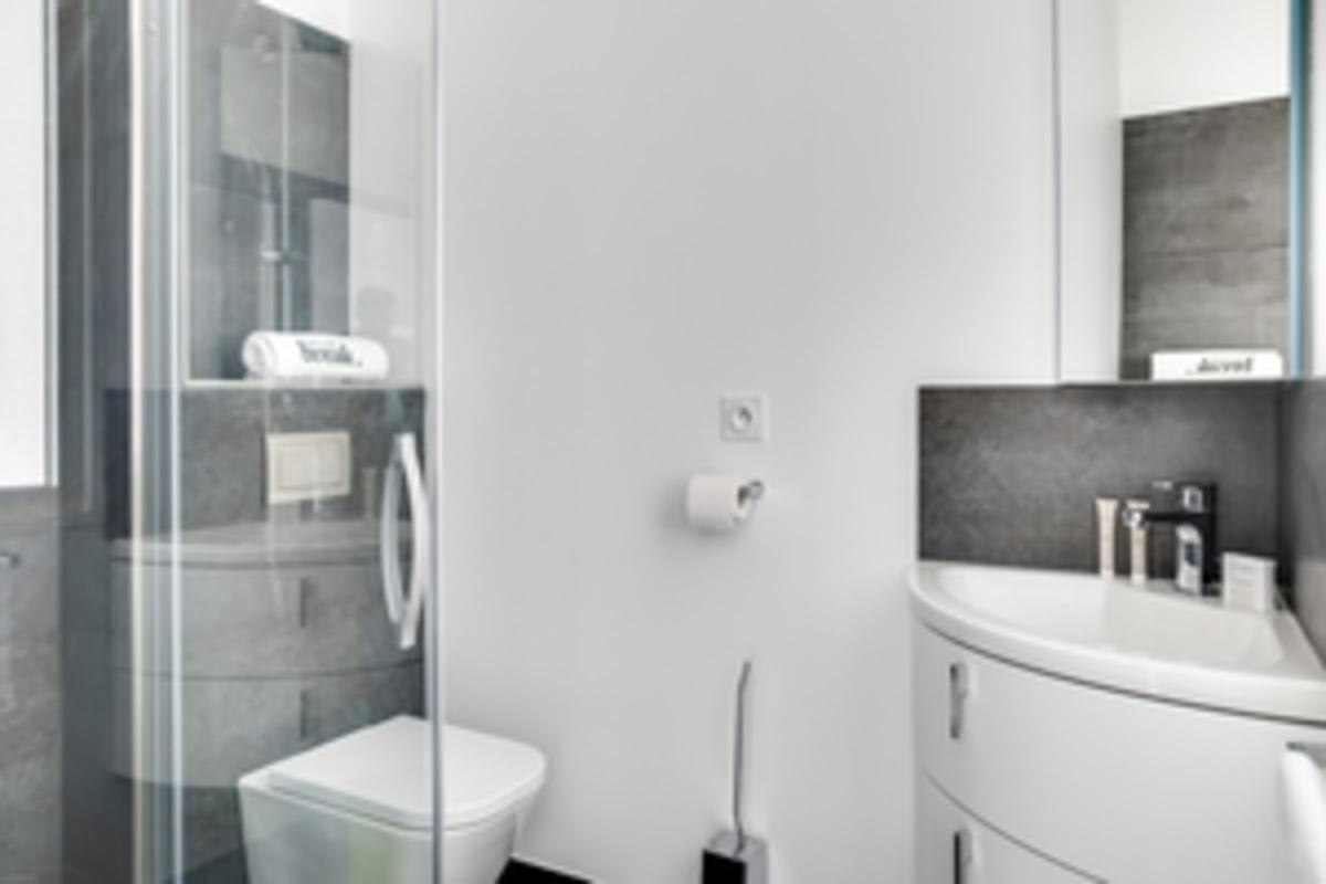 – Un ascenseur descend du parking jusqu’à la maison, pratique pour les bagages et les courses, ou pour les personnes à mobilité réduite, qui sont les bienvenues ici. L’une des salles de bains a une douche et un lavabo accessibles.