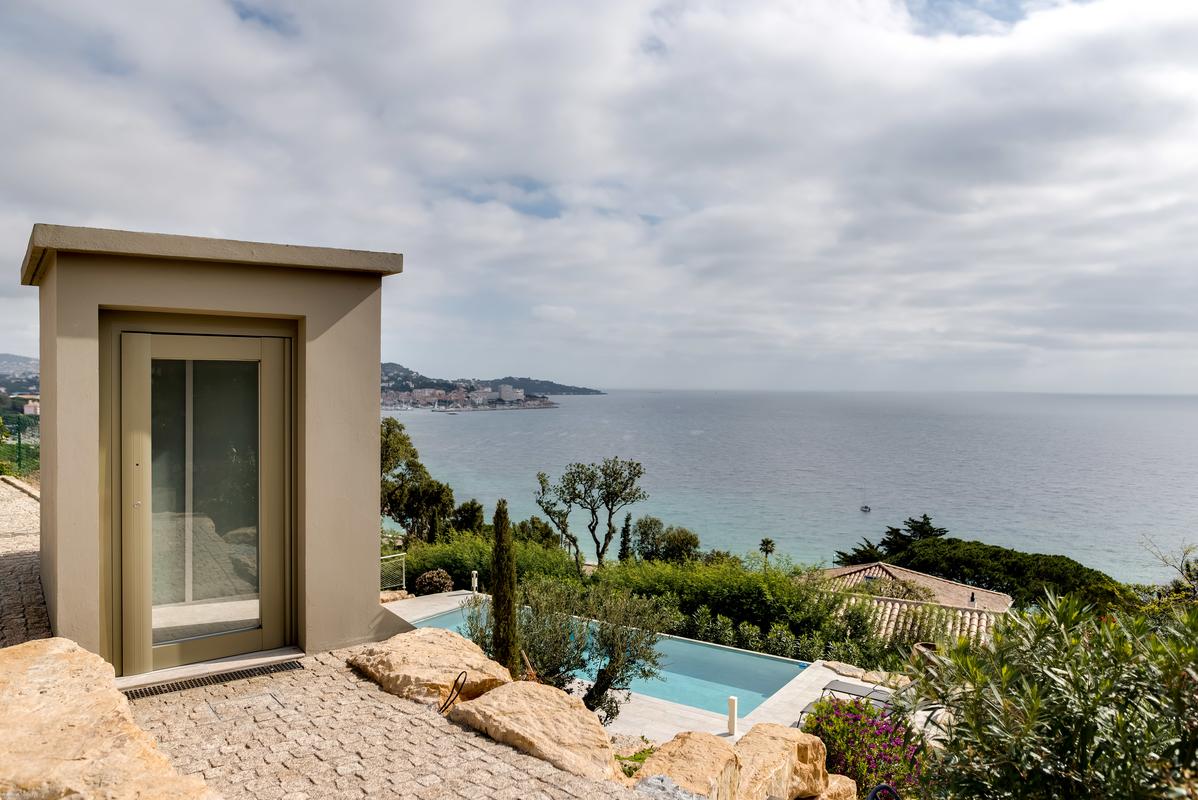 Dans une végétation abondante, encastrée dans les rochers, la maison forme un bel arc de cercle et mène directement à l’immense terrasse. Sans vis à vis et complètement privé, sans sacrifier aucune sécurité comme c’est le cas dans un domaine privé composé de plusieurs villas.