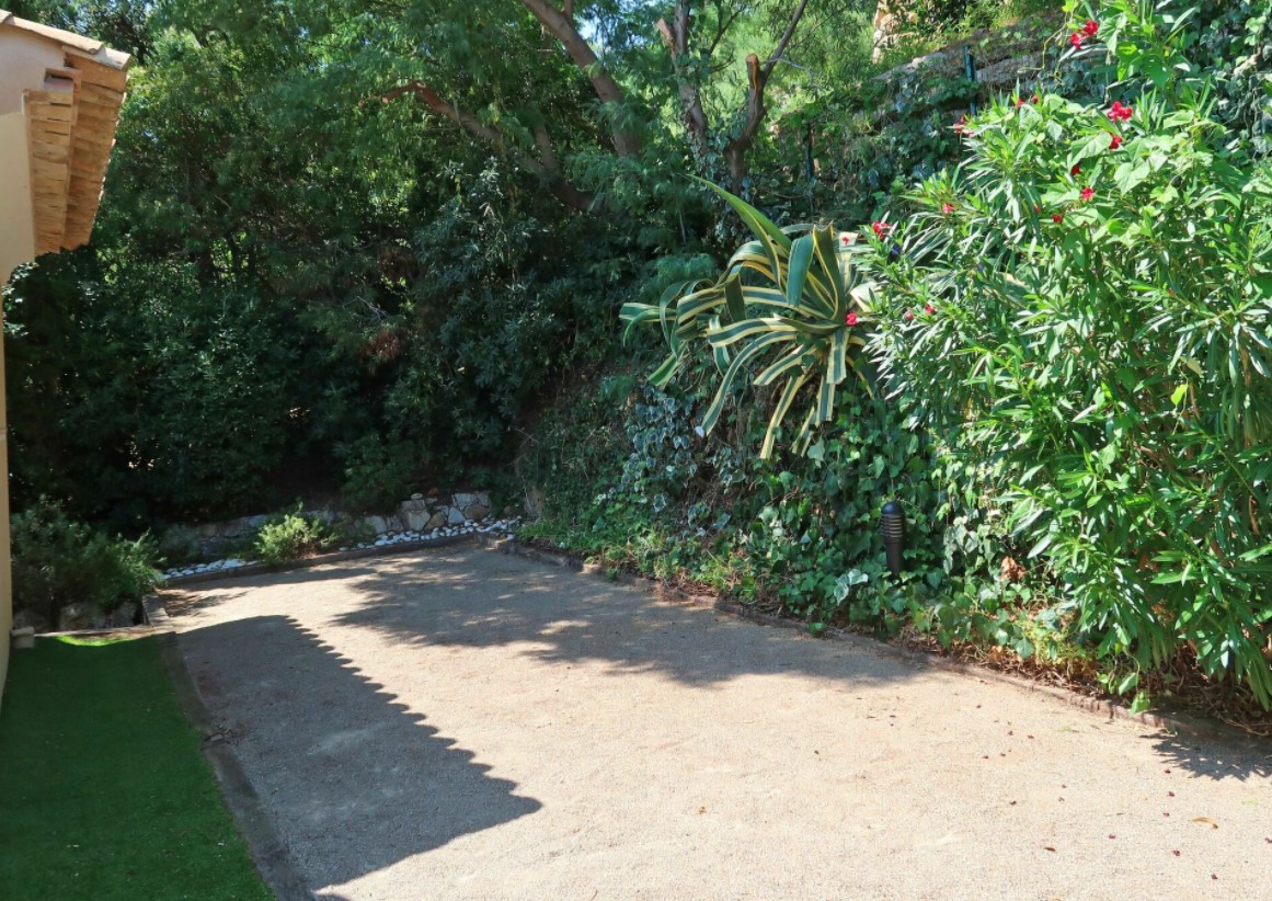 En fait, cette villa de vacances possède un beau jardin de 1550 m² et une piscine au sel de 12 M X 5 M avec alarme, face à la mer. De plus, une douche extérieure très pratique pour se rincer et un terrain de jeux de boules pour les parties de pétanques à l’heure de l’apéritif.