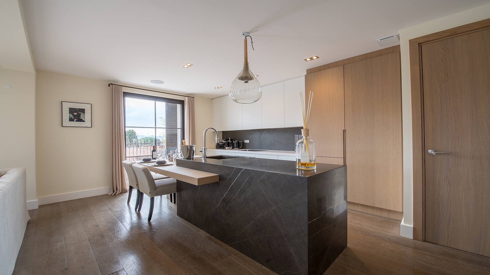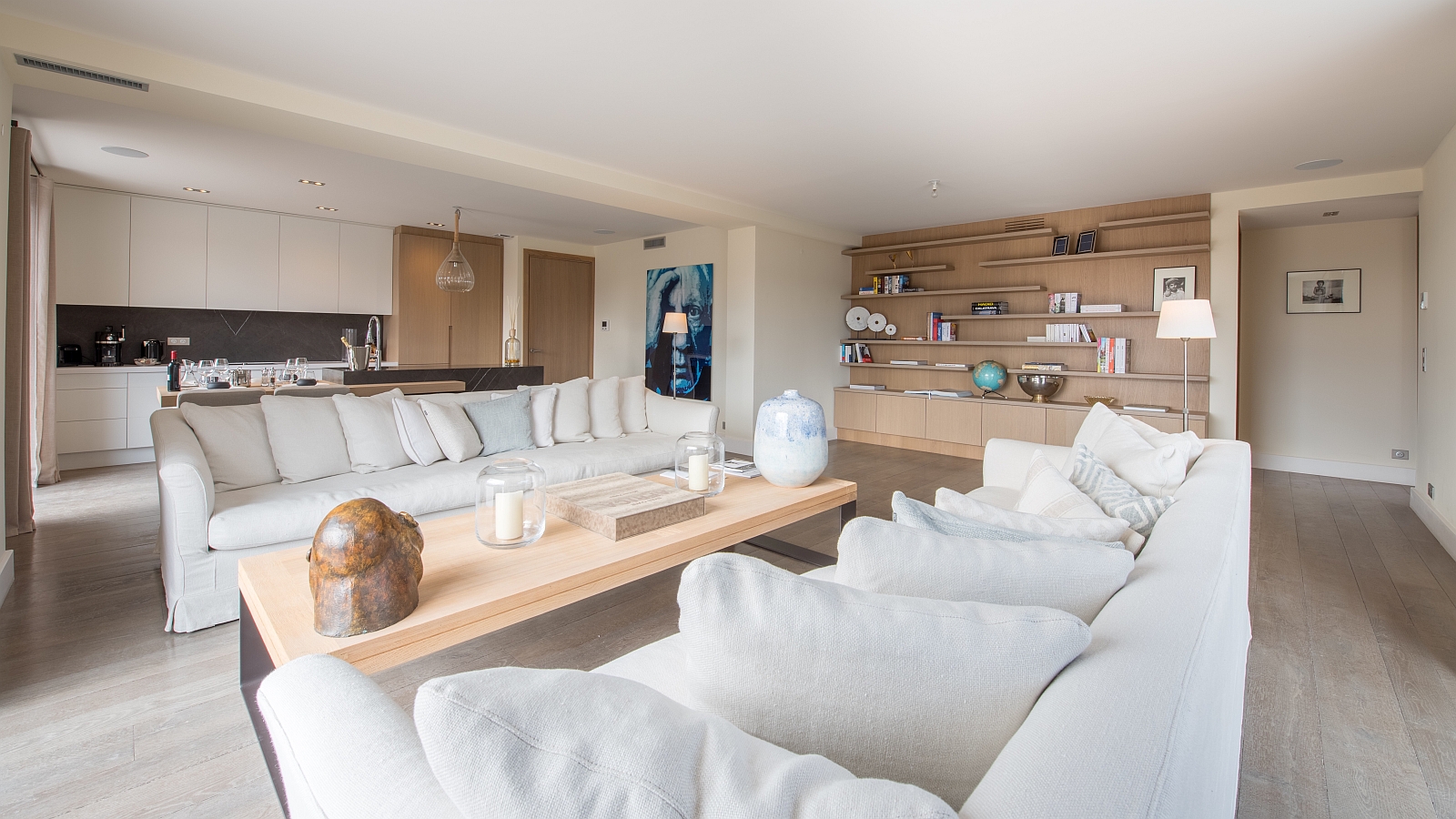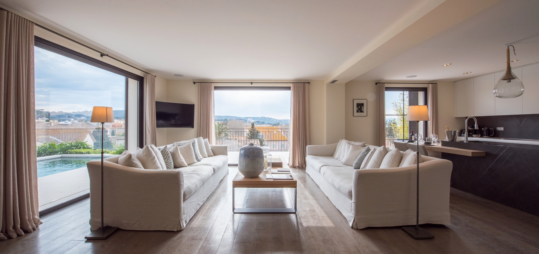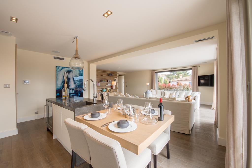 Premier étage/grand salon avec portes coulissantes donnant sur les terrasses (couvertes), cuisine ouverte avec bar.