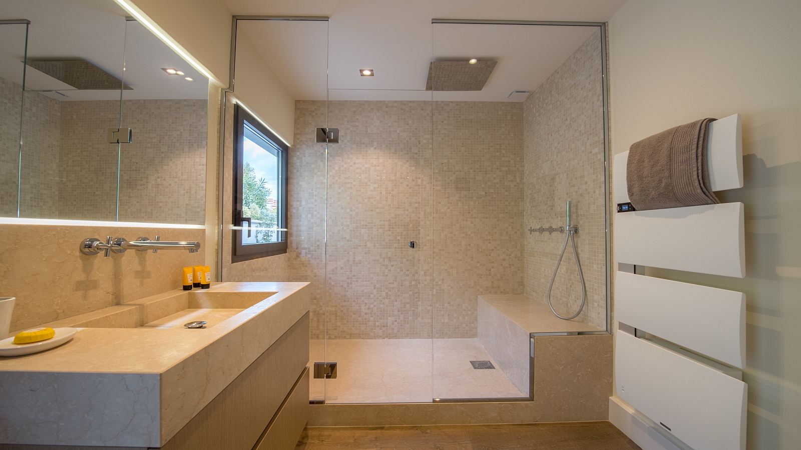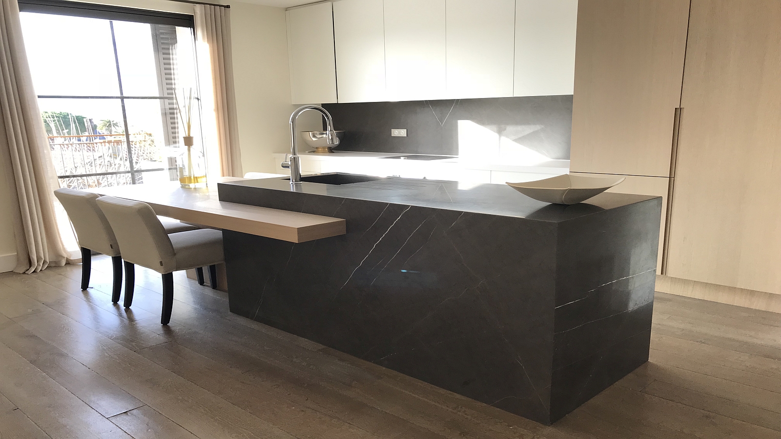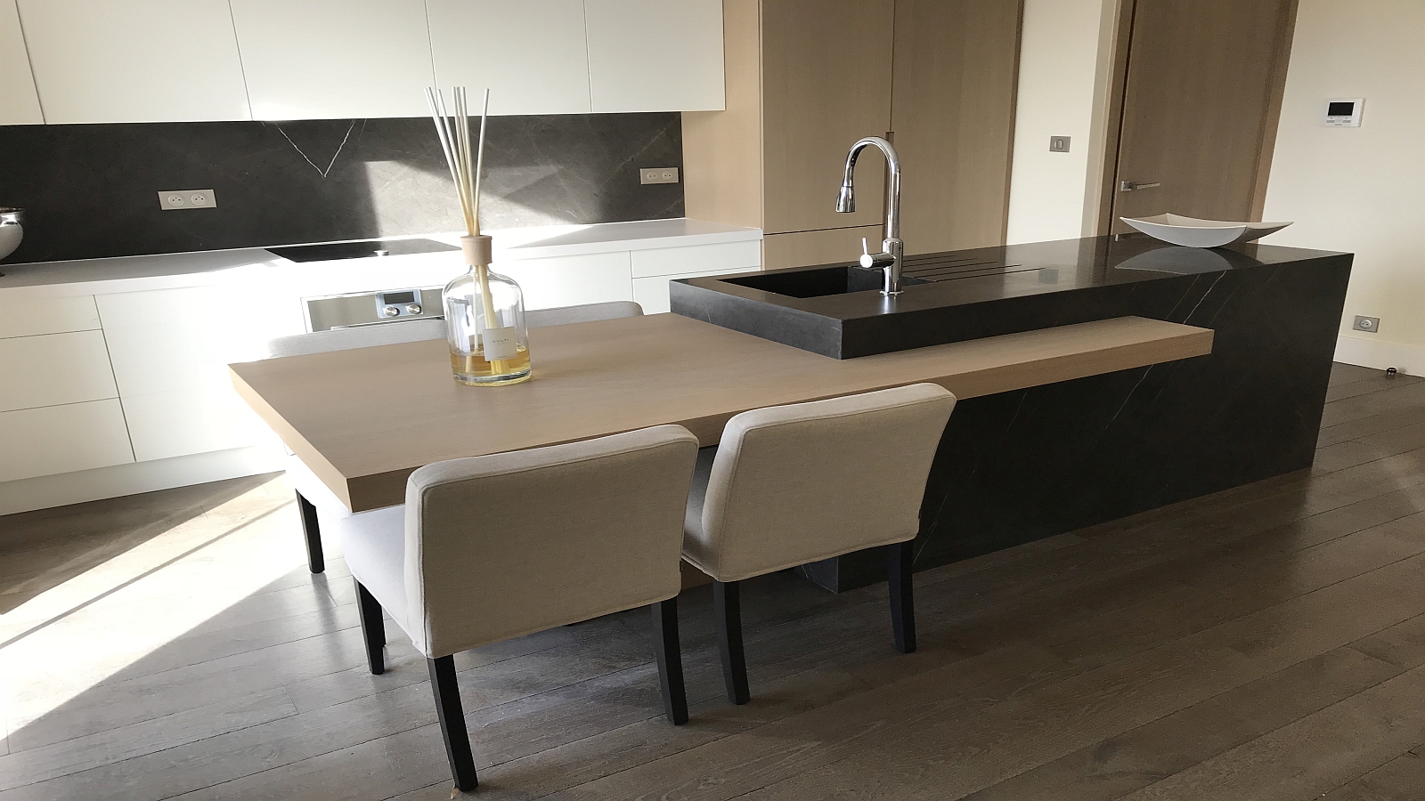 Premier étage/grand salon avec portes coulissantes donnant sur les terrasses (couvertes), cuisine ouverte avec bar.
